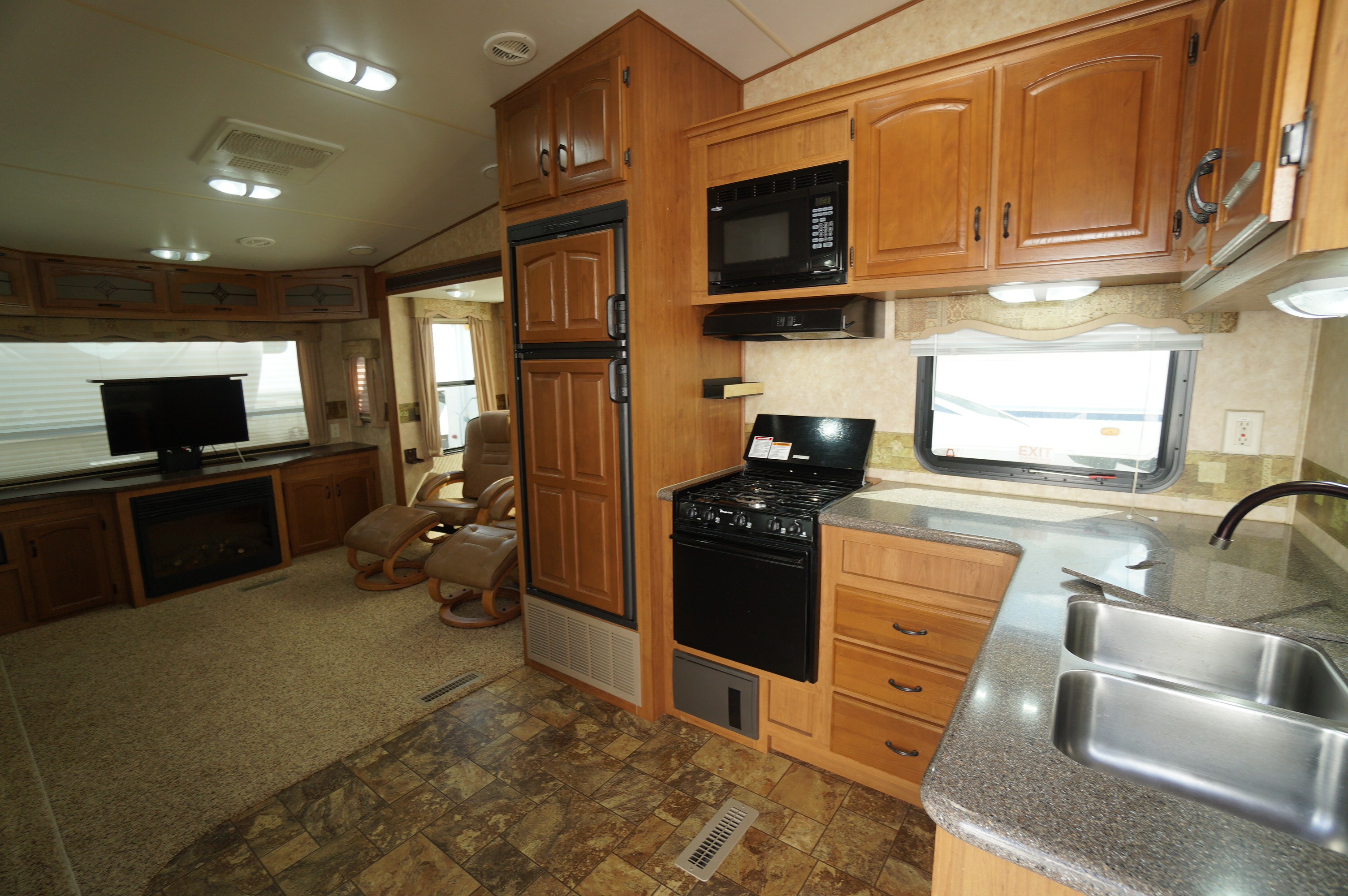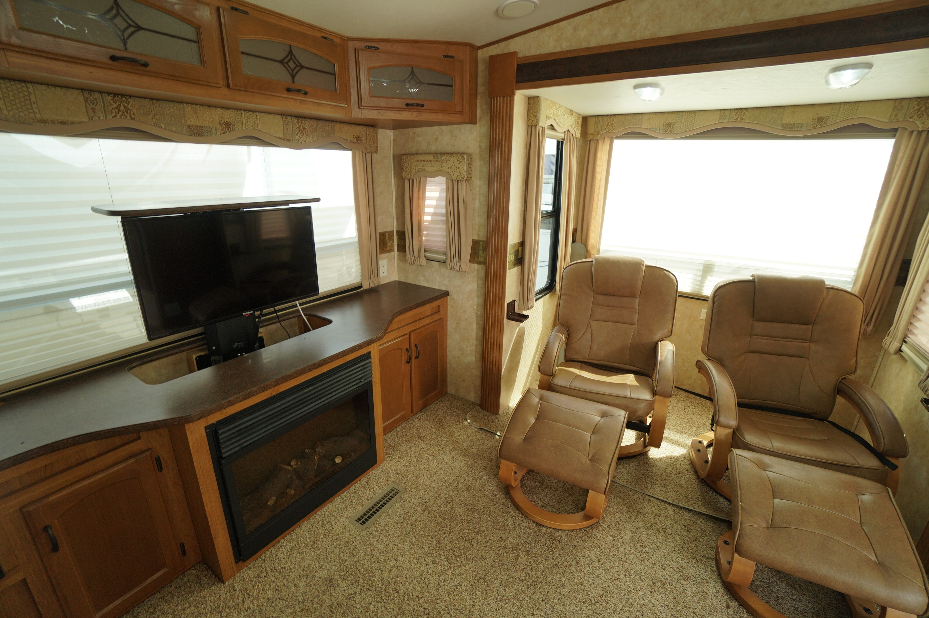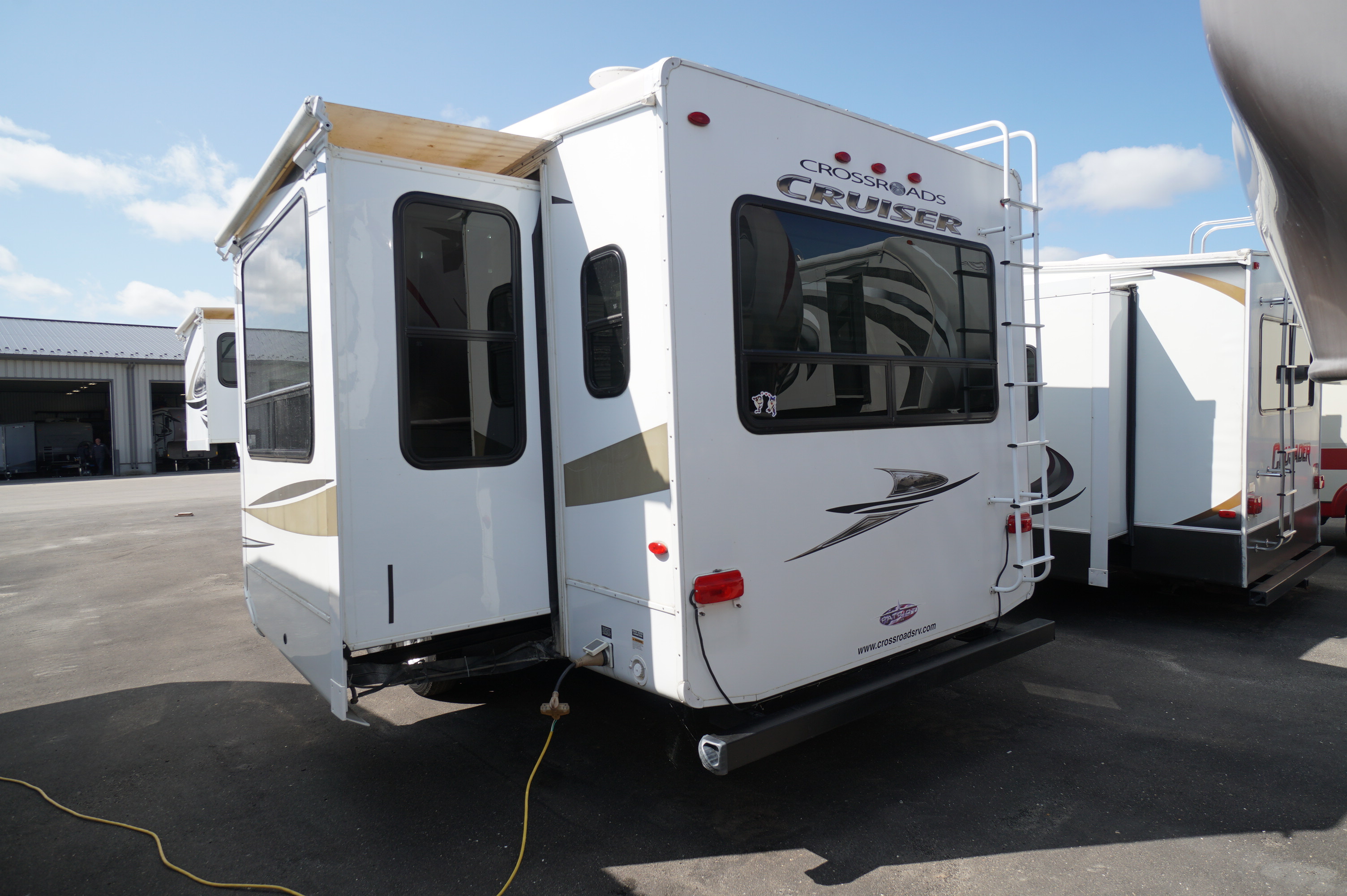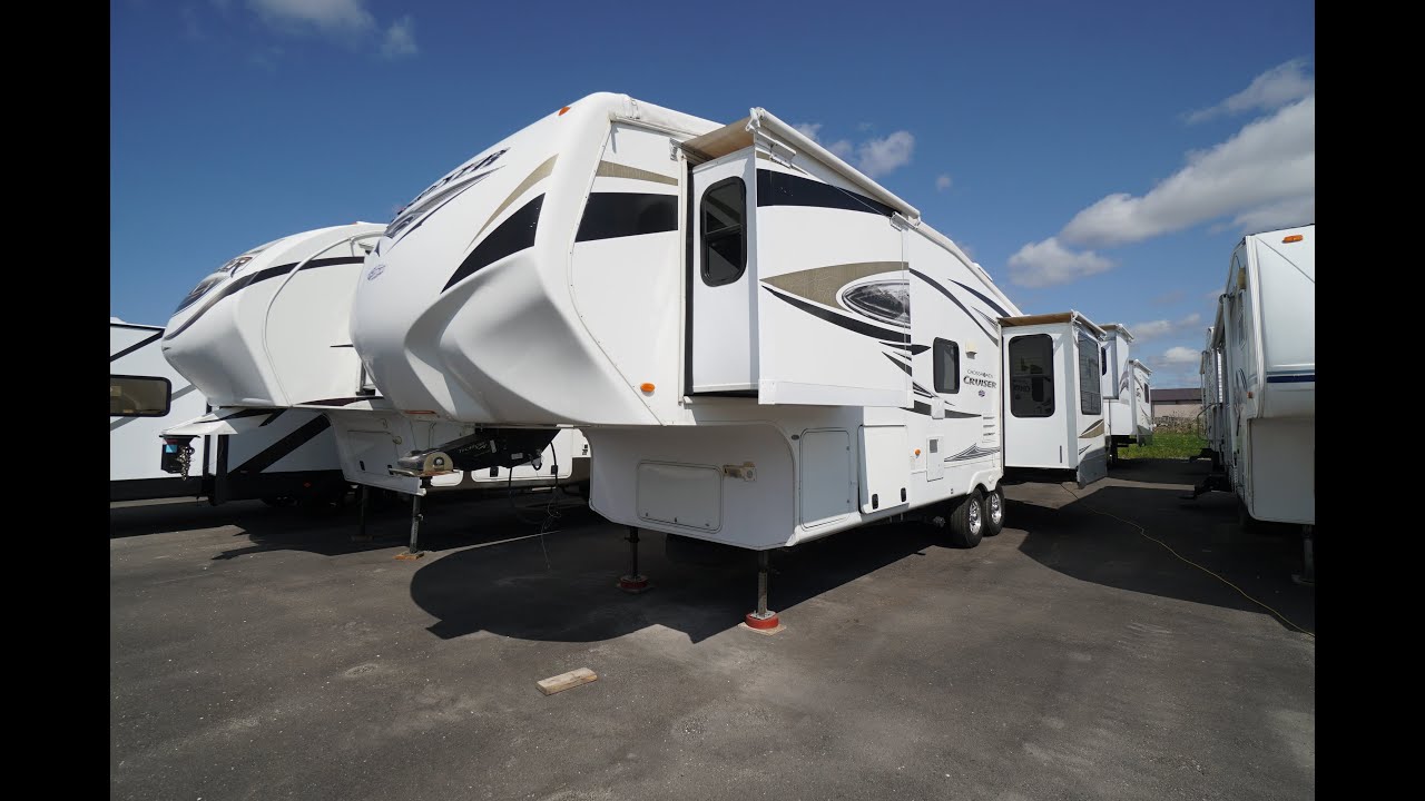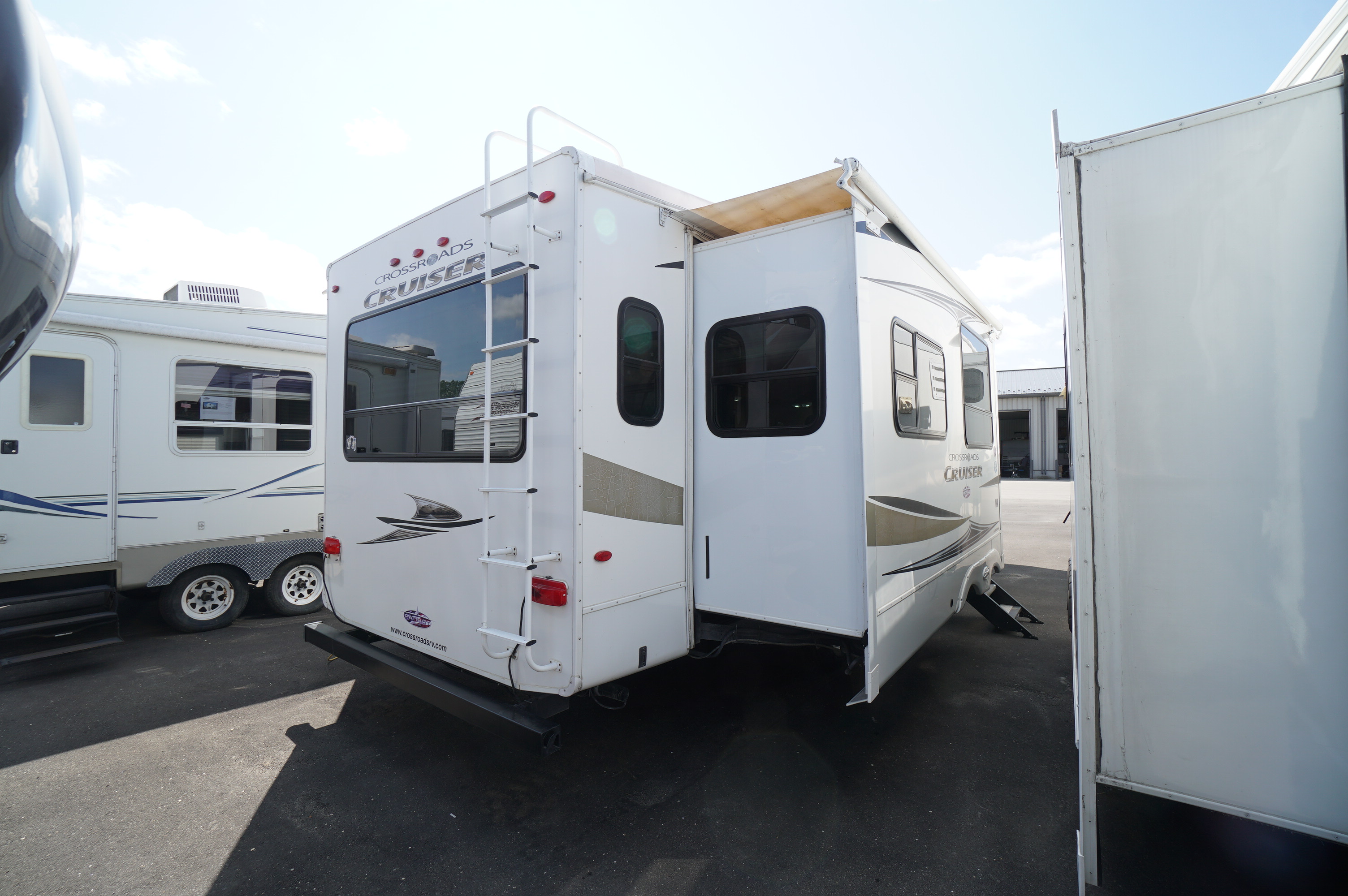 3 slide 2011 Crossroads Cruiser 315RE rear living couples 5th wheel RV trailer. Good condition RV that shows well. Roomy living area. Triple slideout, all with slide topper awnings. Ceiling and walls look good. Fiberglass and decals look good. No damage, and with all appliances working properly. Selling tested and guaranteed. Two facing rear slideouts for a spacious living room that has two swivel lounge chairs with footstools on one side of the living area, and a pull out sofa bed on the other. 4 padded chairs around the dining table. Fireplace with large rear window above it, and a power pop up TV. Light neutral tones interior. 2 way propane and electric fridge and freezer. 3 burner stove top with oven below. Microwave. Solid surface counter tops and sink covers over a two bowl stainless sink. 3 storage drawers, and overhead storage cabinets. Your third slide is the bedroom slideout which is a proper head of the bed slideout, for a walk around bedroom with large front walk in closet. Upgraded mattress. Washroom with glass door corner shower, with skylight. Mirror door medicine cabinet above the sink. 32 feet 10" over all length. Dry weight of 9206 lbs. Come check out this good quality 5th wheel. Finance plans are available, and trade ins are accepted. For a full walk through video, copy and paste the following link: https://www.youtube.com/watch?v=bgnreT_s2bQ