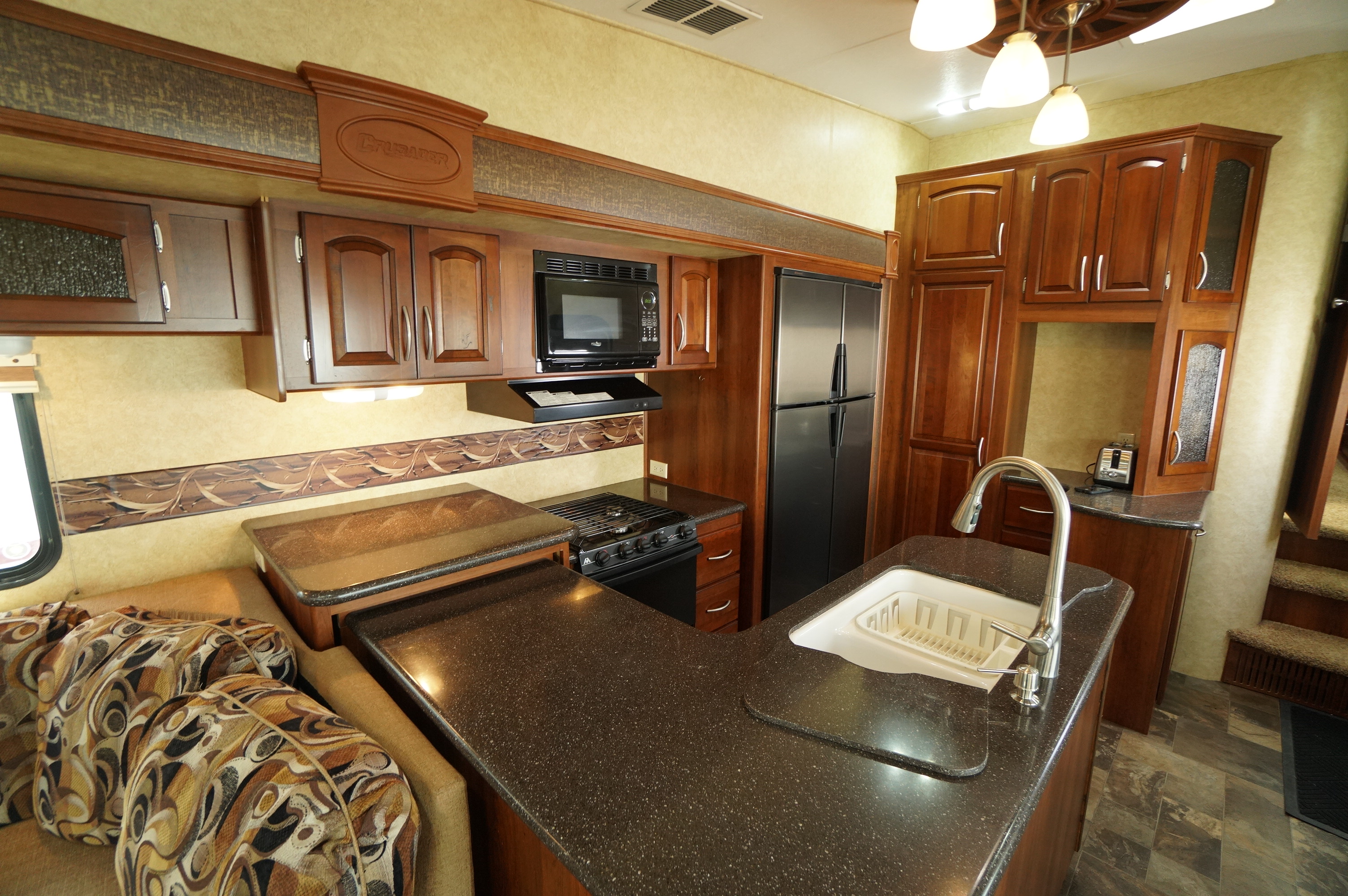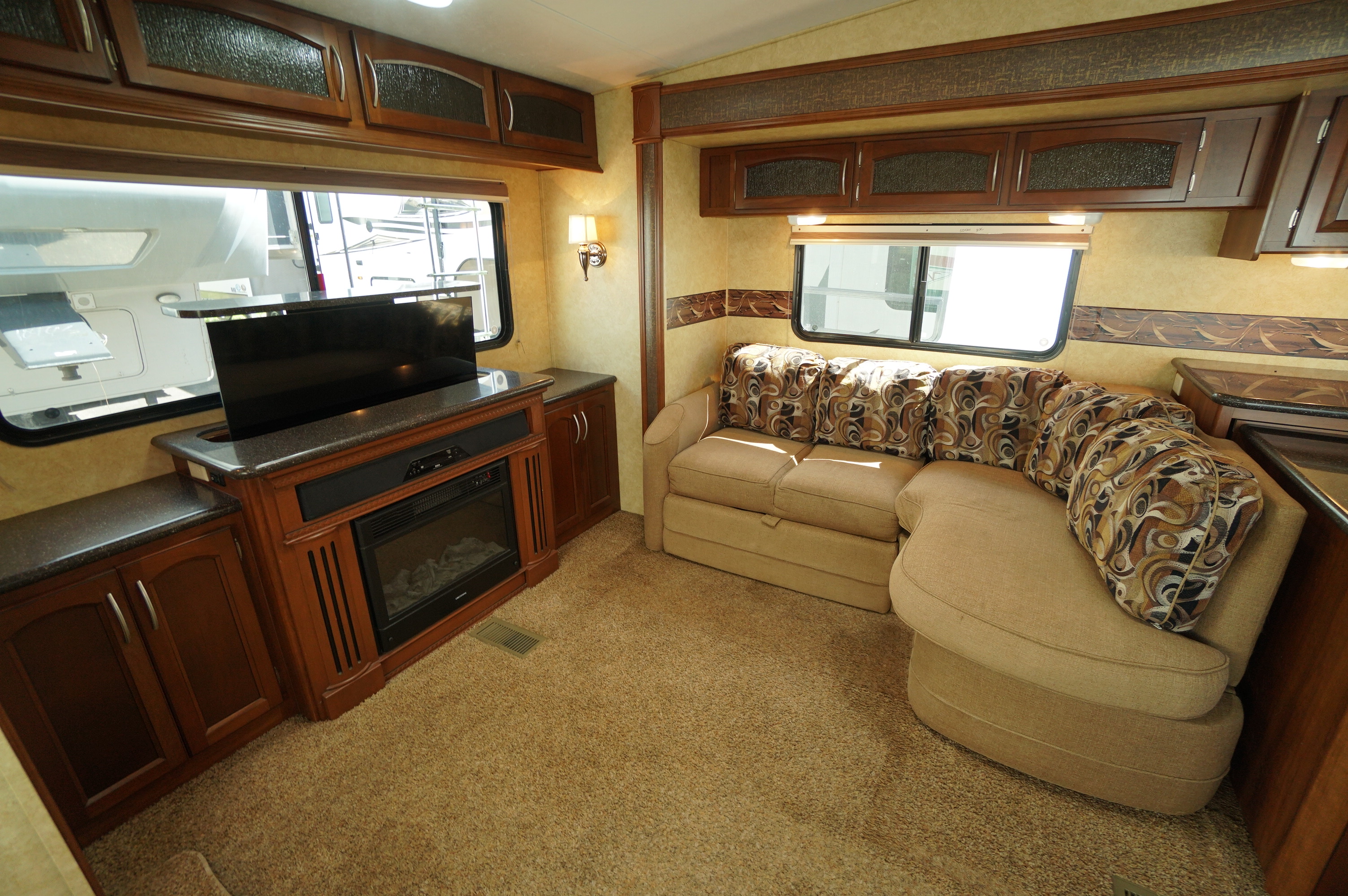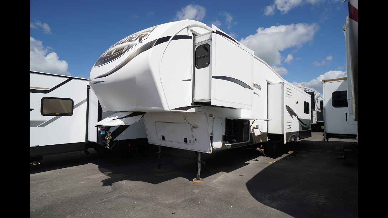 Triple slideout Couples 5th wheel layout. This 2012 Crusader 325RES is roomy for camping, or a great layout for a seasonal site. Good looking trailer on the inside, but with a little delamination of fiberglass on the outside. This RV is being sold with all appliances guaranteed working, and with seals all checked and guaranteed no current water leaks. Some accessories included like the sewer hose holders for permanent set up, power cord, extension cord, etc. Lots of windows around the back in the living room area. Large 4 door fridge and freezer. L shaped island style kitchen maximizes your work surface area. Solid surface counter tops. Handy end wall hutch and buffet for lots of storage and a great spot for small appliances. Solid surface sink covers over a double bowl sink. 4 person dinette with 4 padded chairs. There is one couch missing, but that allows you to put in a piece of furniture of your choice. TV and Fireplace on the back wall. You still have a 3 person L shaped sofa bed in the living room as well. You need to supply your own air mattress for this sofa bed. Roomy front bedroom with walk in closet. Large sliding glass door shower with seat. This is a 35.5 foot layout, weighing 10,337 lbs dryweight. Come check it out at Longhaul in Listowel! Financing is available and trade ins are accepted. For a full walk through video, check the following link: https://www.youtube.com/watch?v=1YtUHYVgzJg