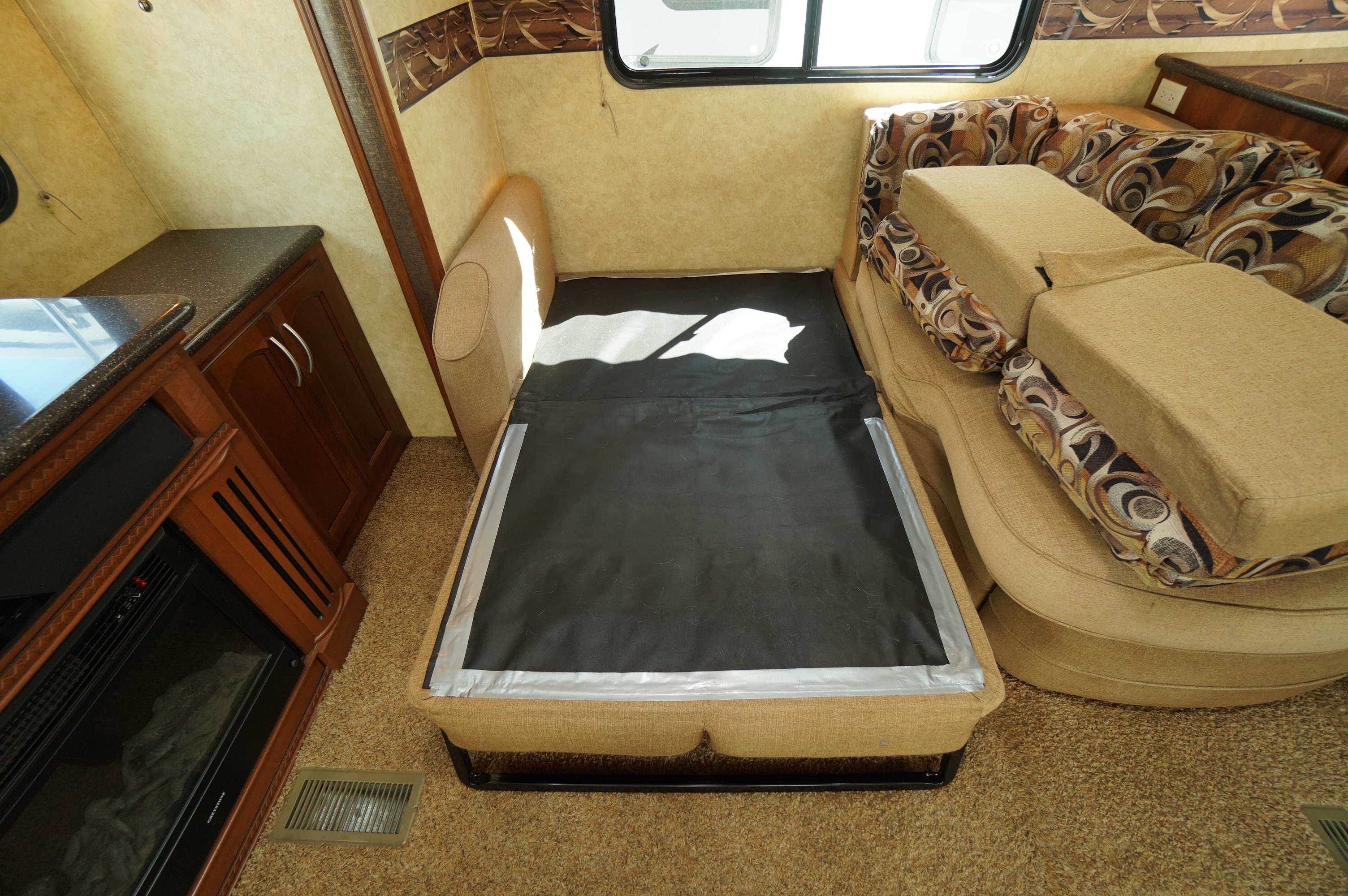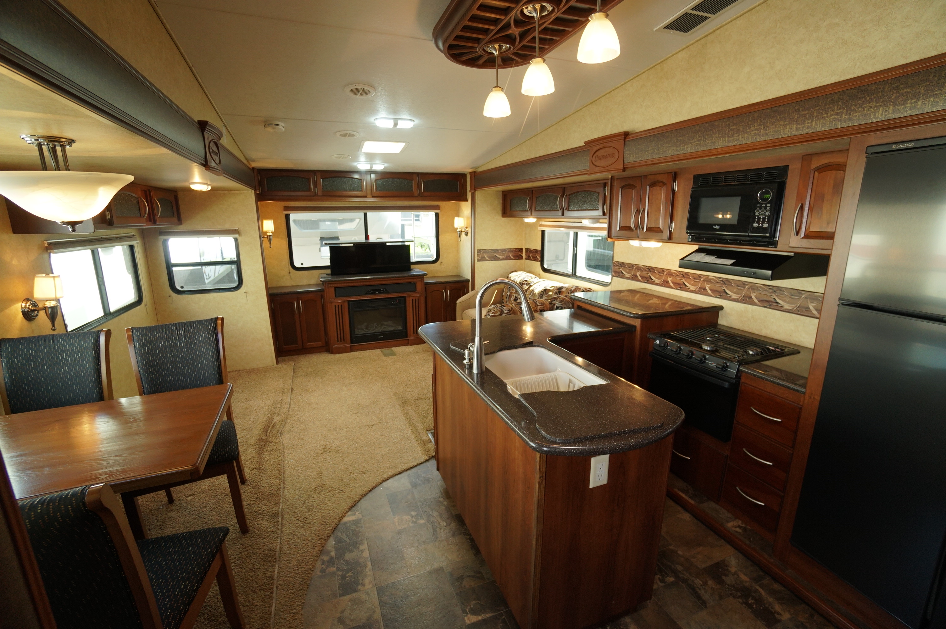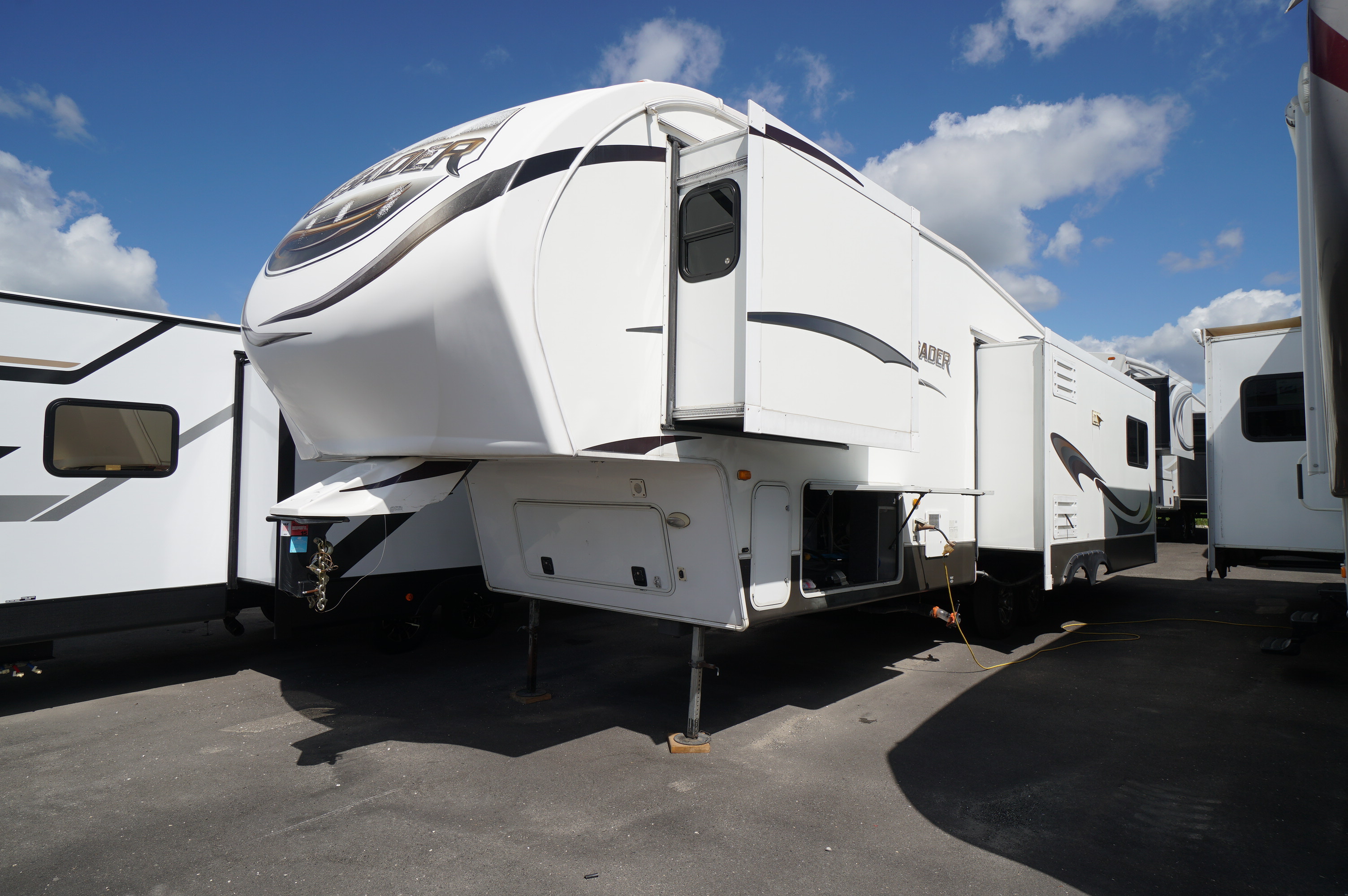 Triple slideout Couples 5th wheel layout. This 2012 Crusader 325RES is roomy for camping, or a great layout for a seasonal site. Good looking trailer on the inside, but with a little delamination of fiberglass on the outside. This RV is being sold with all appliances guaranteed working, and with seals all checked and guaranteed no current water leaks. Some accessories included like the sewer hose holders for permanent set up, power cord, extension cord, etc. Lots of windows around the back in the living room area. Large 4 door fridge and freezer. L shaped island style kitchen maximizes your work surface area. Solid surface counter tops. Handy end wall hutch and buffet for lots of storage and a great spot for small appliances. Solid surface sink covers over a double bowl sink. 4 person dinette with 4 padded chairs. There is one couch missing, but that allows you to put in a piece of furniture of your choice. TV and Fireplace on the back wall. You still have a 3 person L shaped sofa bed in the living room as well. You need to supply your own air mattress for this sofa bed. Roomy front bedroom with walk in closet. Large sliding glass door shower with seat. This is a 35.5 foot layout, weighing 10,337 lbs dryweight. Come check it out at Longhaul in Listowel! Financing is available and trade ins are accepted. For a full walk through video, check the following link: https://www.youtube.com/watch?v=1YtUHYVgzJg