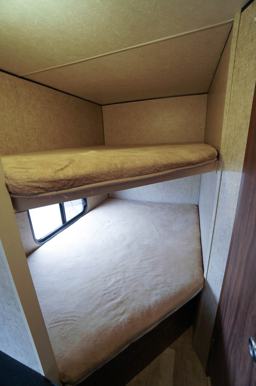 A well priced, good condition, family camper with rear double over double bunks, a dinette plus a couch, and a private front walk around bedroom. Power tongue jack, power awning, covered propane tanks, large front pass through storage area. Exterior looks good without any dings or damages. We'll give it a good cleaning before you get it, and we'll test all appliances, and pressure test the water and propane systems. We'll guarantee all is in proper working order. Its a great starter camper for any young family! 4710 lbs dry weight.