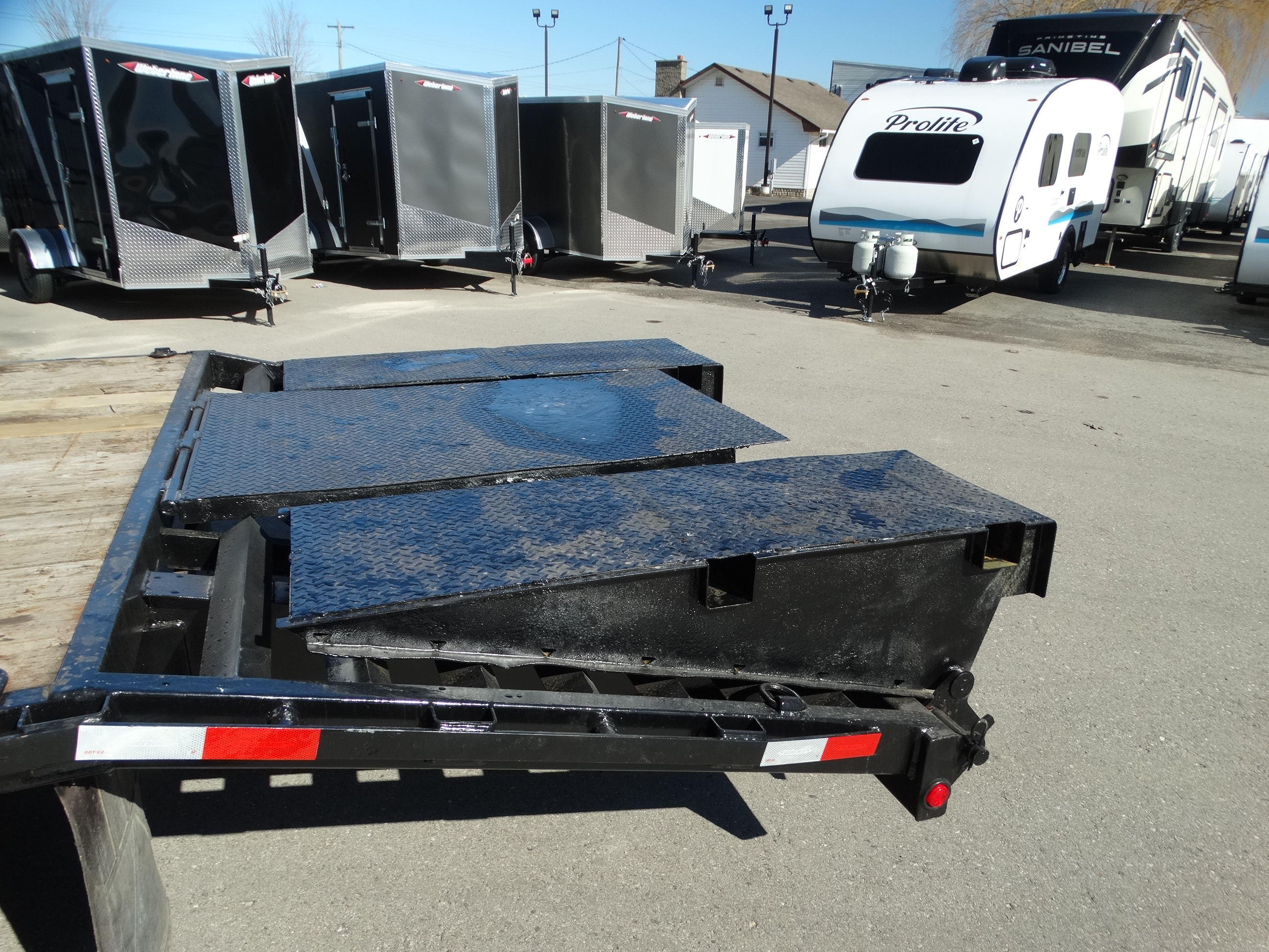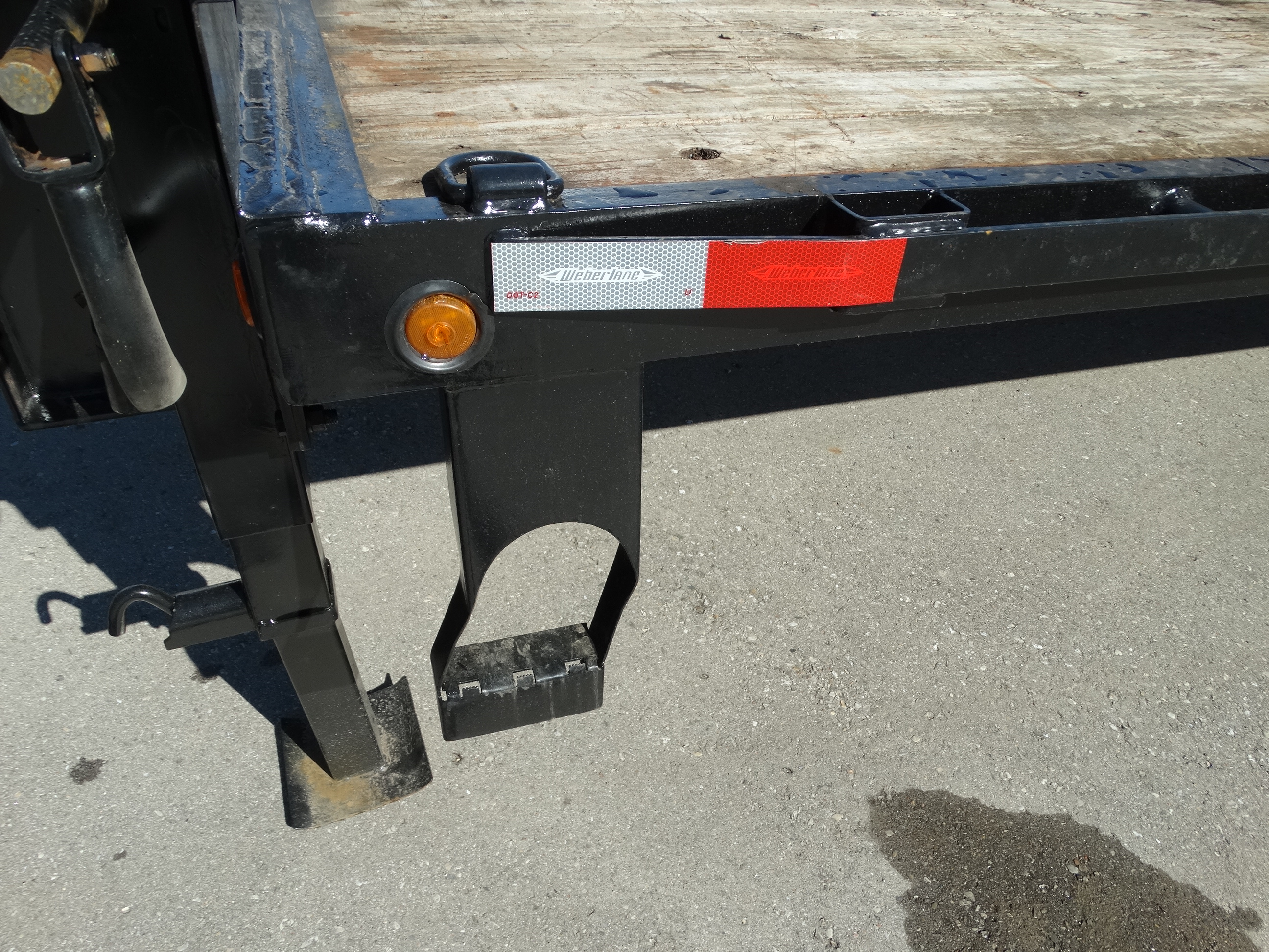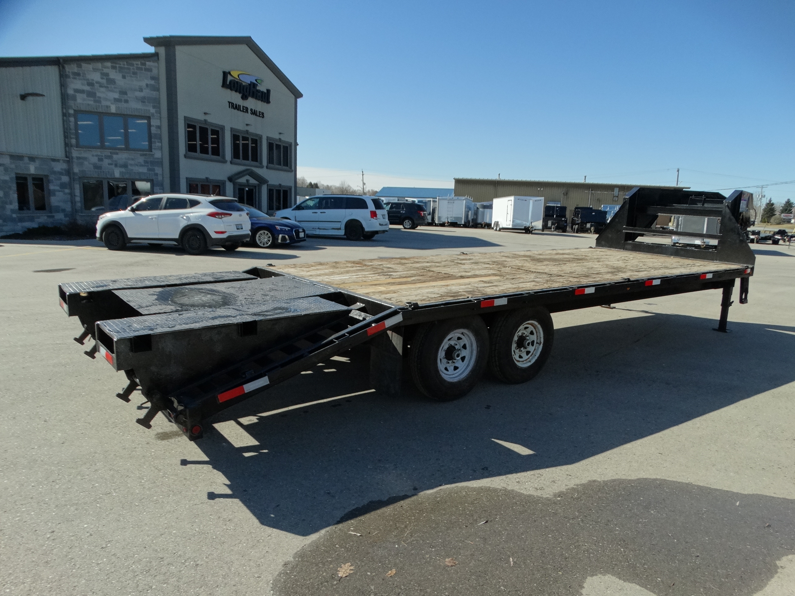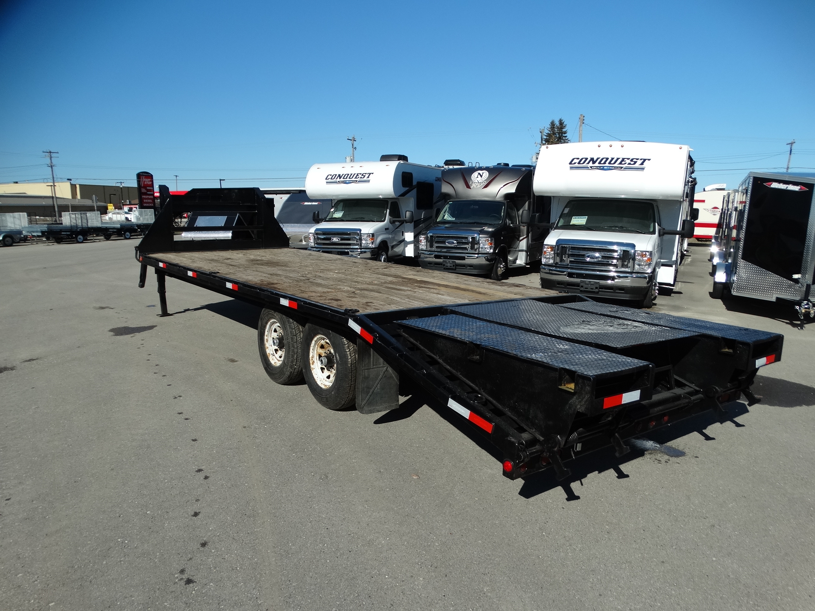 Come check out this gooseneck deckover trailer. It has a 20' deck plus a 5' beavertail with fold over ramps. It has tandem 7000 lb axles with electric brakes and a payload of 9300 lbs. It has a step on either side for easy access, as well a front tool box, d-rings and safety chains. It comes fully safetied and ready to go! Come take a look!