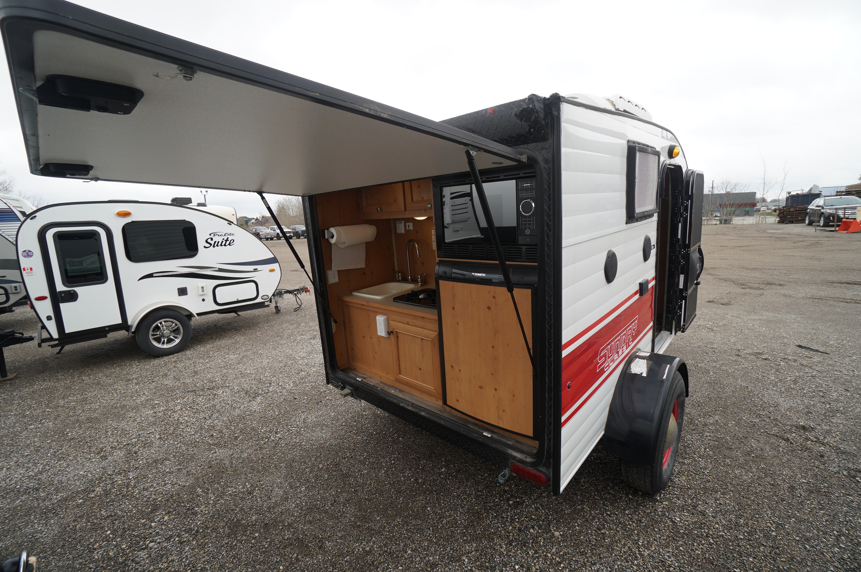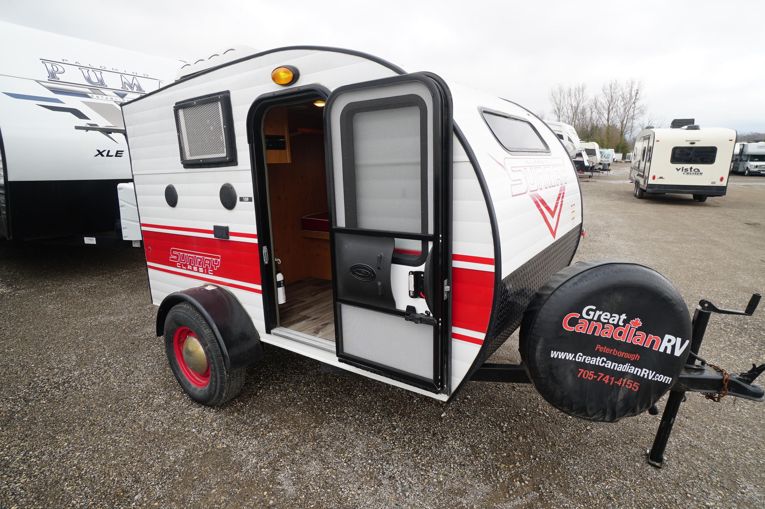 Simple and solid get away camper trailer at a great price! Come check out this 109 Sunray floorplan. Good condition. All working properly on it. 1320 lb dry weight and a length of 12 feet. Inside it has a bench that converts to a bed in nice retro red colours and woody panelling, propane furnace, air conditioning, and some power outlets in 110v and 12v. Rear kitchen with microwave, sink, 2 burner propane cook top, and a 2 way propane and electric fridge and freezer. Outdoor shower, tongue mounted battery, propane tank and spare tire. All for Only $6500! Imagine your super low payments if you want to finance that one! Trade ins are accepted, financing is available. Come check it out at Longhaul in Listowel or check this video link: https://www.youtube.com/watch?v=LnbFpkvy8PQ