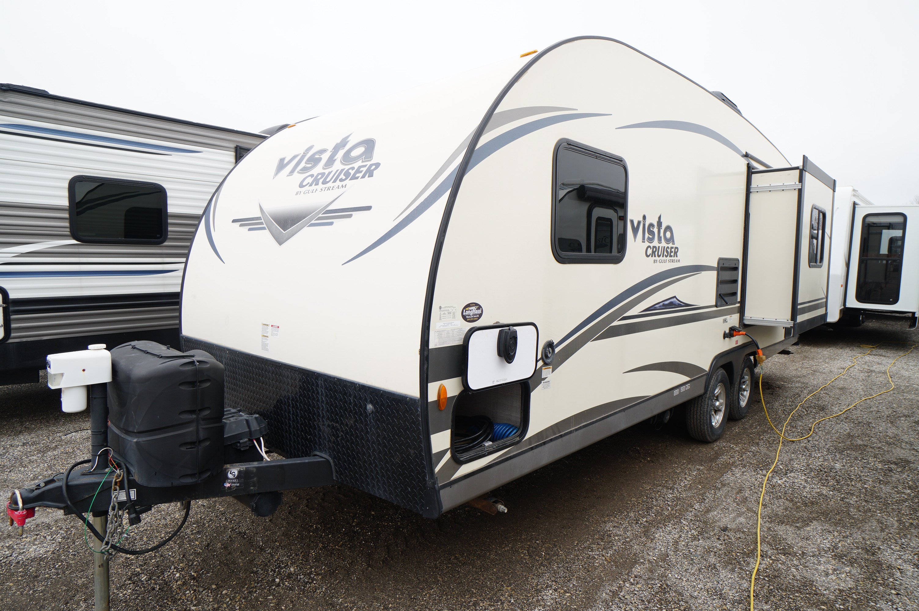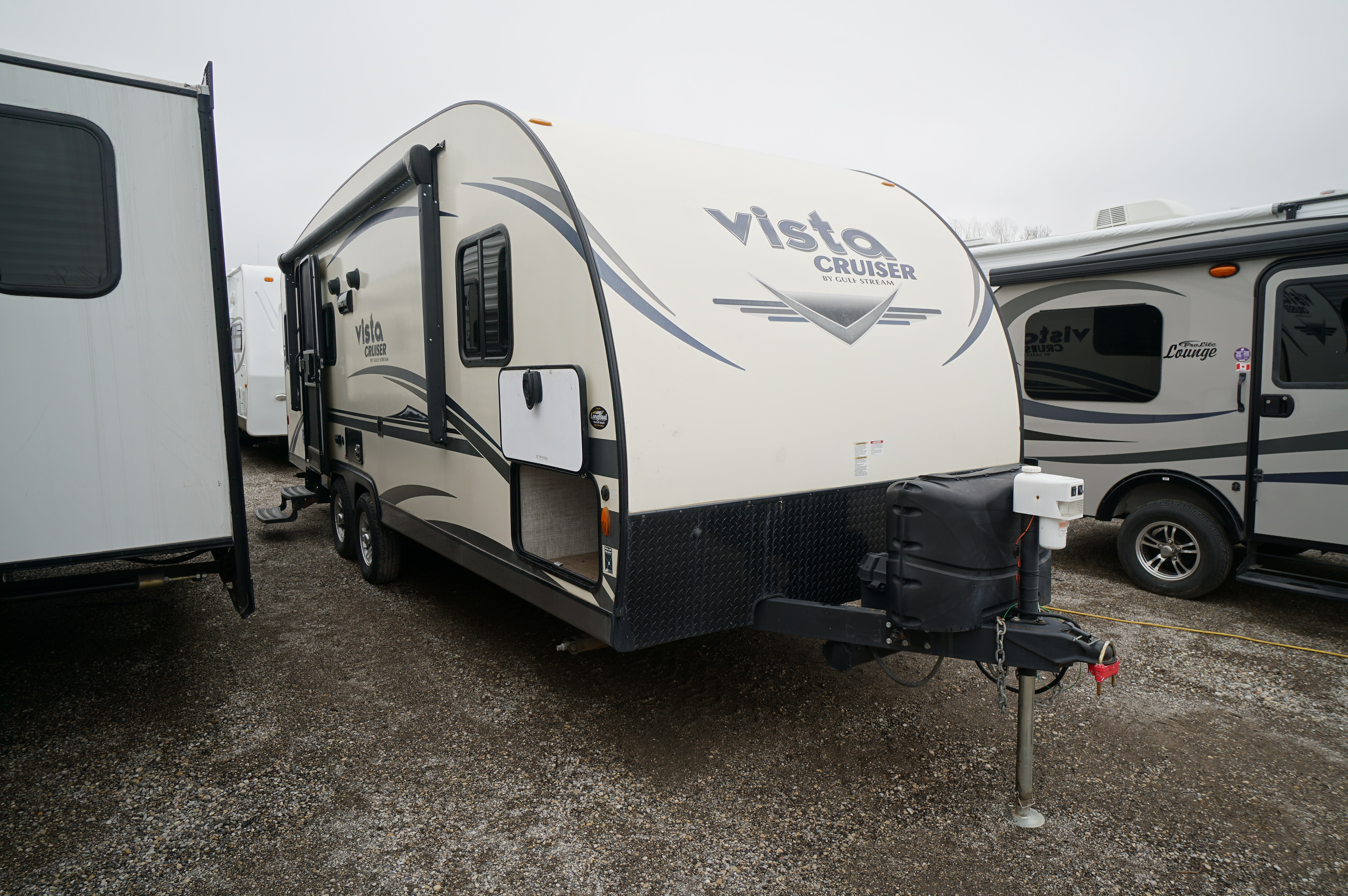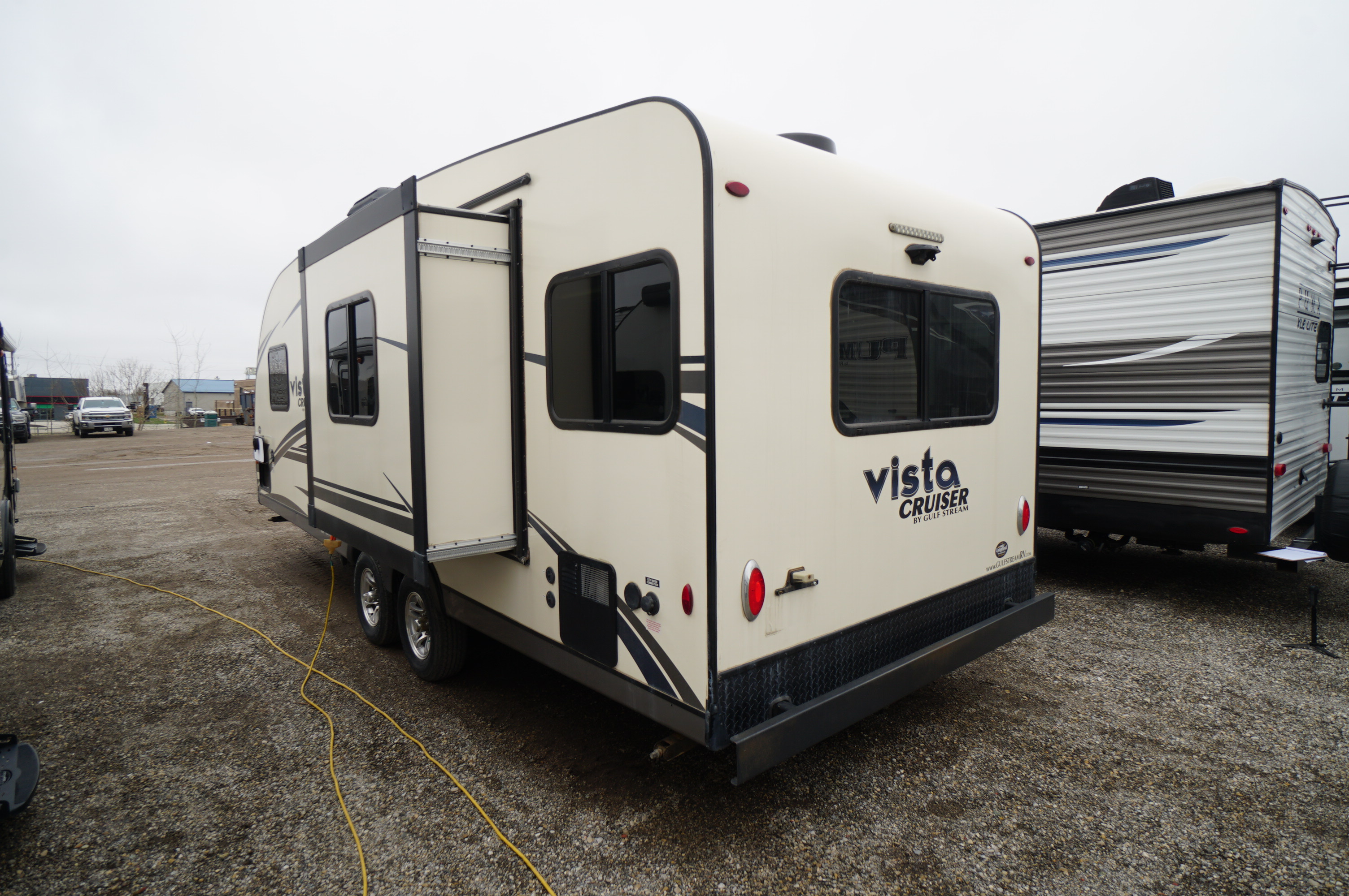 Easy towing great floorplan! Come check out the low stance, narrow floorplan, and low roof line of these Vista Cruisers. We are well stocked right now with various Vista floorplans in both new and used. Some of the great features are the one piece fiberglass front, roof and back. Rounded profiles for easy towing, and the narrower floorplans mean most people have no need for mirror extensions. The lower stance also hugs the road better, and that, coupled with this two axle floorplan, makes for a super easy trailing RV. It has a power tongue jack, slam latch baggage doors, covered propane tanks, power awning and front stone guard checkerplate. Nice bright interior. Rear 4 person dinette with windows on 3 sides. A comfy couch in the slideout that will fold out to a childs bed if needed, and a private queen bedroom up front. Its a great floorplan for a retired couple wanting to hit the road to adventure! Trade ins accepted. Financing is available! For a walk through video, copy and paste the following link: https://www.youtube.com/watch?v=1JIds3FMkUg