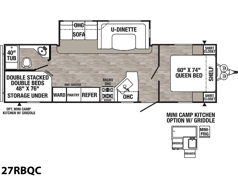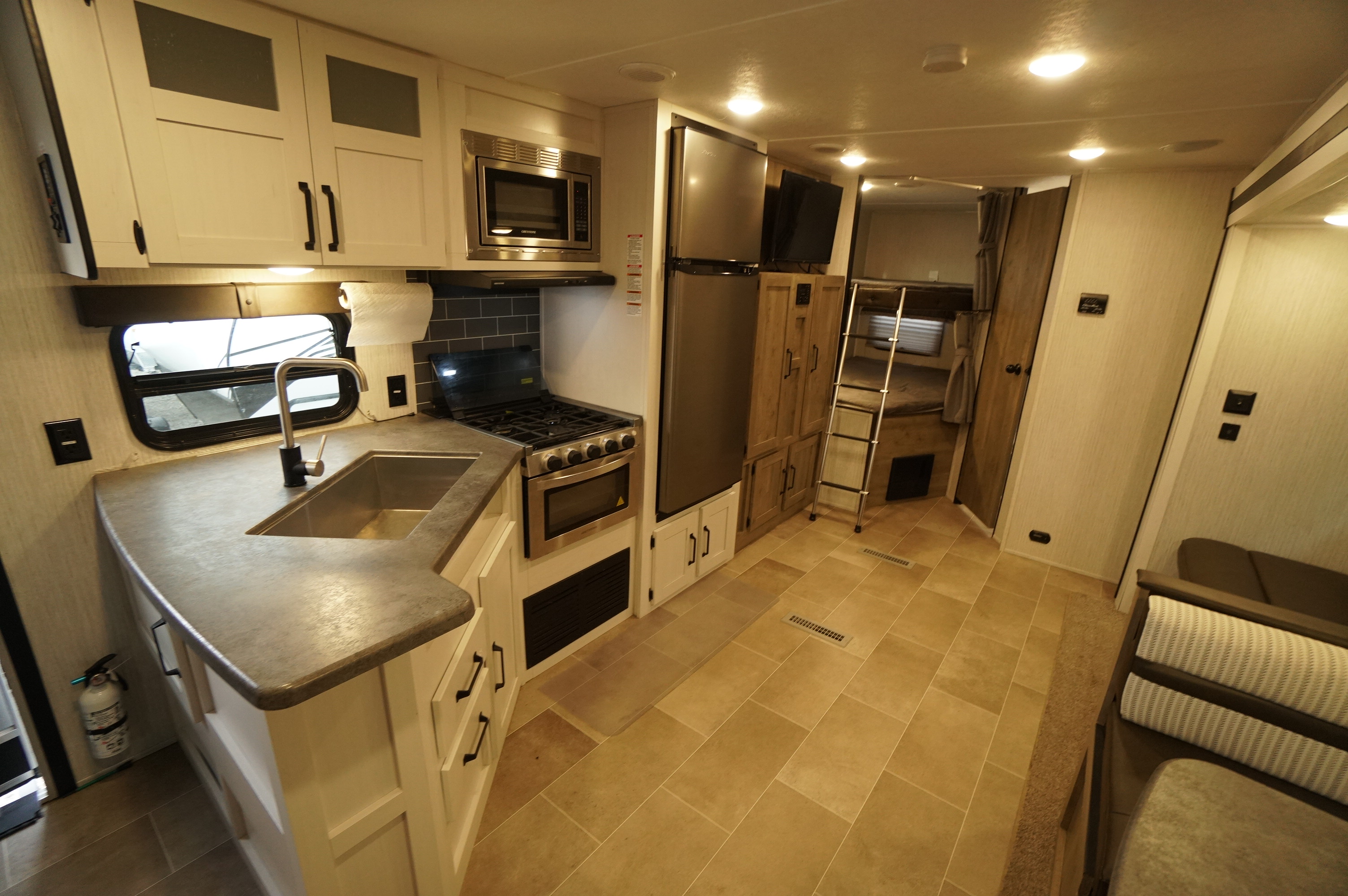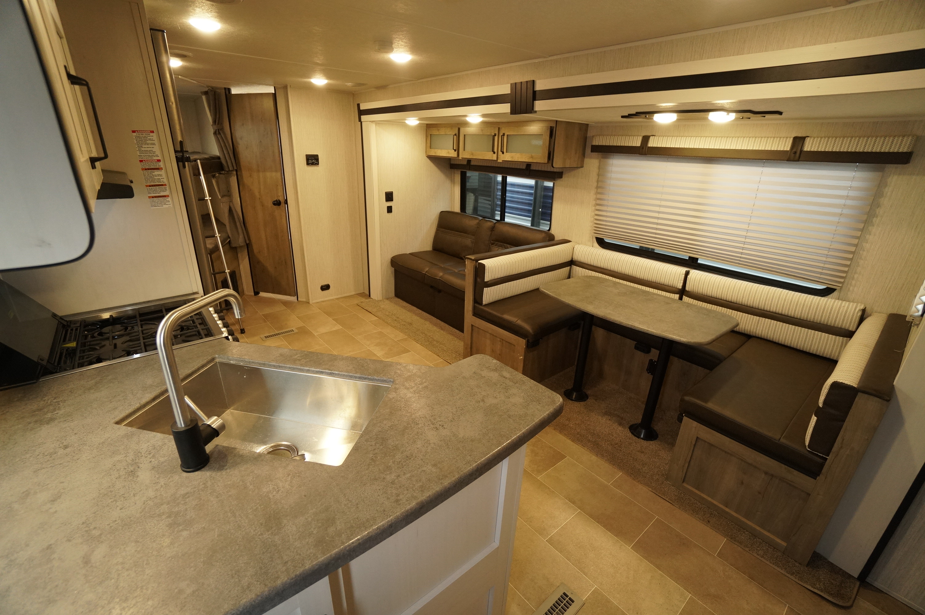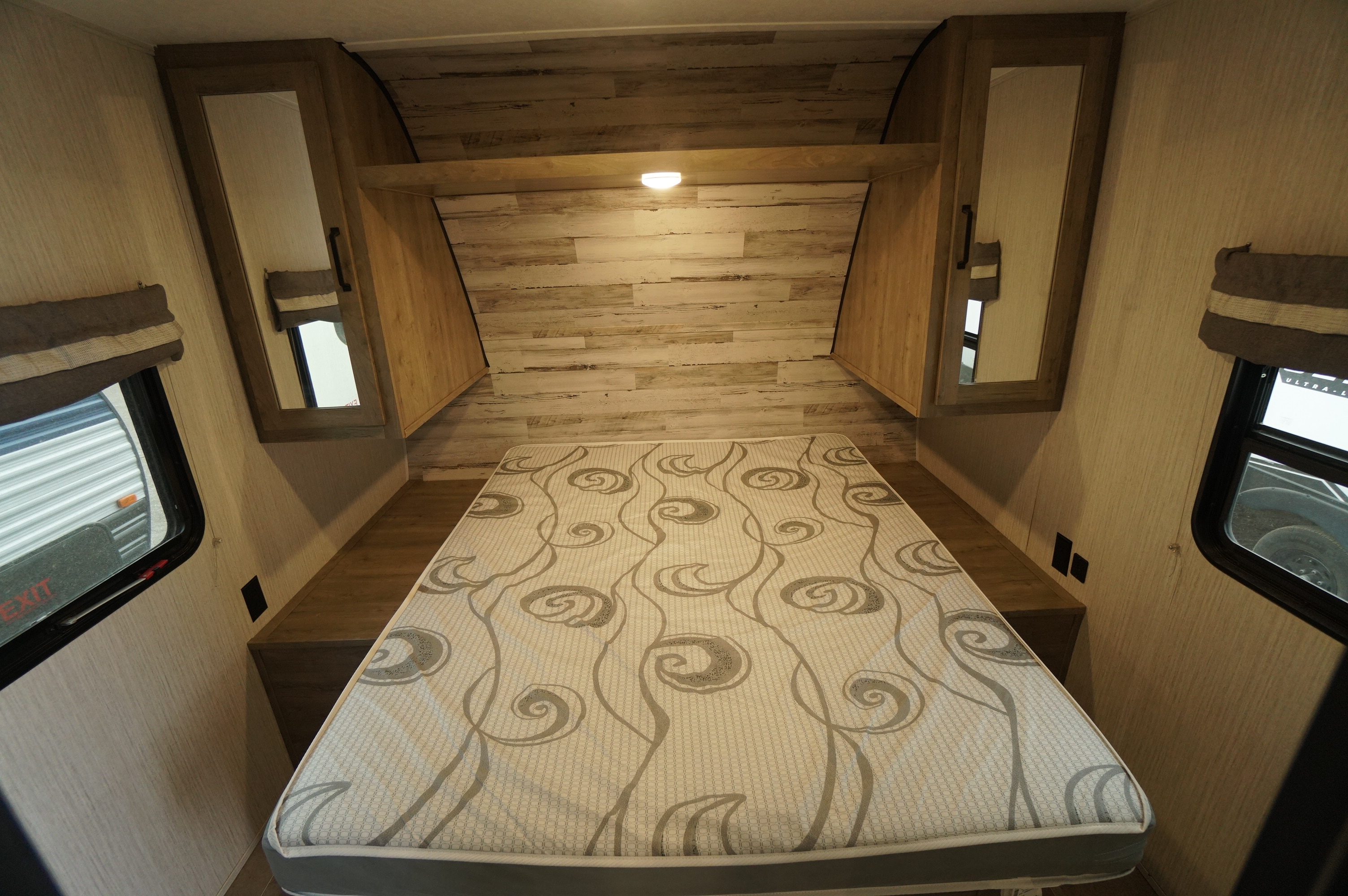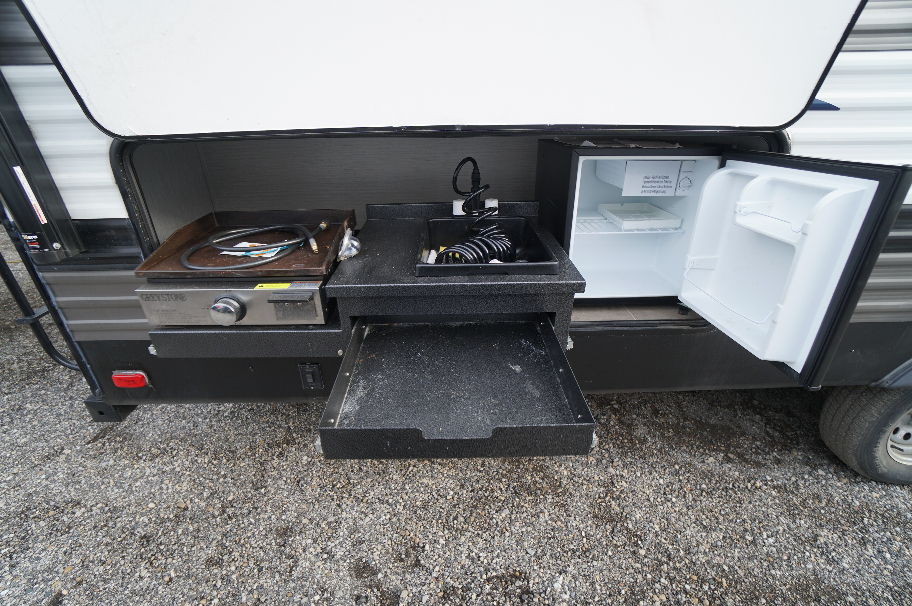 This family bunkie 27 foot Puma is loaded with creature comforts and is designed to offer the camping lifestyle at an affordable price. It’s a lighter weight trailer than most in its class, at 5933 lbs, and sleeps 8. These quality crafted campers feature solid I-beam frames, one-piece 5/8" floor decking, one-piece rubber roofs and large fresh water tanks. Get out there and prowl with the Puma XLE! Some neat features include the power tongue jack, power stabilizer jacks, solid fold away stairs, power awning with LED porch light strip, outdoor speakers, outdoor kitchen centre with griddle sink and fridge. Good sturdy slideout with the undermount push outs. Outdoor shower, rear mounted spare tire, rear ladder, prepped for a camera. Great floorplan for the family with a private front queen bedroom, living room with Large U shaped dinette and a couch, and rear corner bunks beside the washroom. Plenty of walk around space in the front queen bedroom.