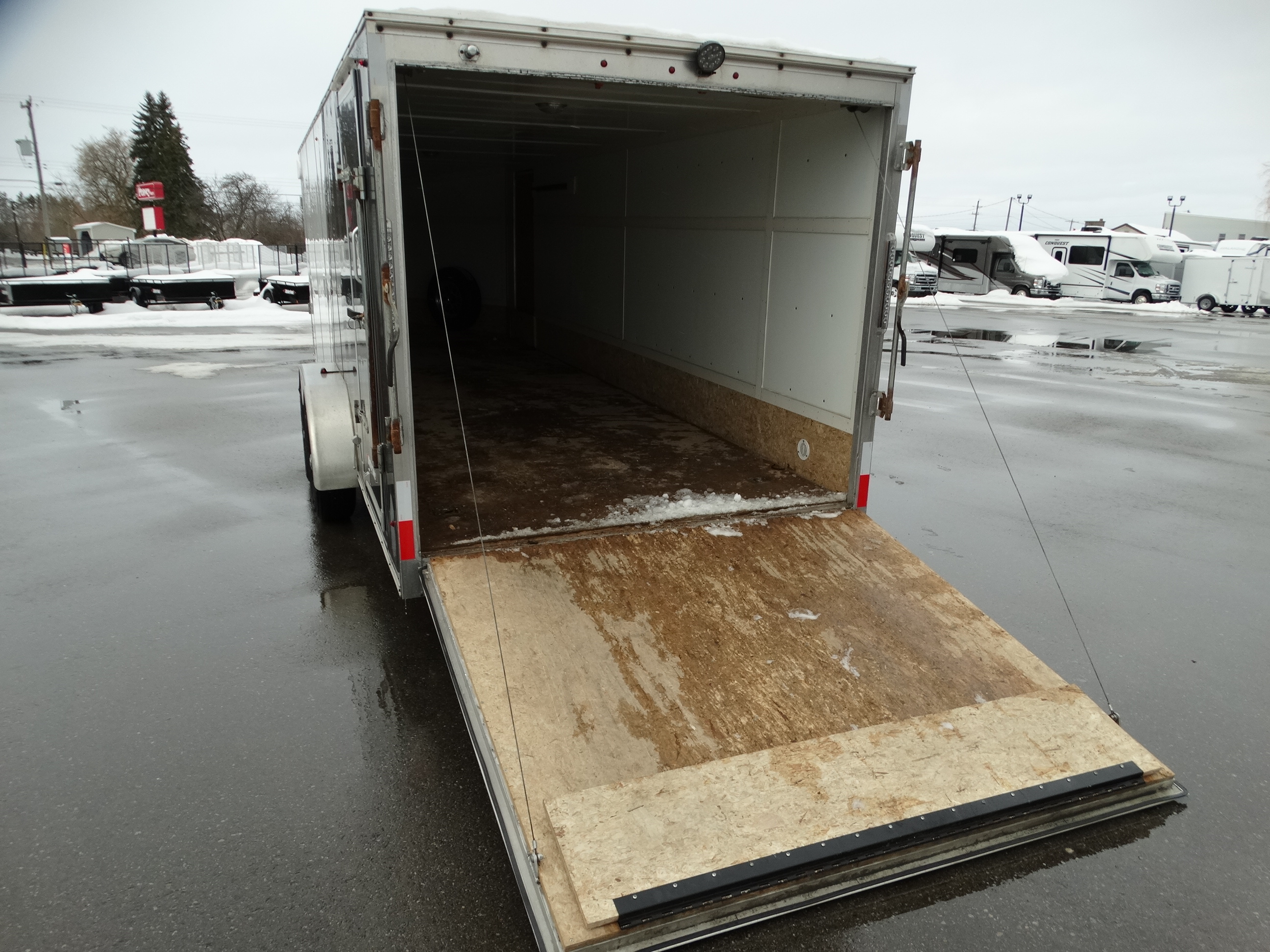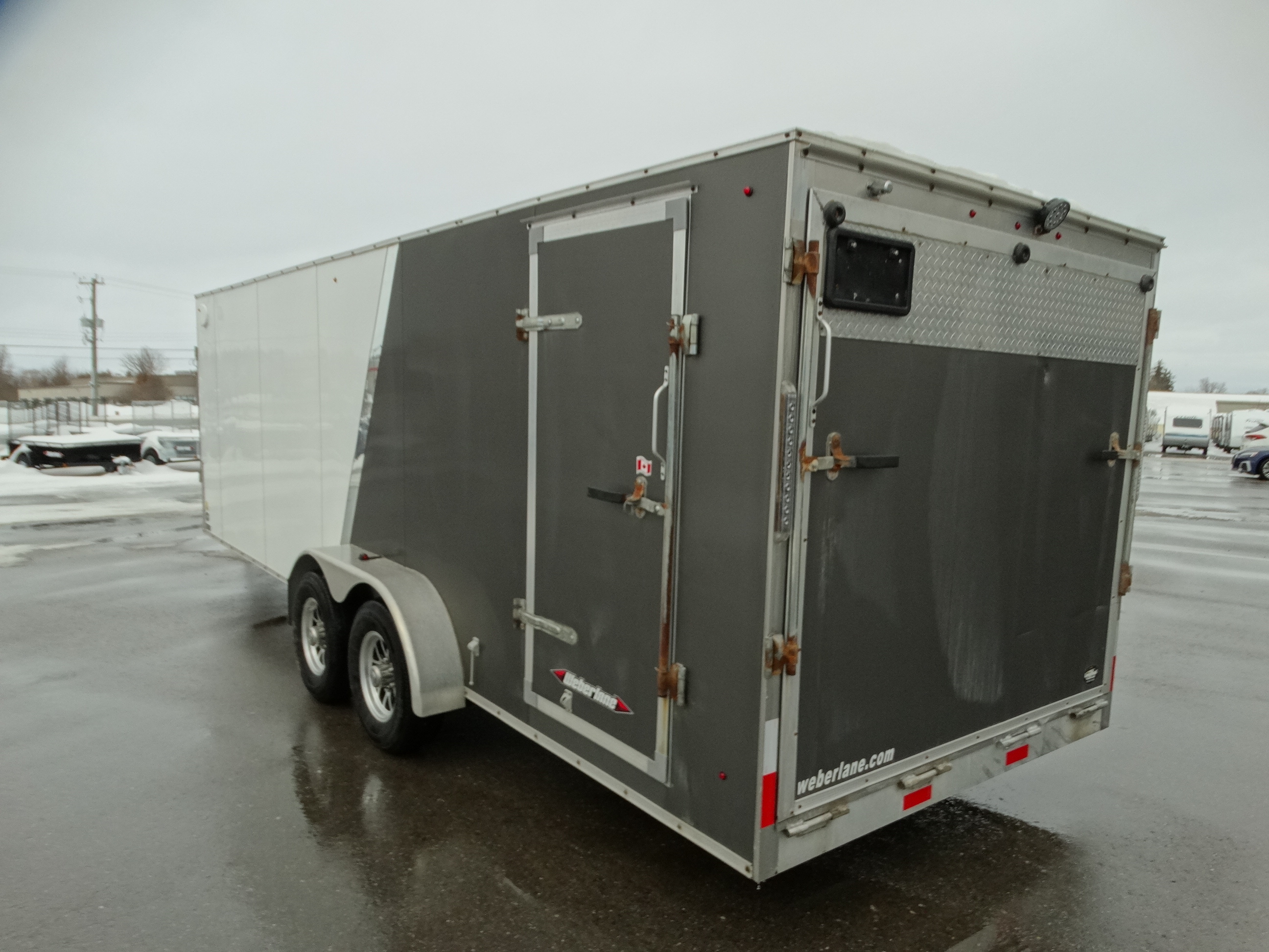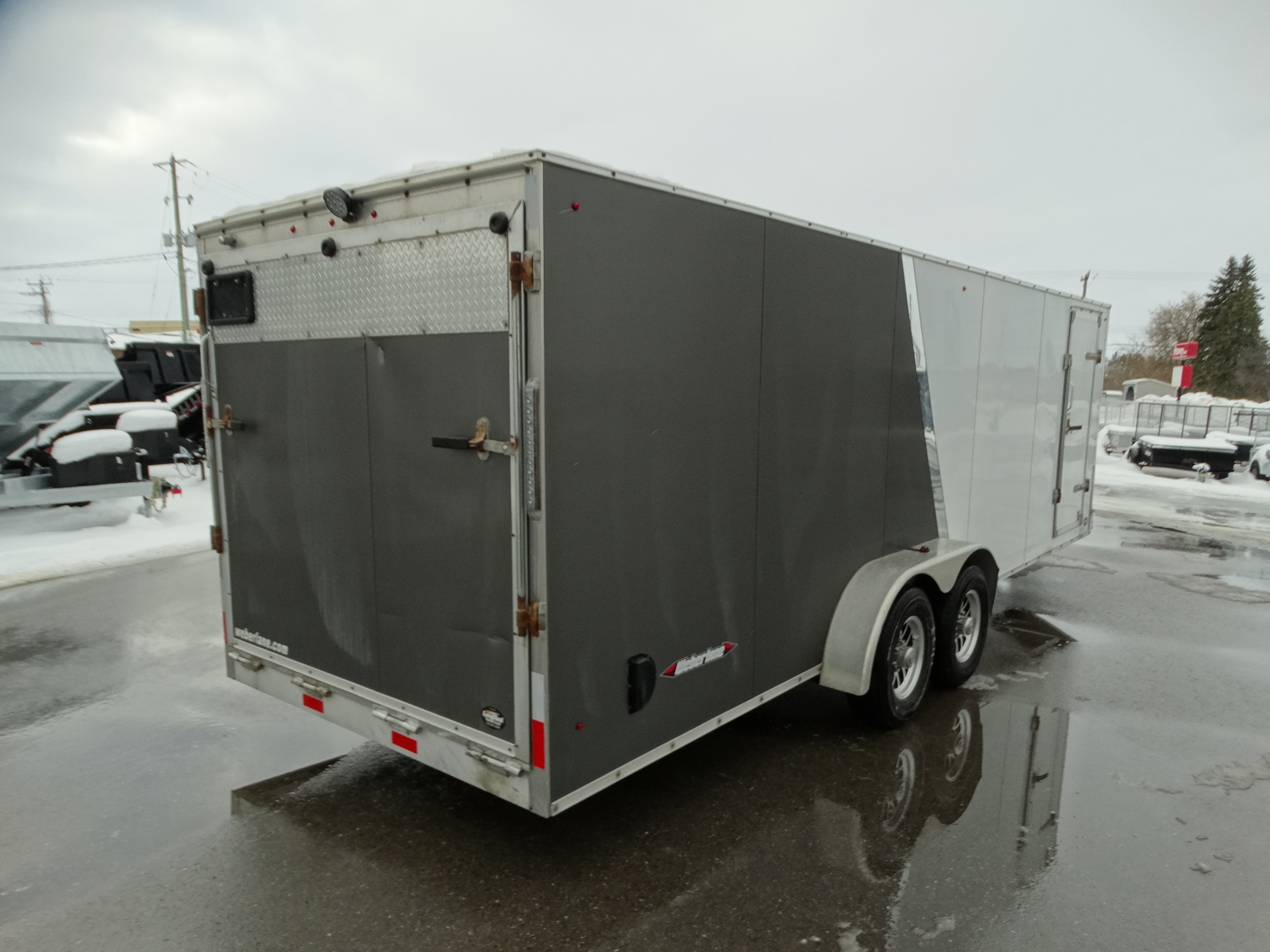 Come check out this used 7x27 aluminium sled trailer! This trailer has tandem 5200 lb axles with electric brakes and a payload of over 7000 lbs. It comes with aluminium rims, white plastic interior lining, a rear ramp door as well as a front ramp door, 72'' interior height and d-rings. This trailer also comes with a man door on each side, rear loading light, mounted spare tire, front jack and safety chains. Come take a look!
