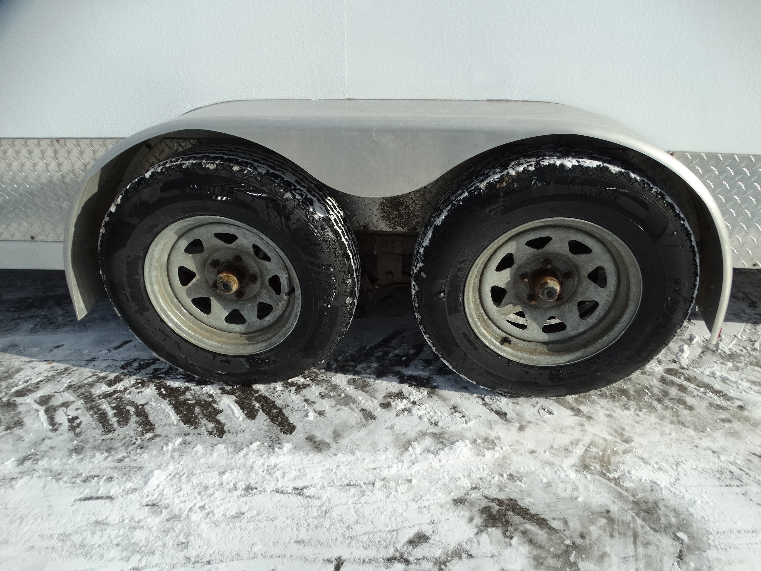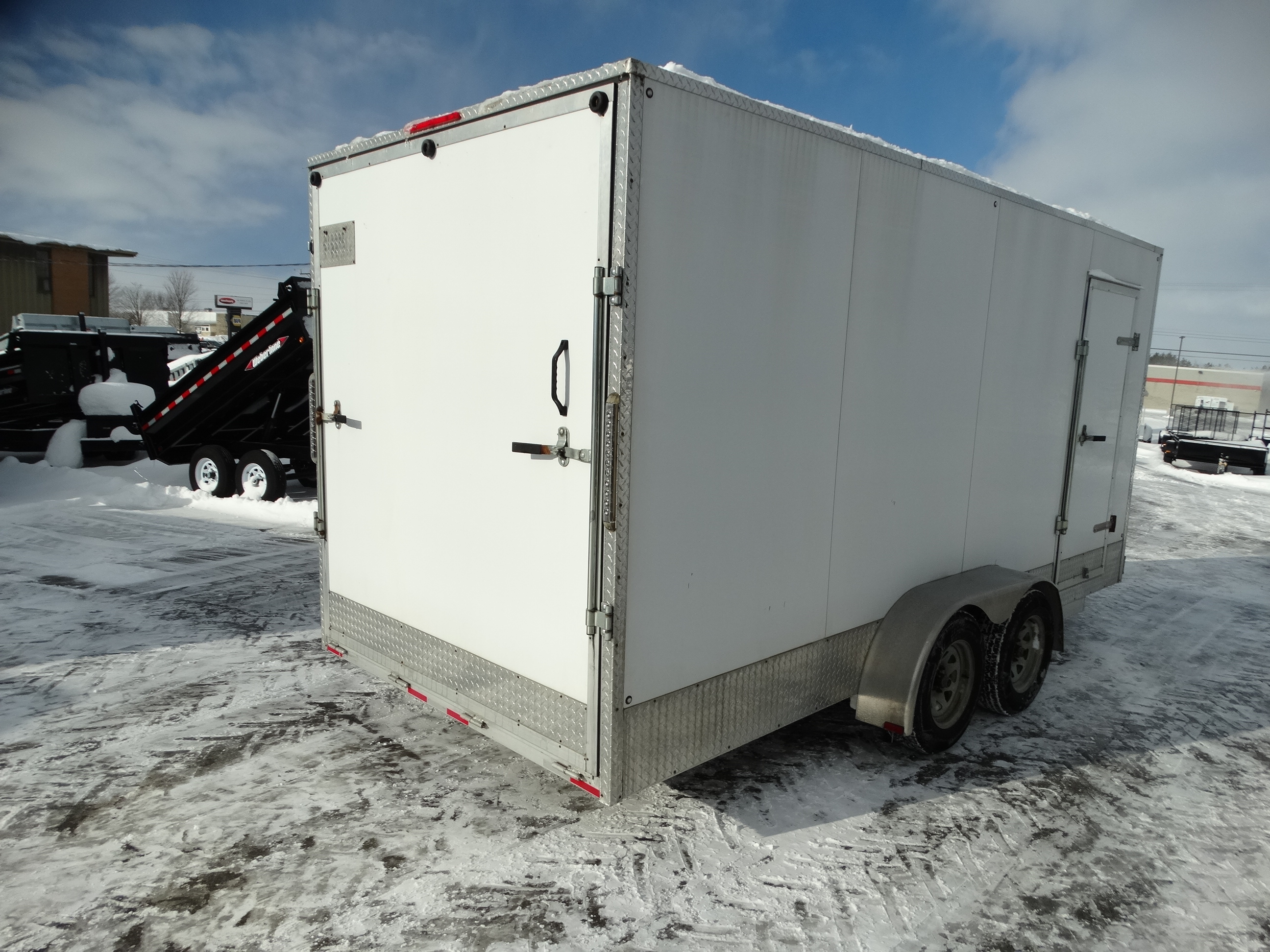 Come take a look at this 7x16 aluminium enclosed trailer. This trailer has tandem 3500 lb axles with electric brakes and a payload of around 4800 lbs. It has a rear ramp gate, side door, plywood lined interior, d-rings and 84'' interior height. Still in great condition. Come check it out!