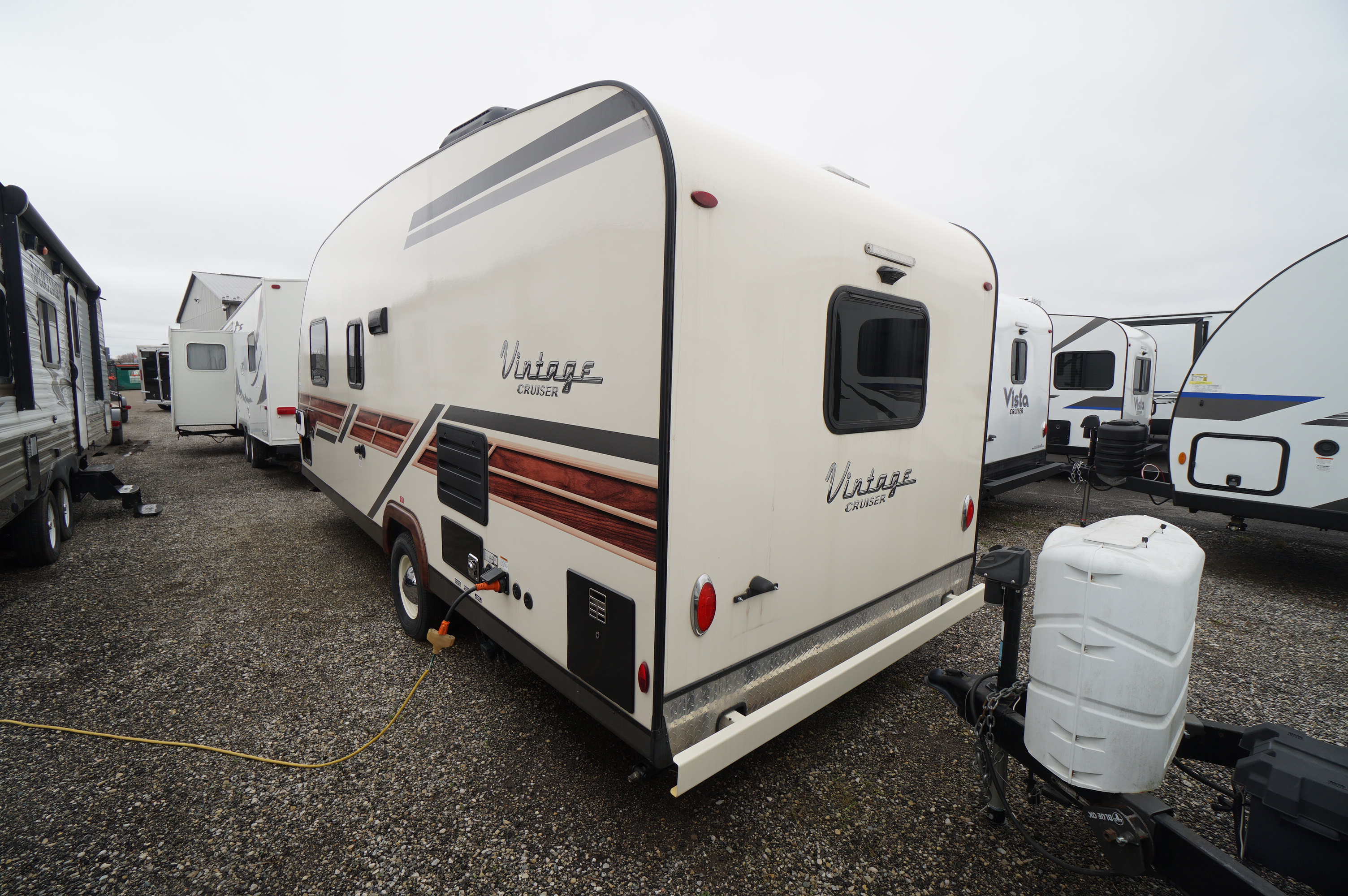Nearly new 19 foot Couples Vista Cruiser. This pre owned 2023 Woody Vintage rear bath layout is in excellent condition! Lots of modern features like powered tongue jack, power awning, slam latch baggage doors, prep package for solar and back up camera, motion sensor lights and much more! All in a Vintage woody package, with woody cabin interior with Vintage red hi lights, complete with Vintage car pillow cases! Front walk around queen bed with shirt closets, over head storage, and under bed storage. Red cushions on the diner style booth dinette. Well equipped kitchen with all appliances working properly. Propane and electric two way fridge. Roof top air conditioning. Propane furnace. Roomy rear bathroom with glass door shower, sink with medicine cabinet, skylight over the shower, and a foot flush toilet. Come check it out at Longhaul in Listowel! Financing is available. Trade ins are accepted. Full walk through video at: https://www.youtube.com/watch?v=f9W4et8kYVs
