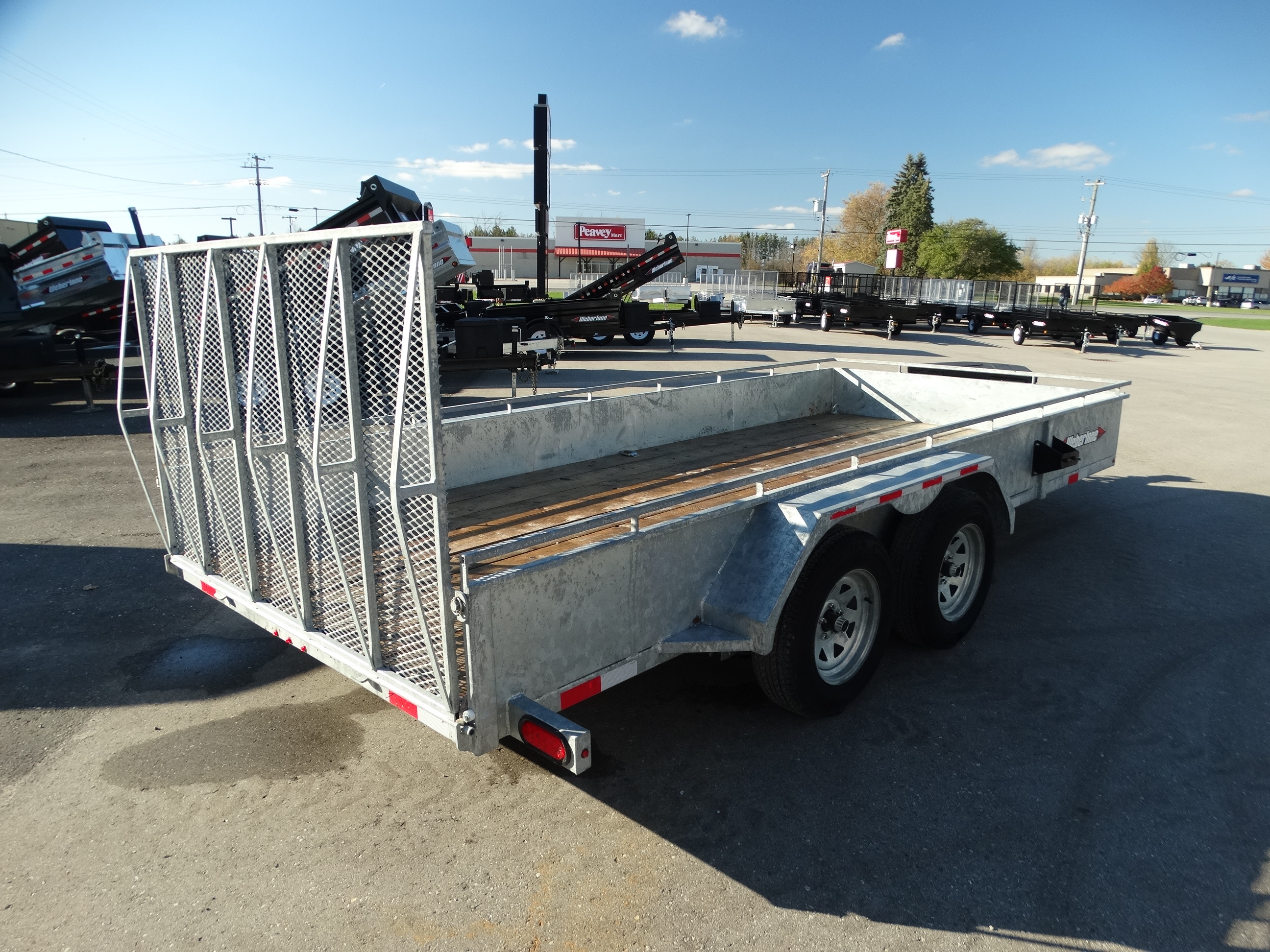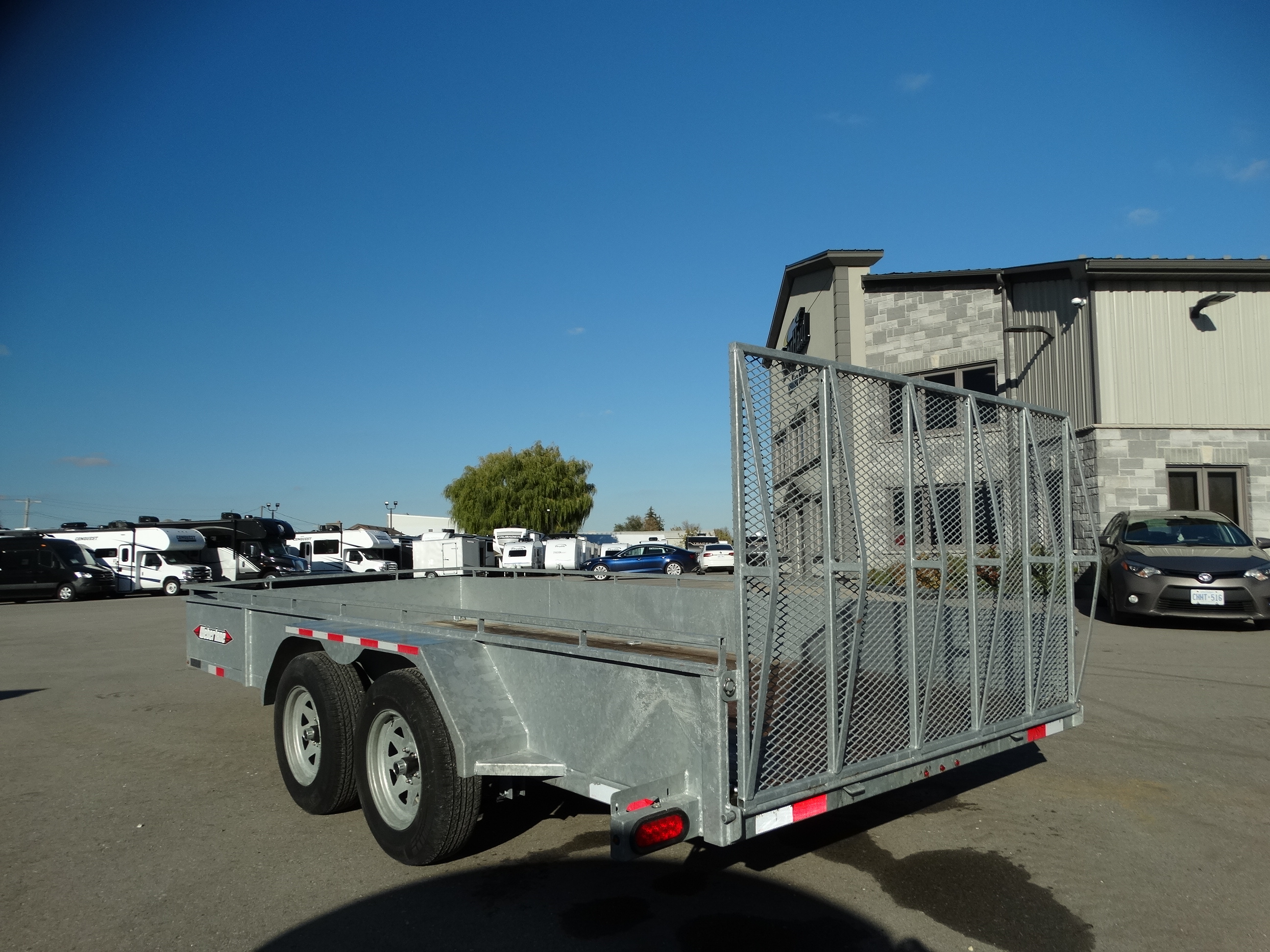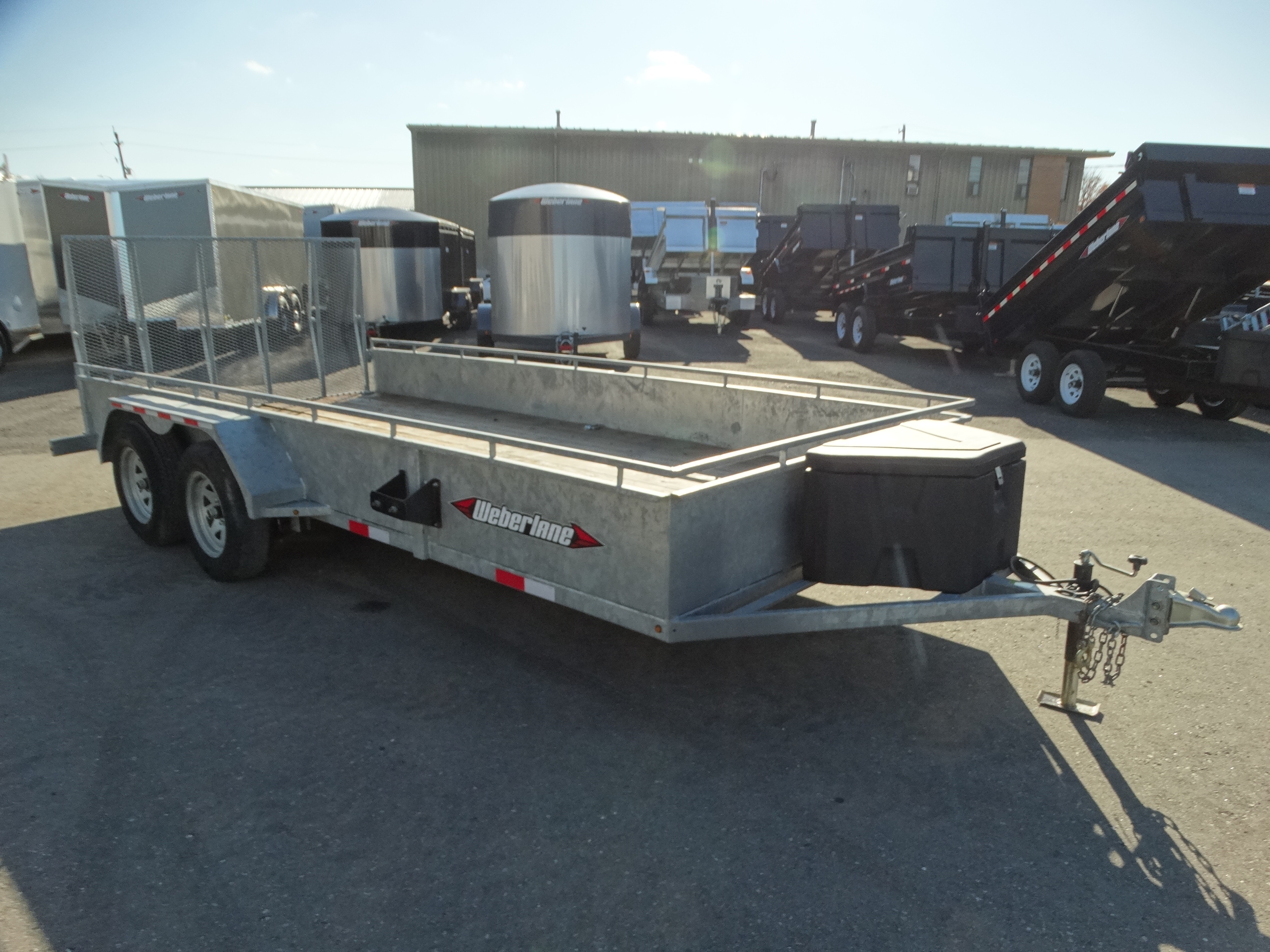 Come take a look at this used 82'' x 16' galvanized landscape trailer. This trailer is still in great shape, and has tandem 3500 lb axles with one axle electric brakes and a payload of around 4300 lbs. It has galvanized rims, LED lights, d-rings, spare tire mount, front tongue box, rear mesh ramp gate, front jack and safety chains. Come check it out!