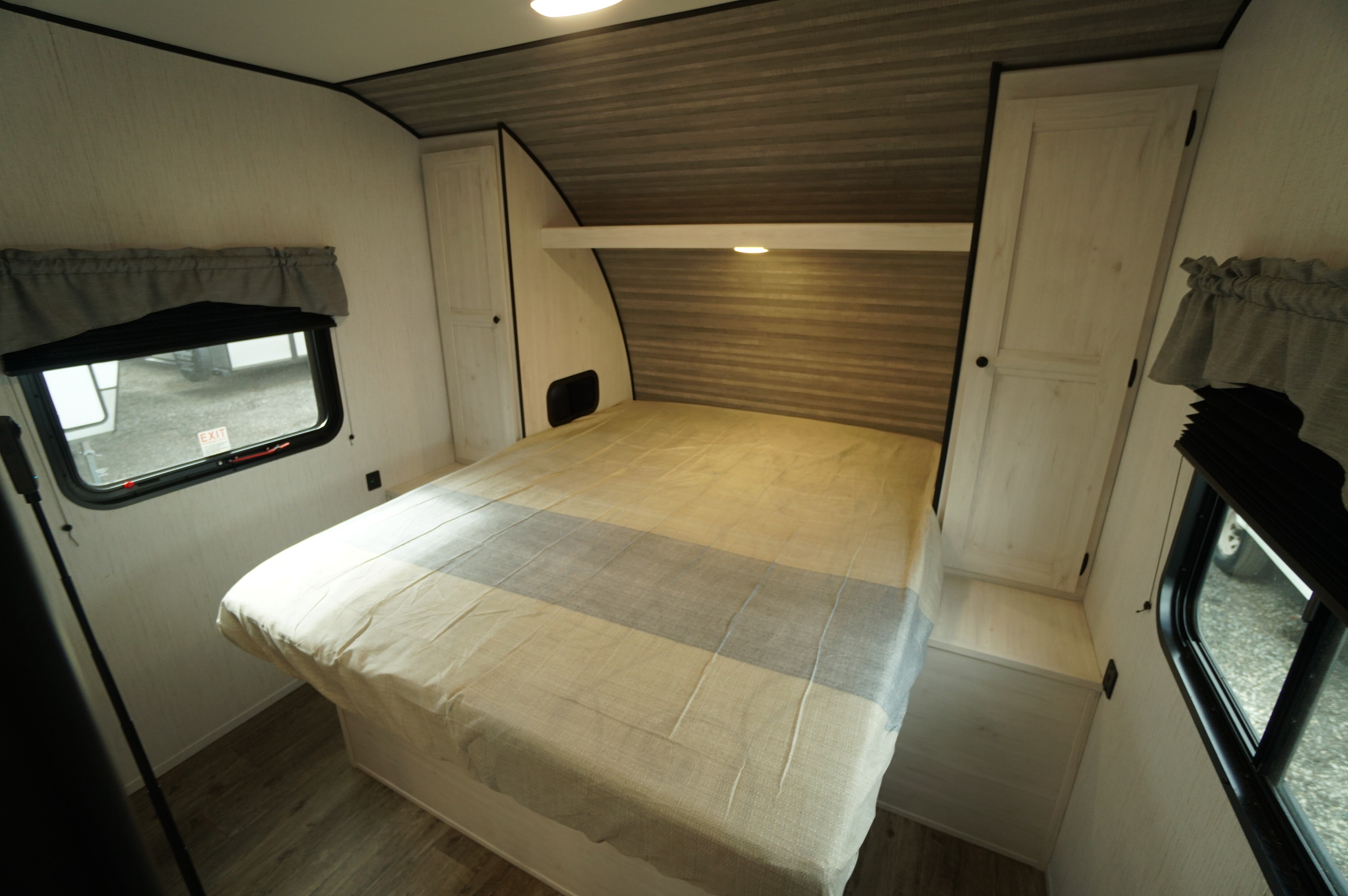 - Overhead cabinets above bed
