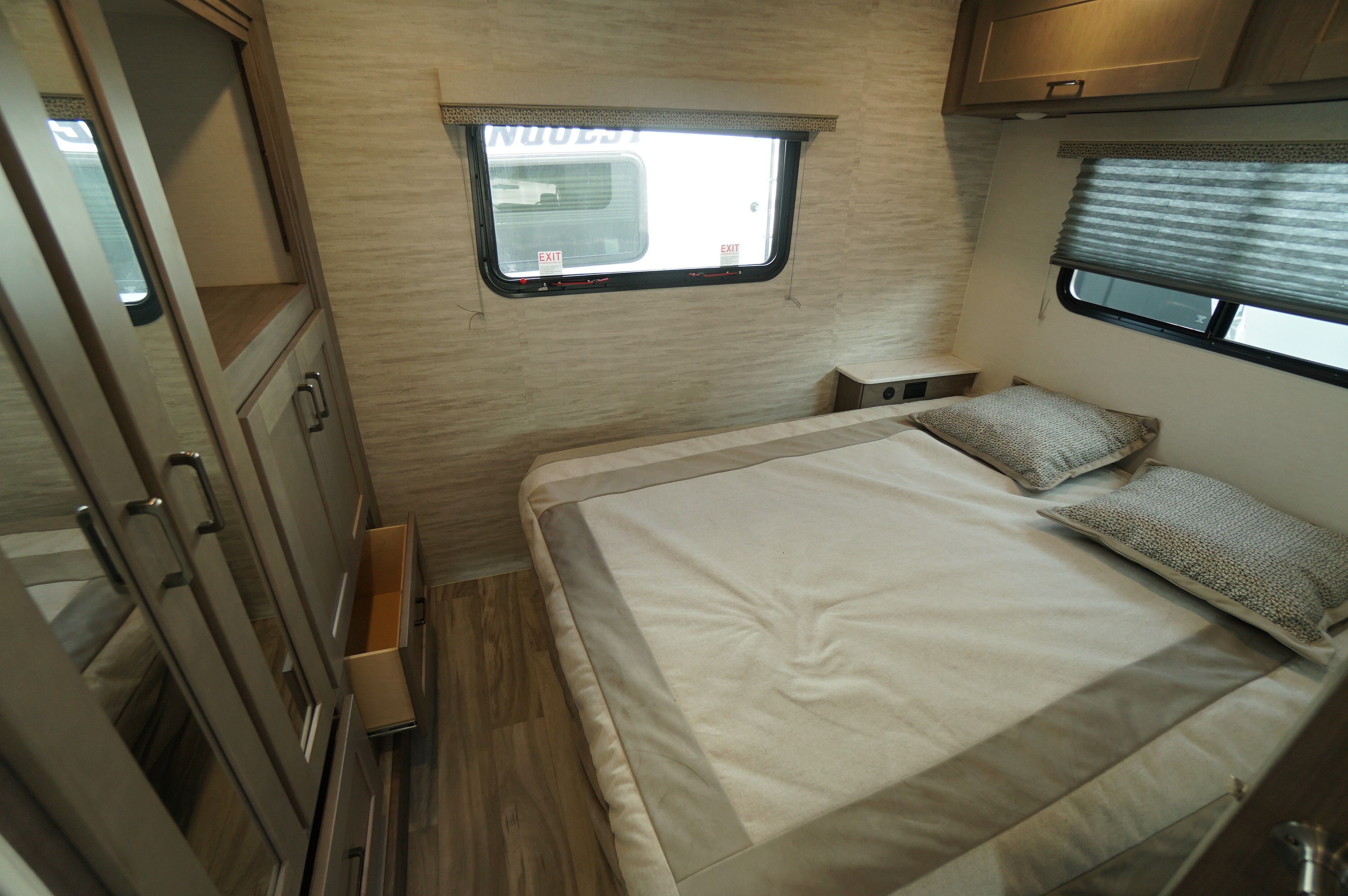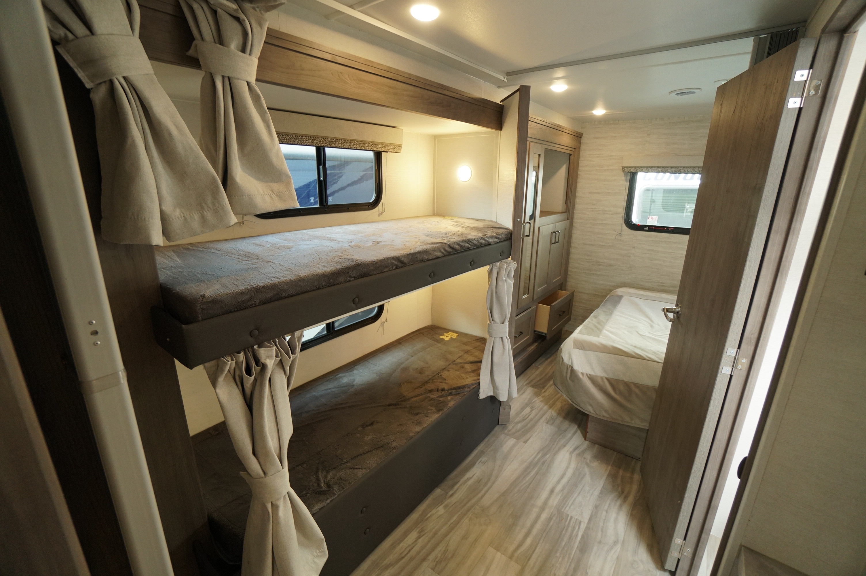 The 63111 is one of our most popular Class C family floorplans, with seatbelts for 8, and sleeping for up to 8 or 10. With the single bunk beds in the hallway, the rear queen bedroom, and the large loft bed up front, you can easily sleep 6 adults without even touching the couch or dinette beds! Not only does it have seating, sleeping, and seatbelts, it provides ample storage as well, with enough top bunk storage cabinets to take care of whoever is sleeping in the loft. Onboard Onan 4000 quiet run generator, with interior start switch and hour meter, plus the roof top solar, ensures you'll have comfortable camping wherever you go, whether on grid or off grid! Built on the trusty Ford 450 gas V8 chassis. Outdoor and indoor storage. Rear ladder, spare tire, and 7500 lb tow hitch with wiring. Slide topper awnings are standard on all Gulfstream motorhomes. Lots of windows, including at the bunk beds. Large window at the couch and dinette, because, after all, travelling is about seeing the country! Self levelling system. Comfortable, affordable, simple but well equipped. That's what Gulfstream motorhomes are all about. Come check out our new and used units at Longhaul in Listowel! For a full walk through video of this new unit, check the following link: https://www.youtube.com/watch?v=AYdqCqkfDp0