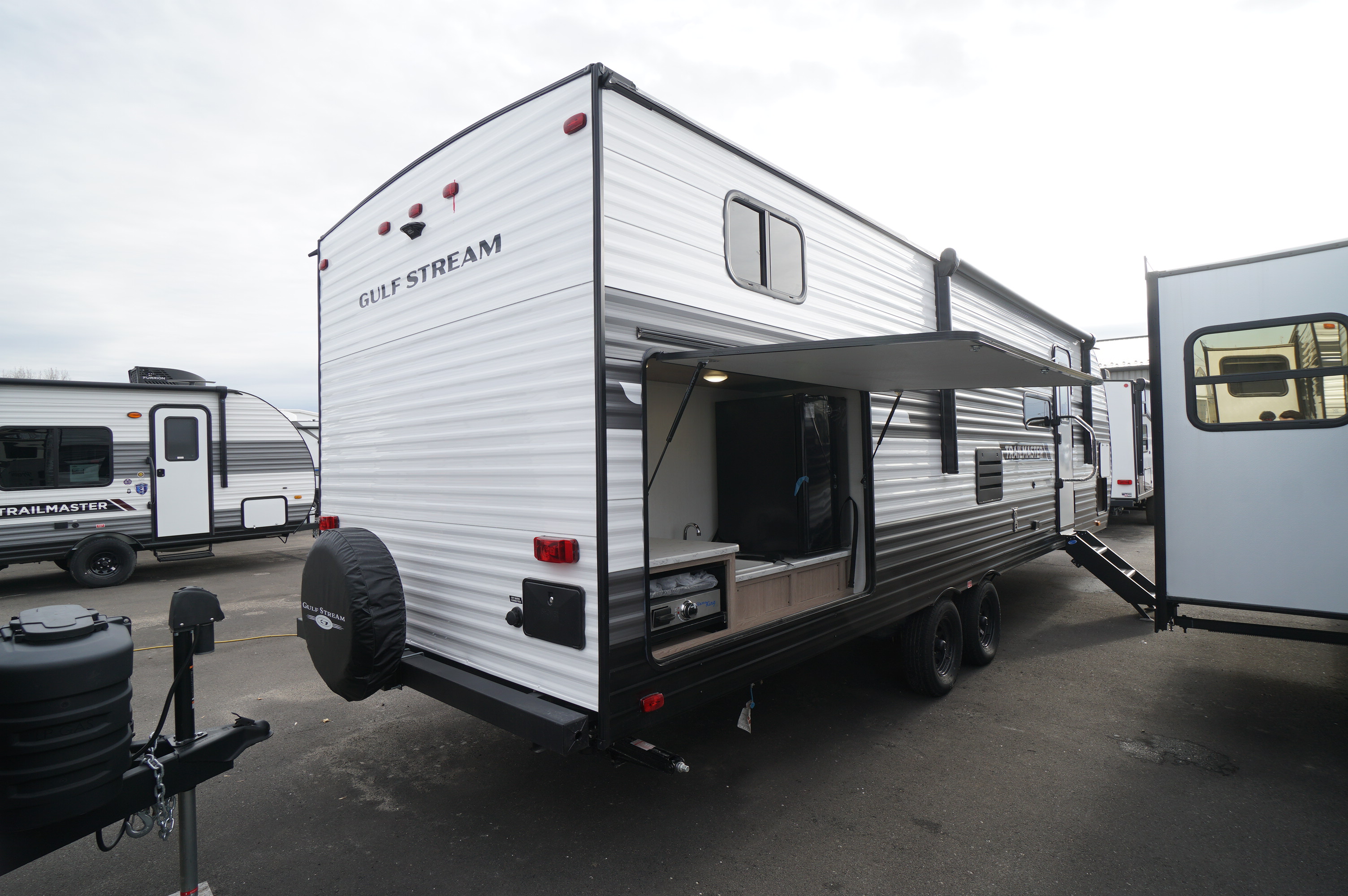 The Best Bang for Your Buck Bunkhouse! Folks love the fact you can tow this rear bunkhouse easily with a 1/2 ton truck. Sure, its a little more crowded bunkhouse that way, but Hey! The people sleeping in there generally aren't the ones paying the bills, nor driving the truck anyway! So treat yourself with this 6210 lb rear private bunkhouse, with a single living room slideout, front private queen bedroom and large rear outdoor kitchen with a pull out Flame King cook griddle, sink and a good sized bar fridge. Well lit bright interior with whites and greys, an electric fireplace in addition to the propane furnace, and Gulfstream is still giving us the two way propane and electric fridge and freezer, and the two bowl sink! Both the dinette and sofa convert to beds if you need to sleep up to 9. Three single bunks in the rear bedroom, plus a large wardrobe closet. Come check out the Trailmaster RV trailers at Longhaul in Listowel!