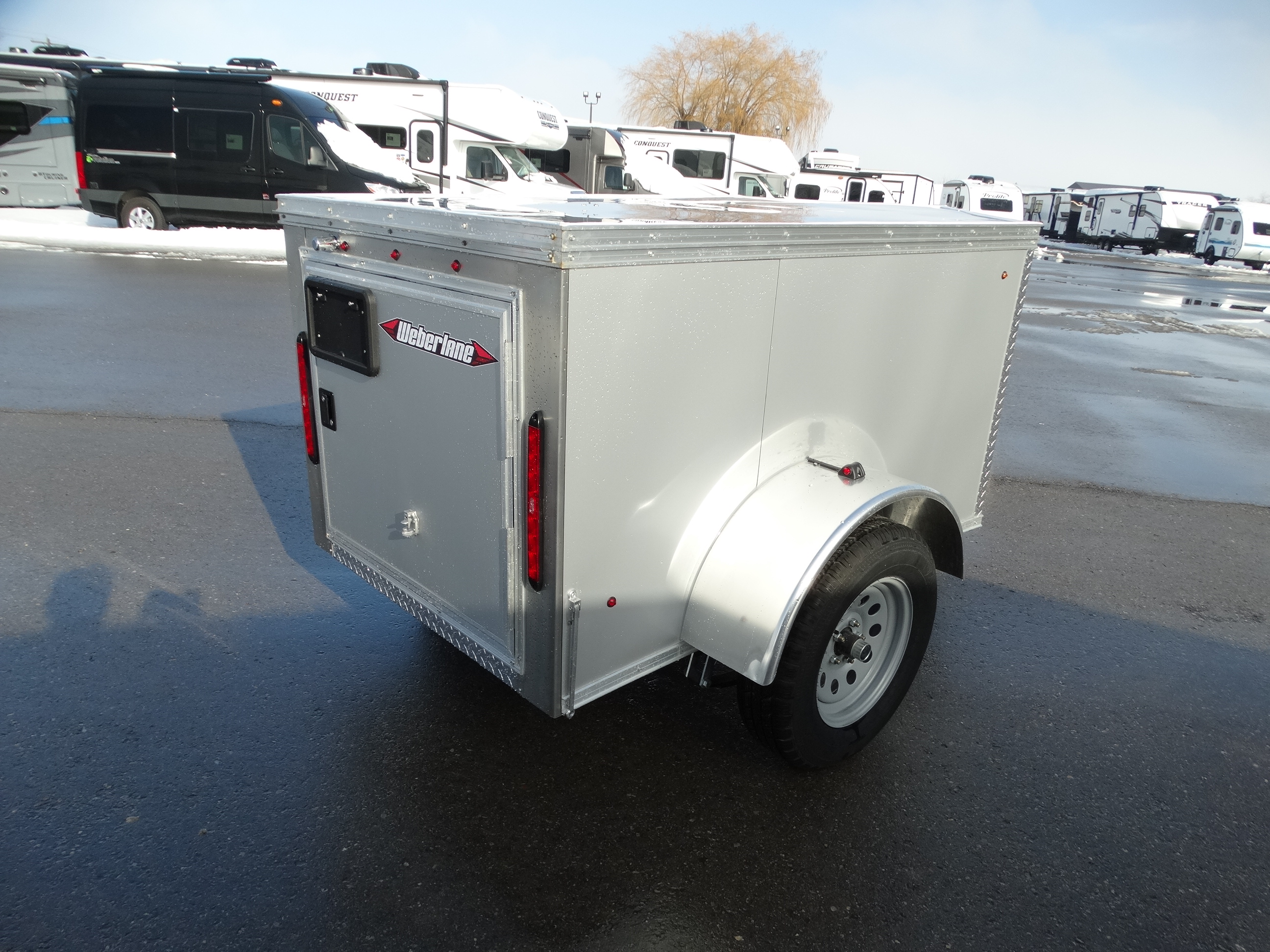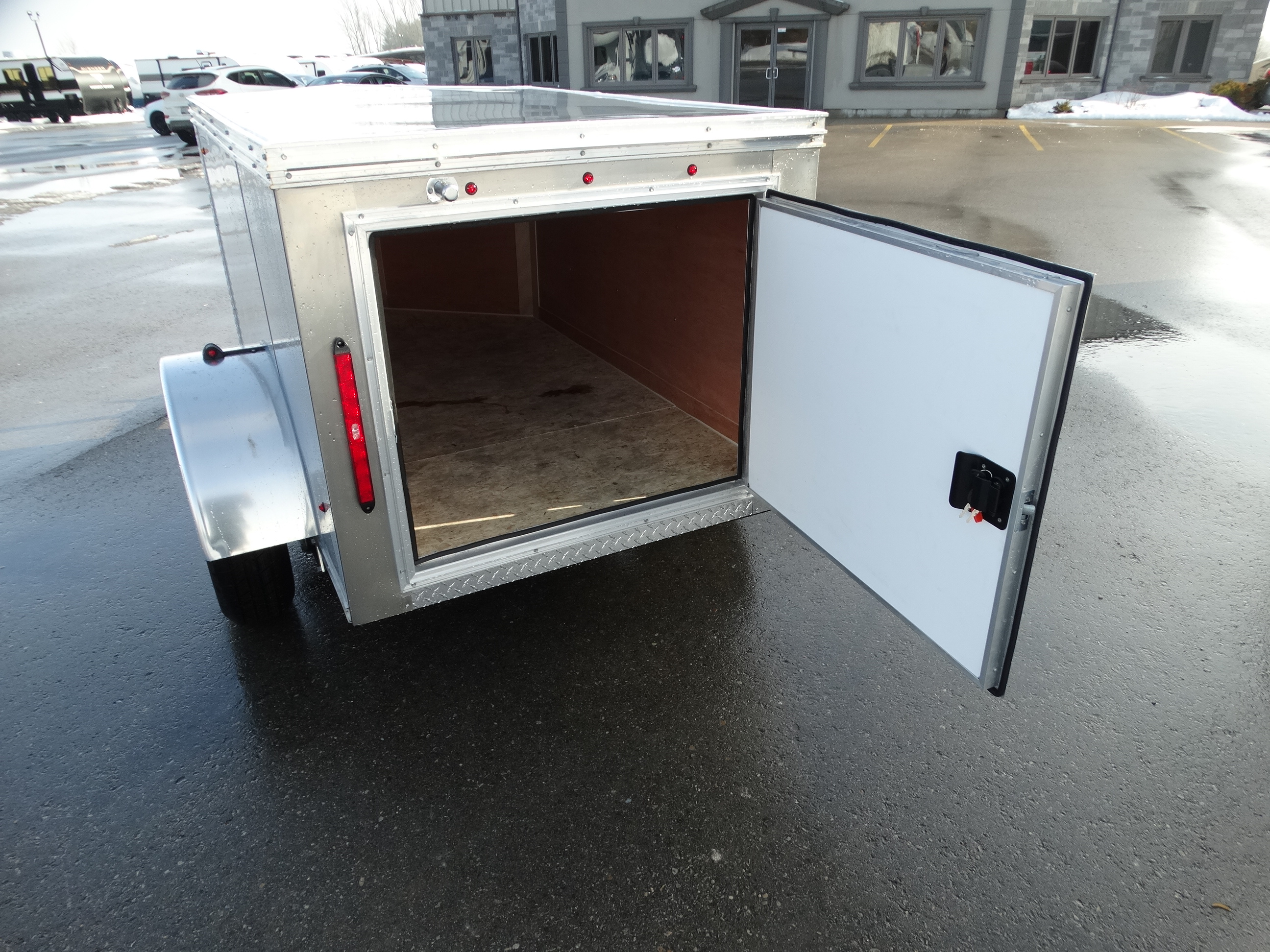 Come check out this cool little enclosed trailer. This trailer is a 4x6 trailer with a single 3500 lb axle with a payload of around 2100 lbs. It is great for behind a small vehicle, to tow luggage, camping supplies etc. It has an interior height of 36'' with an RV style door at the back. It has an interior light, front jack and safety chains included. Come check it out!