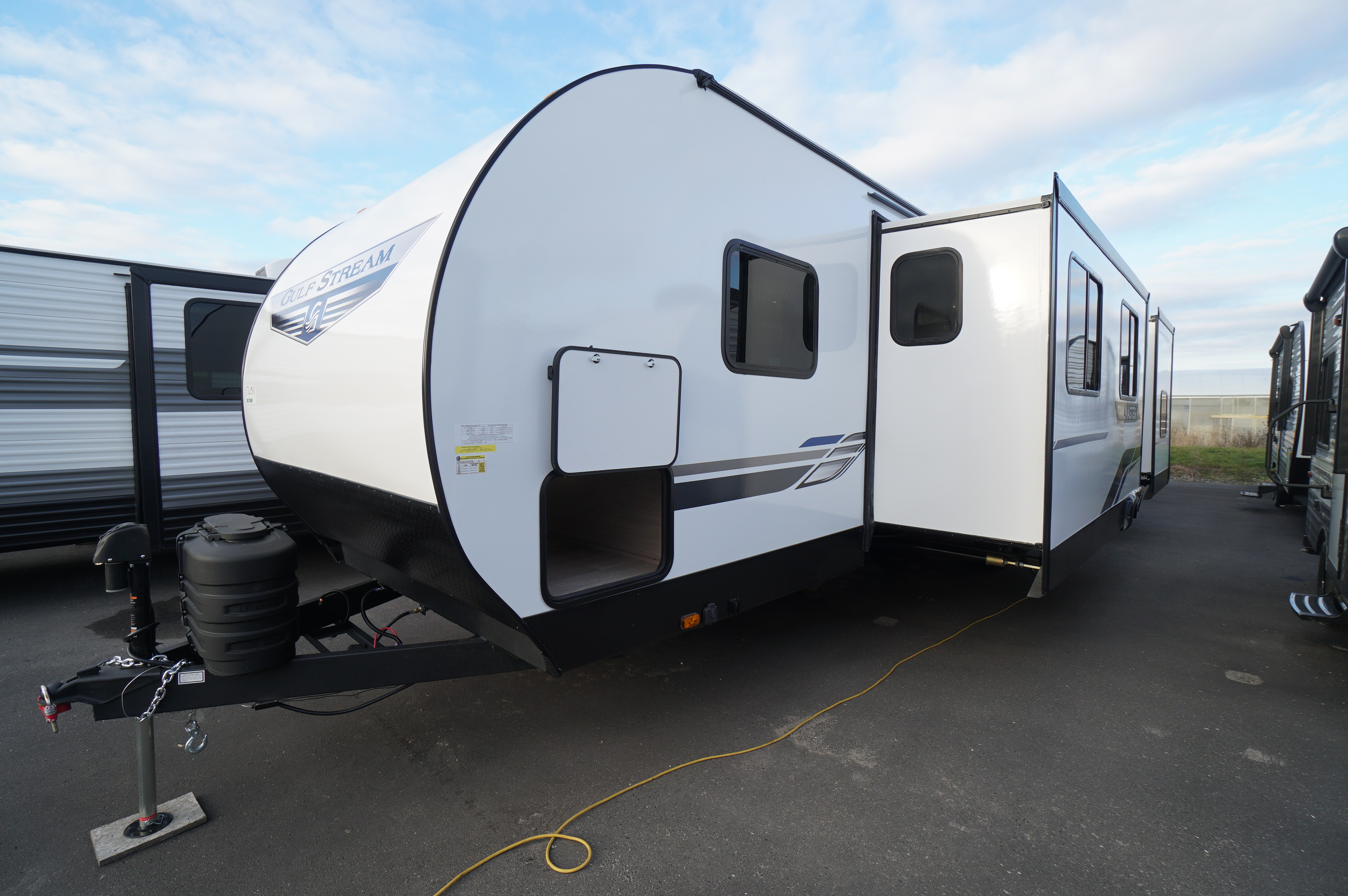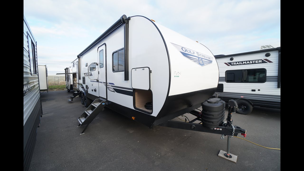 Amazing double slideout bunkhouse trailer. This unit is a complete re-vamp from the typical Gulfstream Trailmasters we generally have in stock. With fiberglass exterior, you get a cleaner fresher and easier to wax exterior, coupled with upgrades like power stabilizers, power tongue jacks, fold away stairway into main entrance, plus a rear washroom entrance. Very spacious floorplan, with a front queen walk around private bedroom, a roomy living room with U shaped dinette plus couch, and a rear 3 person bunkhouse. Easily sleeps 9 or more. Outdoor kitchen center with storage, work surface area, fridge, sink and a Flame King griddle cooktop. Outdoor shower, Rear ladder, large rear bunkhouse window. Prepped for backup camera and solar.