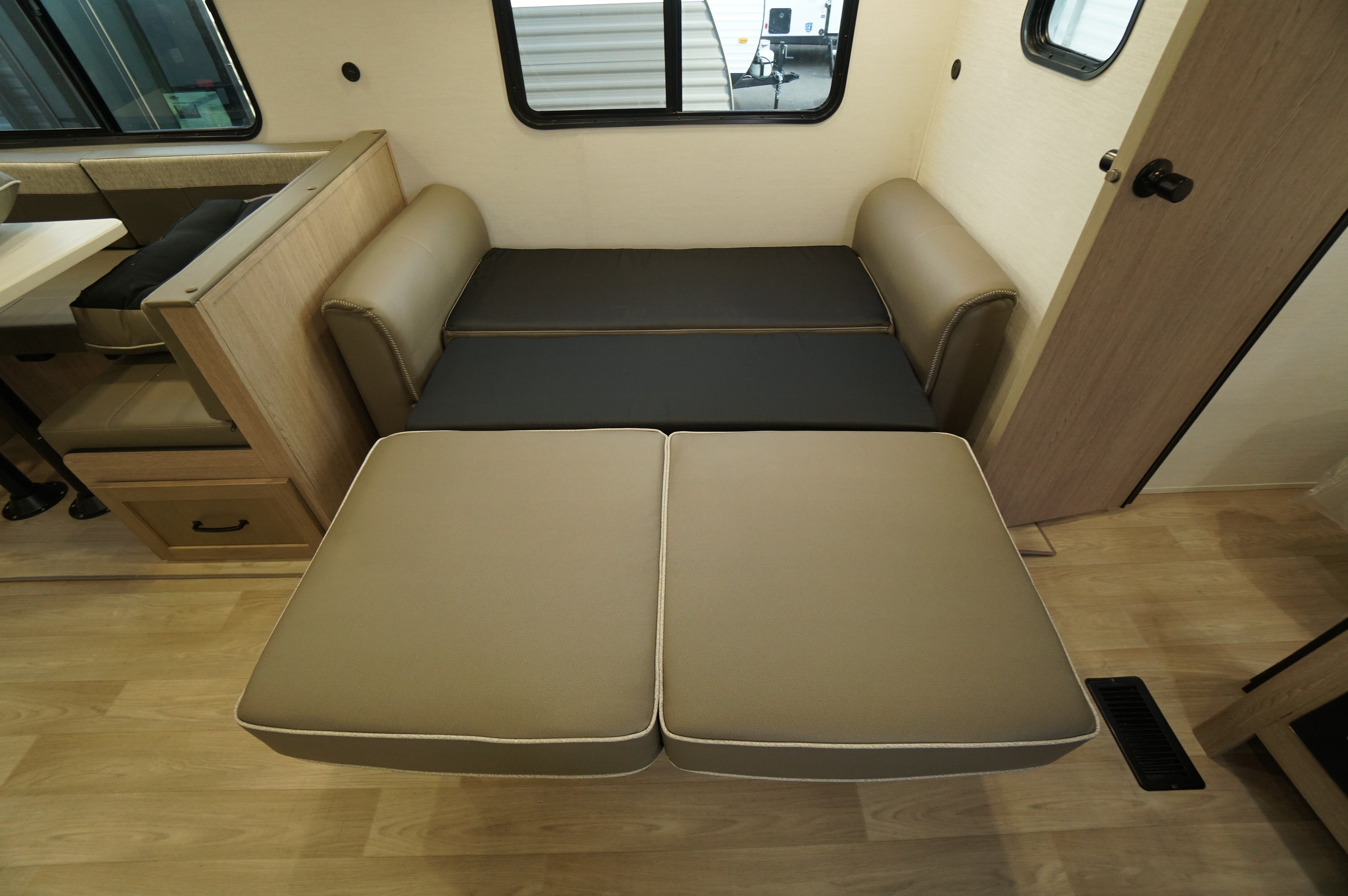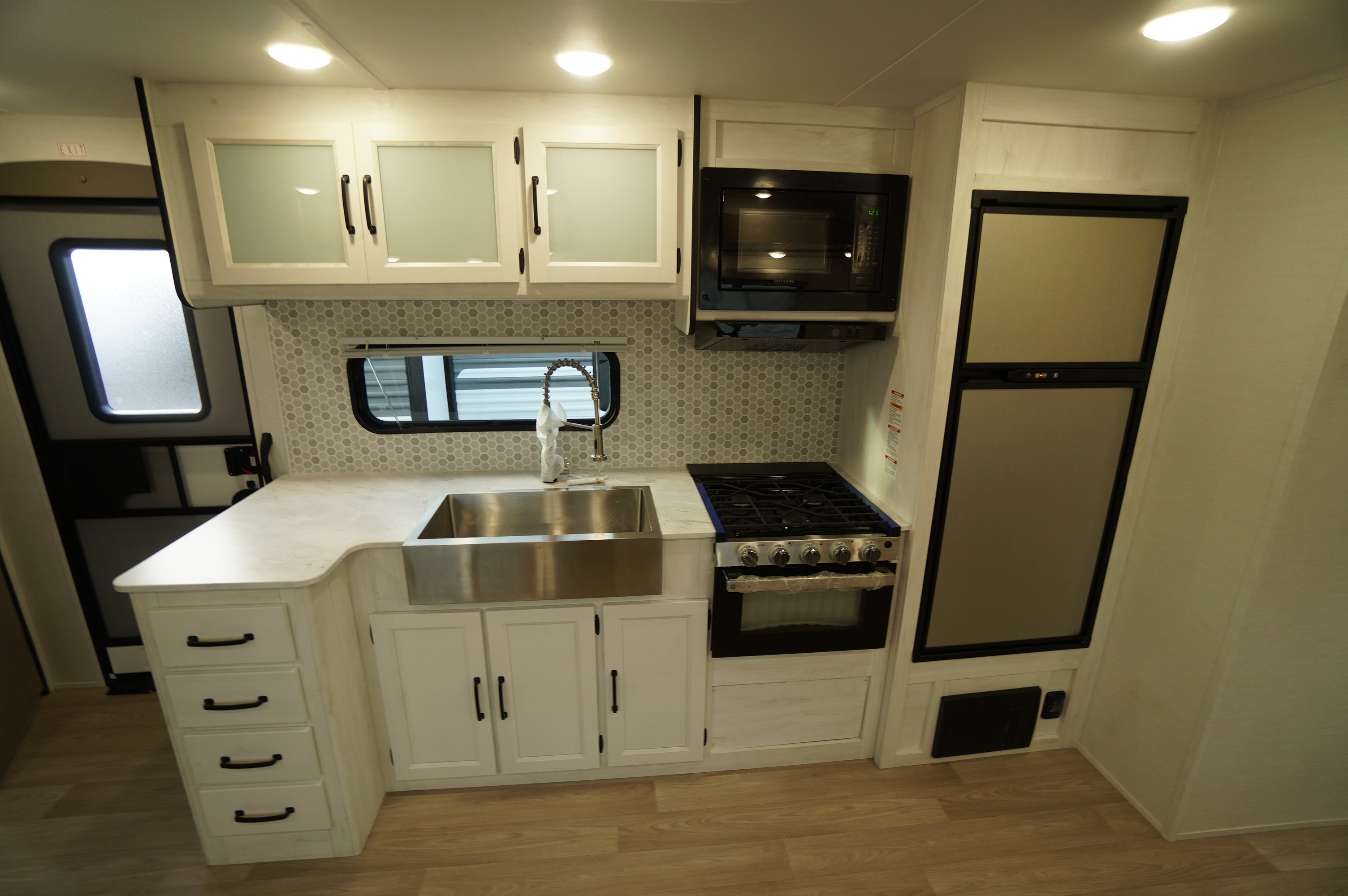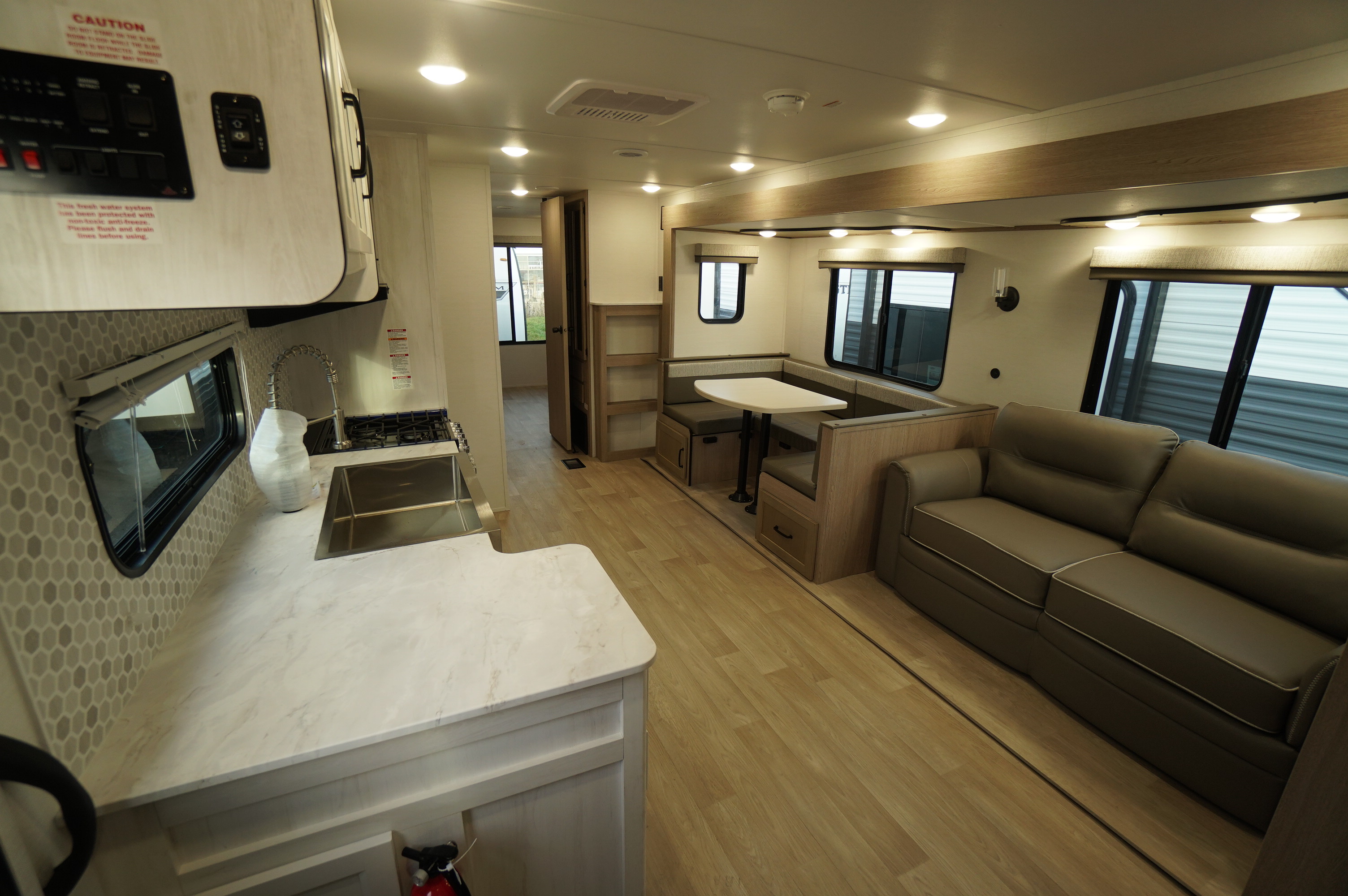 Inside you'll find an amazingly bright RV, with light greys and whites and lots of nice LED lighting. Large bowl stainless harvest style sink with high rise faucet. And in this unit, you still get the two way propane and electric fridge. Big counter space area and lots of under counter storage area. Jack Knife sofa bed. Easy access doors to the storage under the dinette. Electric fireplace under the TV mounting area. Large wardrobe outside the washroom area. Child friendly washroom with a little tub in the shower. Come check it out at Longhaul in Listowel!