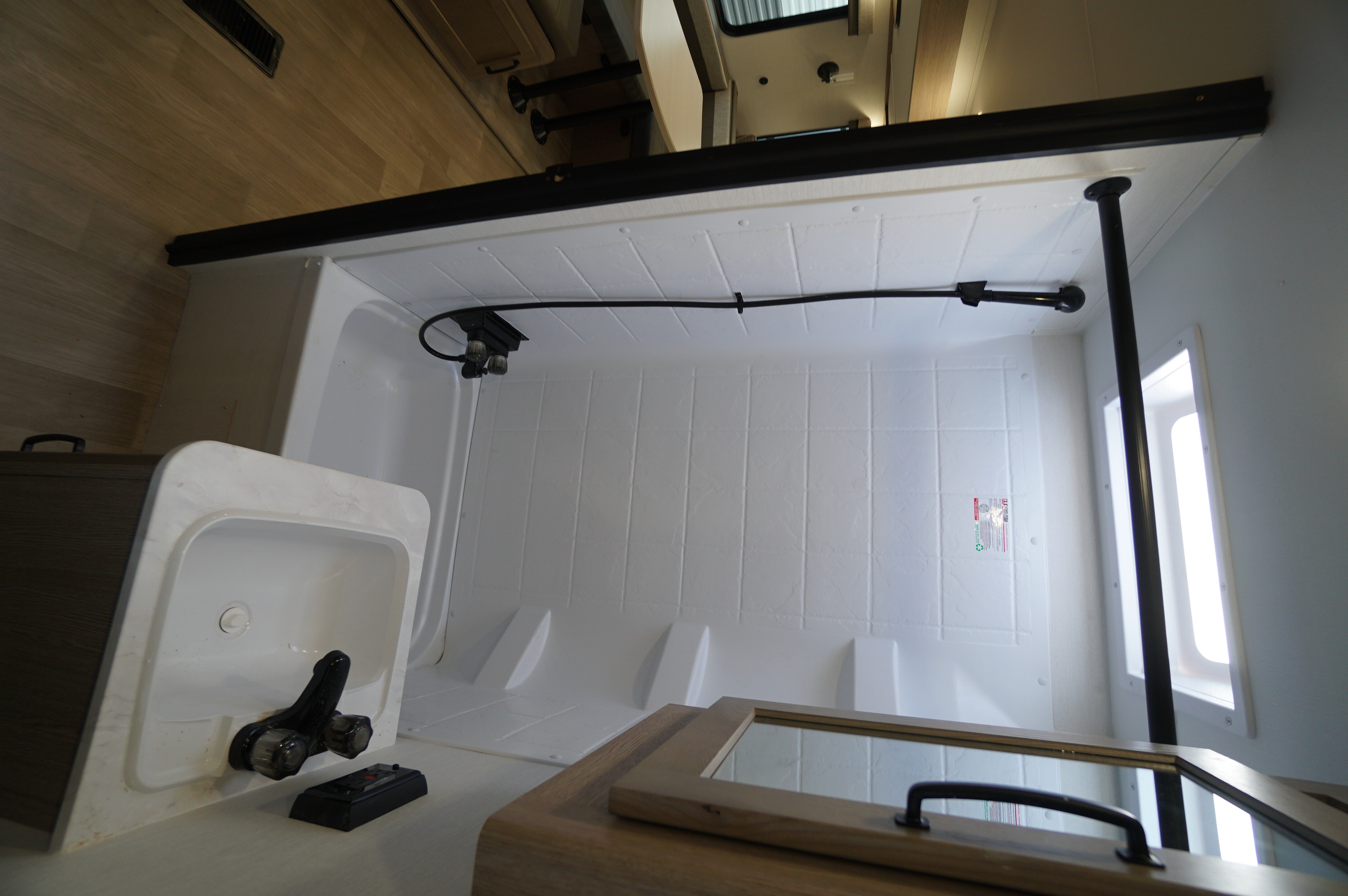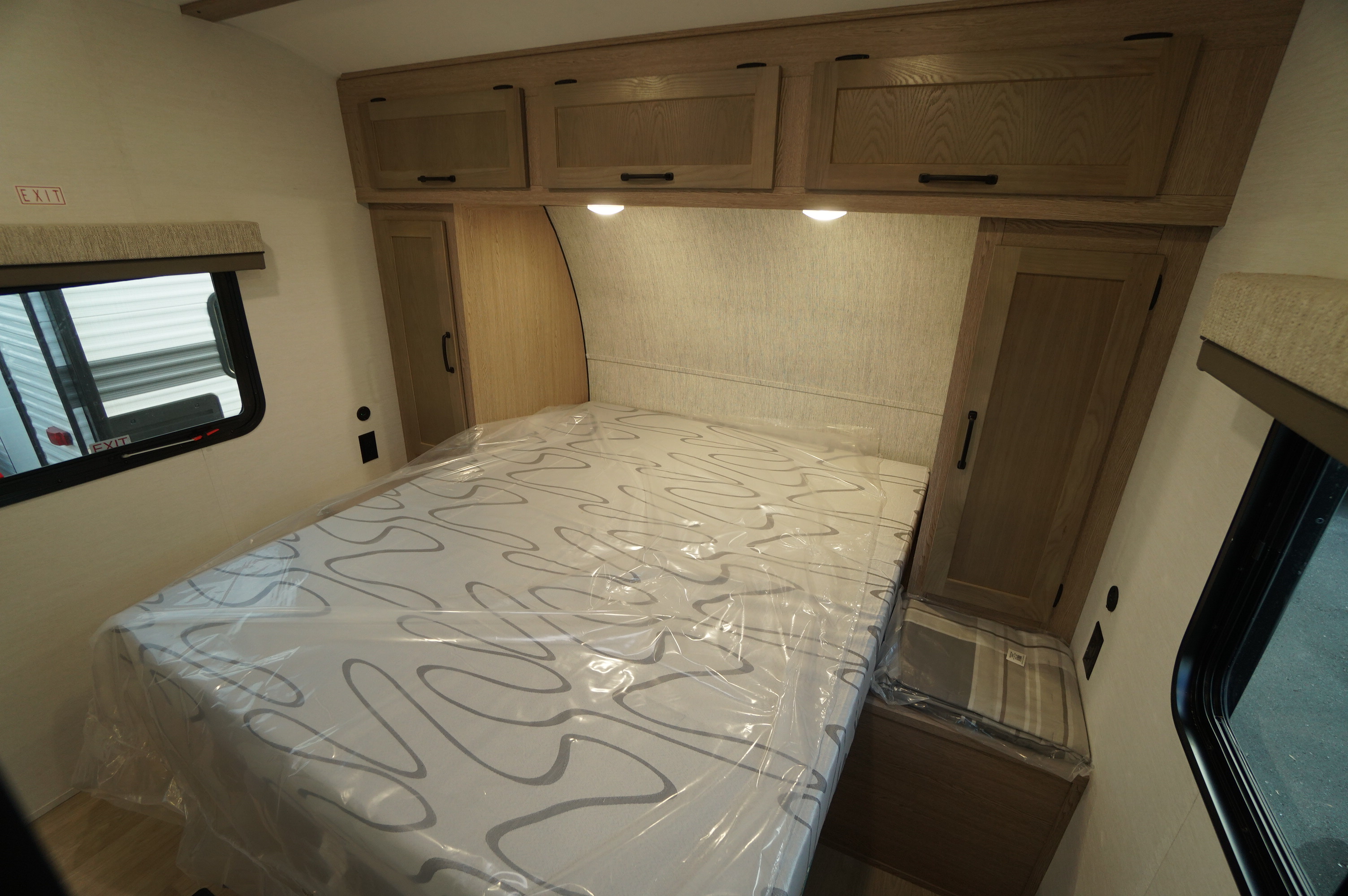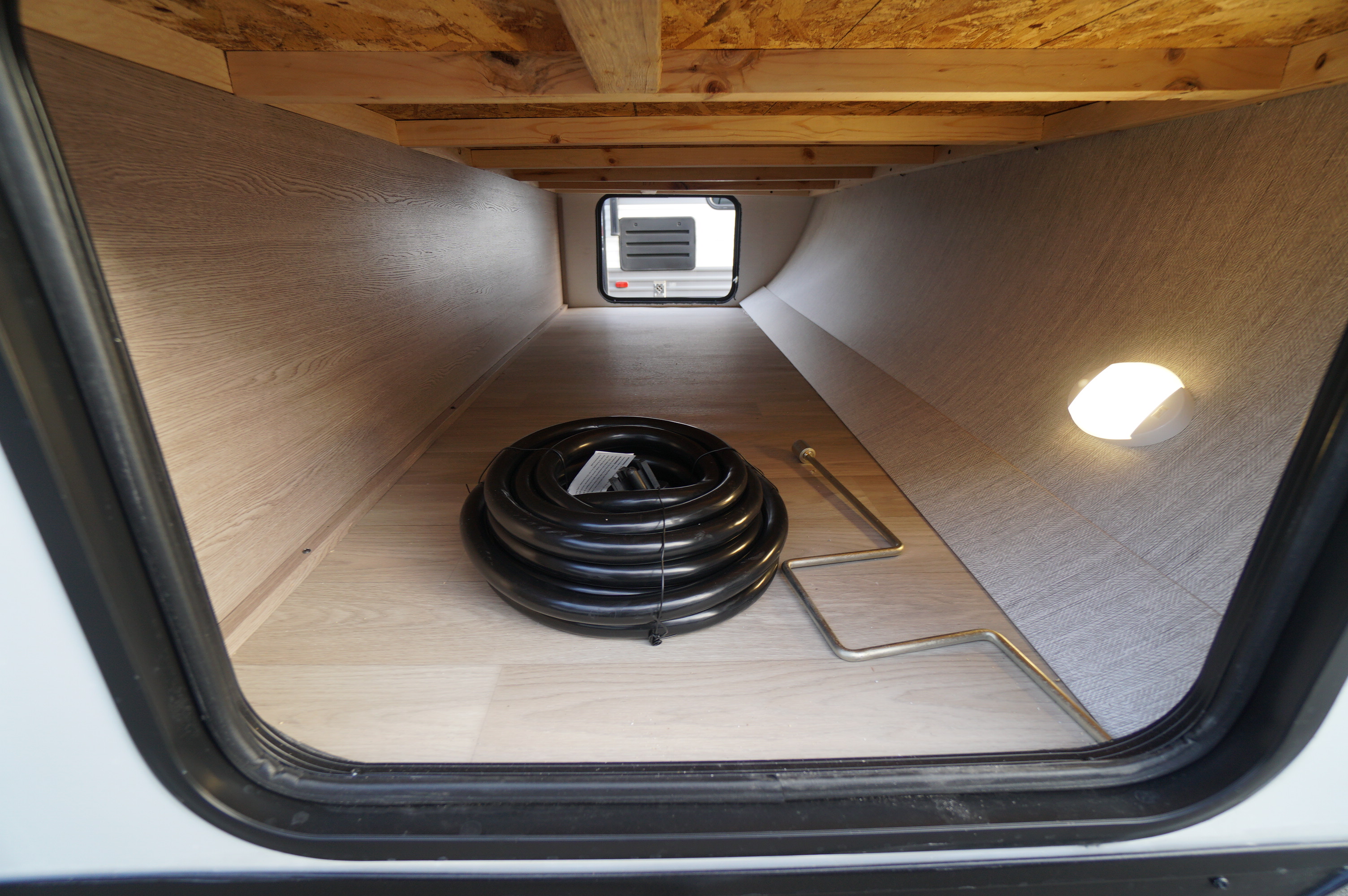 Inside you'll find an amazingly bright RV, with light greys and whites and lots of nice LED lighting. Large bowl stainless harvest style sink with high rise faucet. And in this unit, you still get the two way propane and electric fridge. Big counter space area and lots of under counter storage area. Jack Knife sofa bed. Easy access doors to the storage under the dinette. Electric fireplace under the TV mounting area. Large wardrobe outside the washroom area. Child friendly washroom with a little tub in the shower. Come check it out at Longhaul in Listowel!