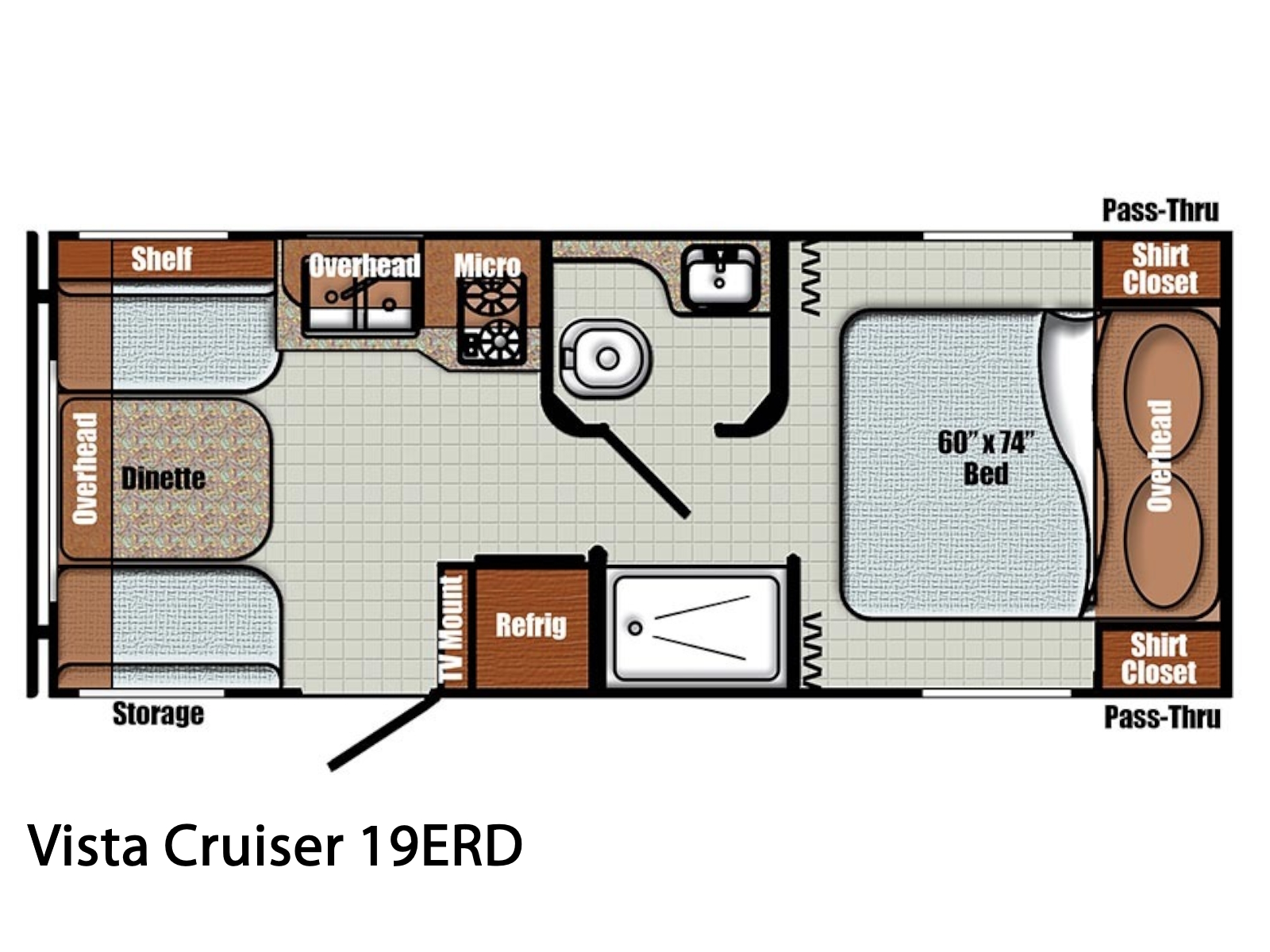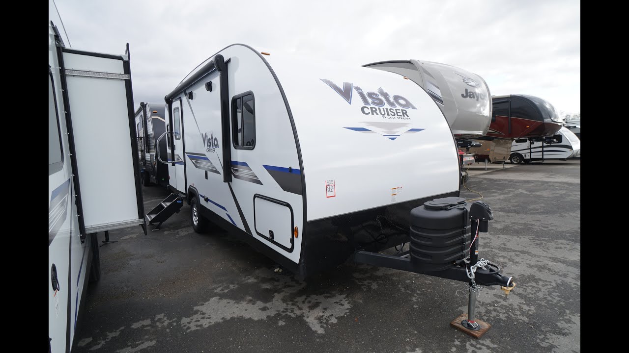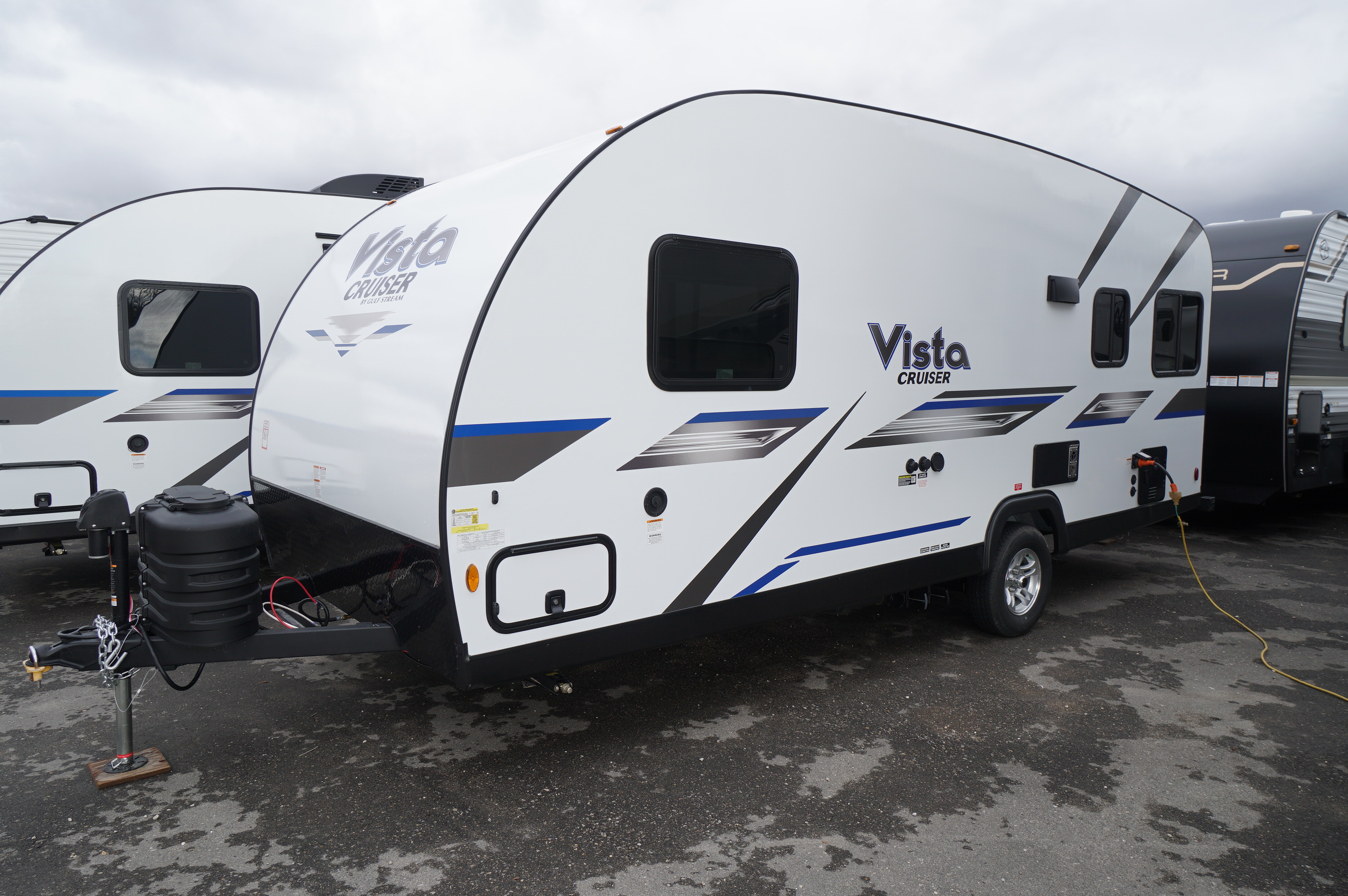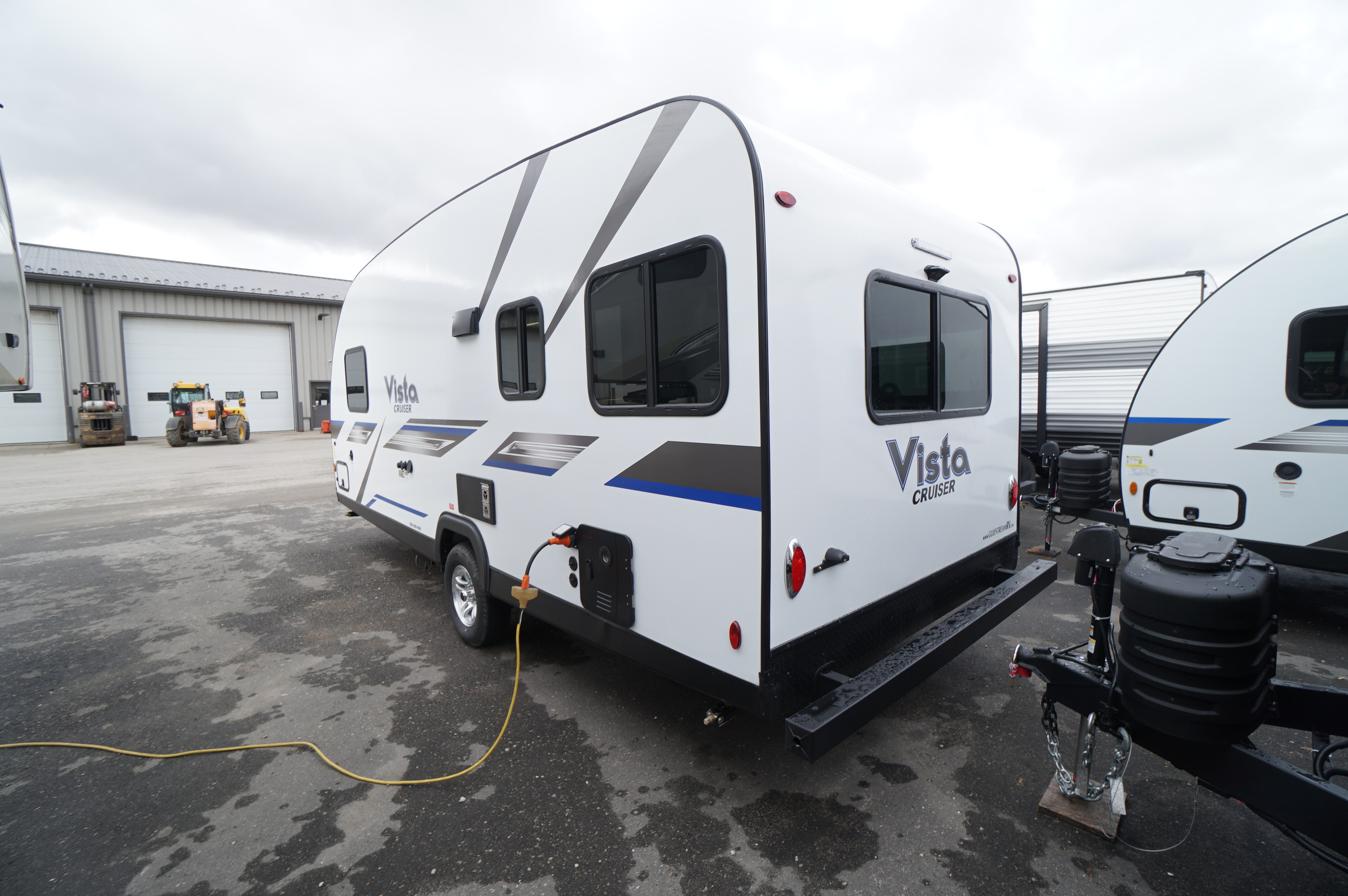 New 2026 Vista Cruiser 19ERD in stock. This is one of the most popular Vista floorplans, at 3270 lbs dryweight with a front 60x74 walk around bed, central washroom and a kitchen with rear 4 person dinette bed with beautiful screened and tinted windows all 3 sides of the dinette. Vista Cruisers are perfect couples trailers for mid sized SUV's. Designed for easy towing, with a lower floor, narrower floorplan at 7'6" for less wind resistance, and a curved one piece fiberglass front, roof and back. 2026 models come with new features like rooftop solar, 12v fridges and tankless water heaters. Aluminum frame RV with vacuum bonded gel coat fiberglass exterior. Azdel wall board, power tongue jack, slam latch baggage doors, power awning, LED awning lights and many more cool features. 19 foot single axle floorplan. Total length including hitch of 23 feet.