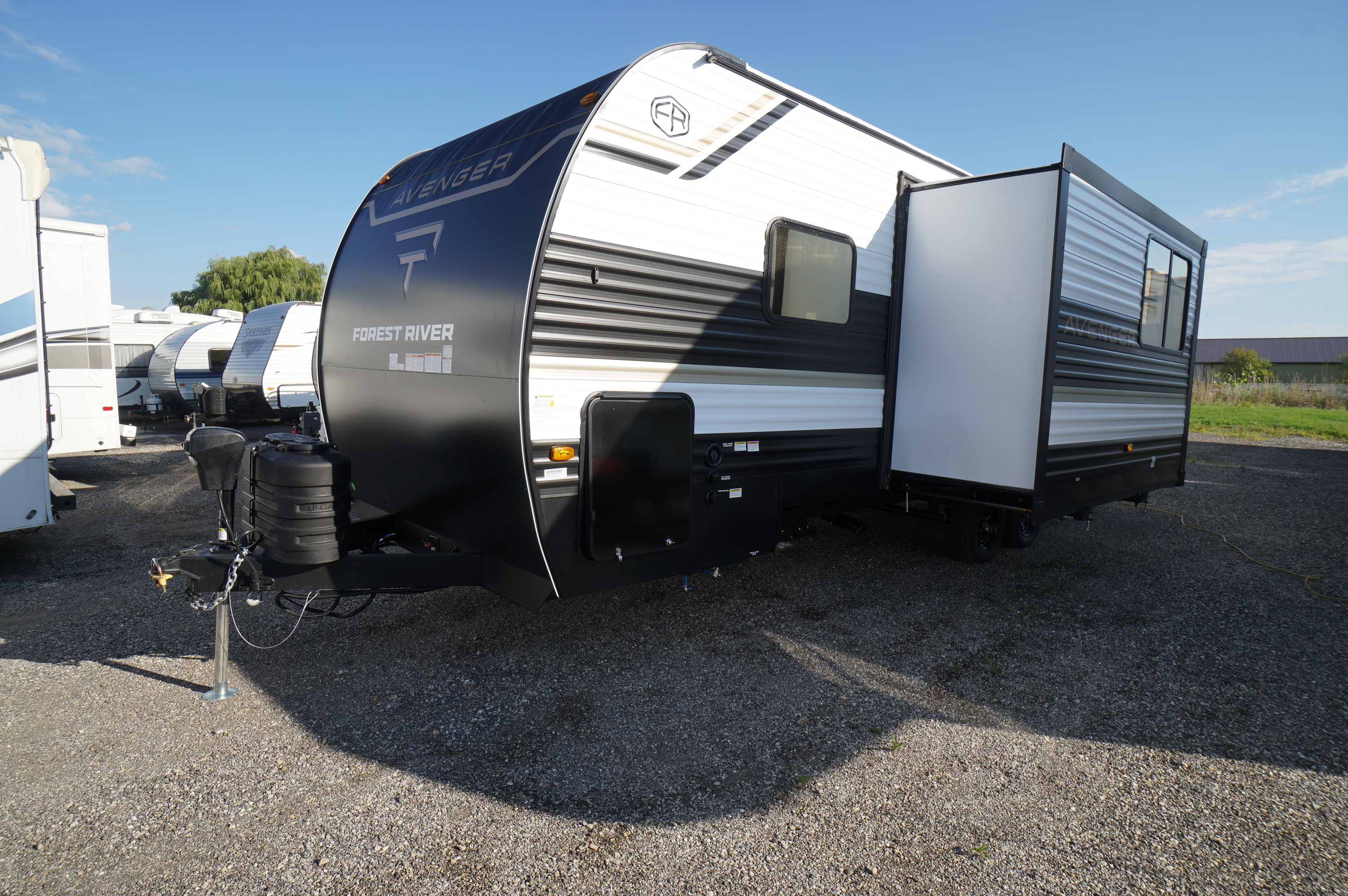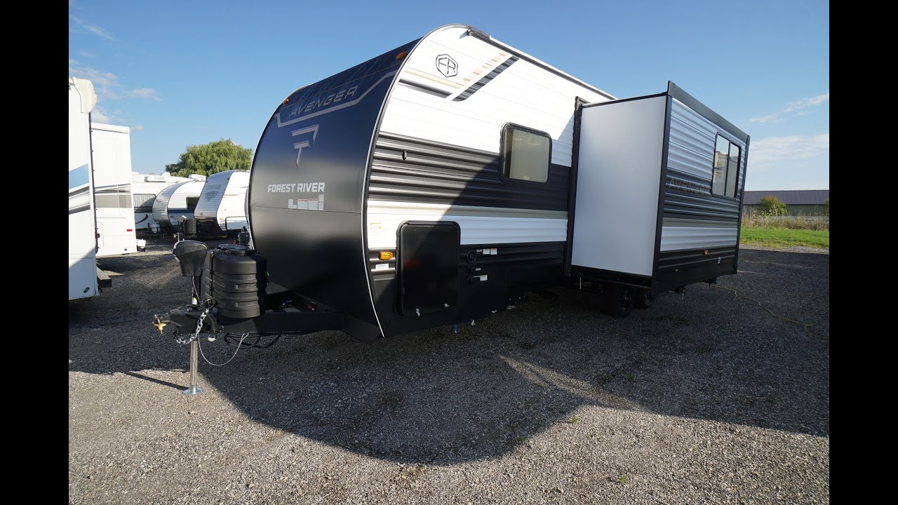 New 2026 Forest River Avenger 25MKO. A spacious couples floorplan, loaded with new features for 2026, like the drop frame for taller passthrough front storage, power stabilizer jacks, power tongue jack, Farmhouse style large sink with roll up draining rack and cup rinse feature, reflective gold tint windows for a cooler RV, windows in the end of the slide walls, and lots more! A travel trailer with unique features, this Avenger 25MKO offers washer/dryer prep and built in desk at under 30 feet floorplan! At only 29' 11" its the perfect size to slide into those 30 foot max campsites. 6153 lbs dryweight, which is reasonable tow for a full sized half ton truck. Outdoor fridge. Modern interiors, with washer/dryer prep closet beside the washroom, desk area, all kinds of storage basket areas, 12 Volt deep capacity fridge, island style dinette and 3 chairs, Sofa bed, large kitchen window, and under stove mounted air fryer microwave! Walk around front bed, with storage totes under the bed, plus an ottoman storage box as well that can be used by the couch. Shirt closets on both sides, with end tables in front of the storage closets, which is really smart, because that's where you want your phones, alarm clock, Cpap machines, etc. No more knocking all the stuff off your end table every time you open the shirt closet door! Come check out the brand new look and feel of the 2026 Forest River Rv trailers at Longhaul in Listowel!