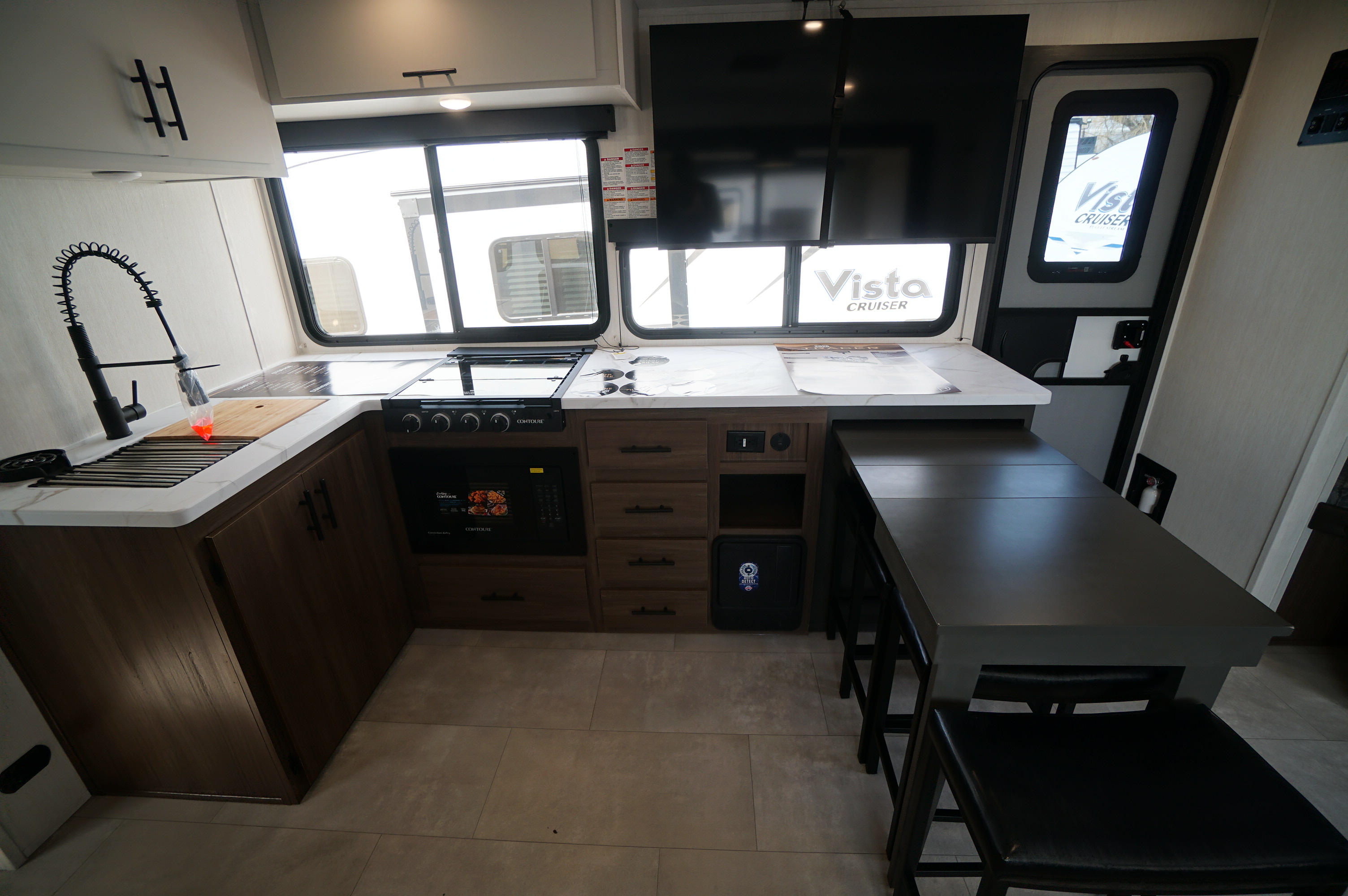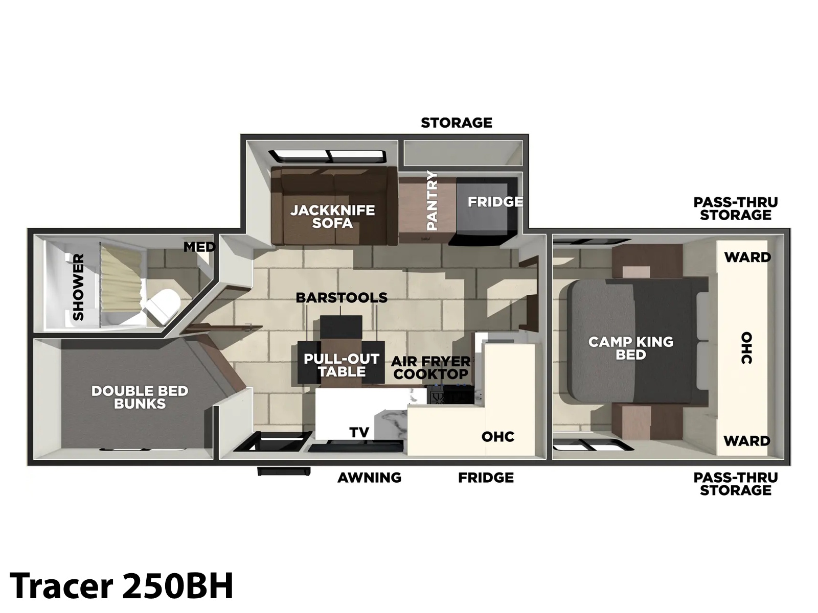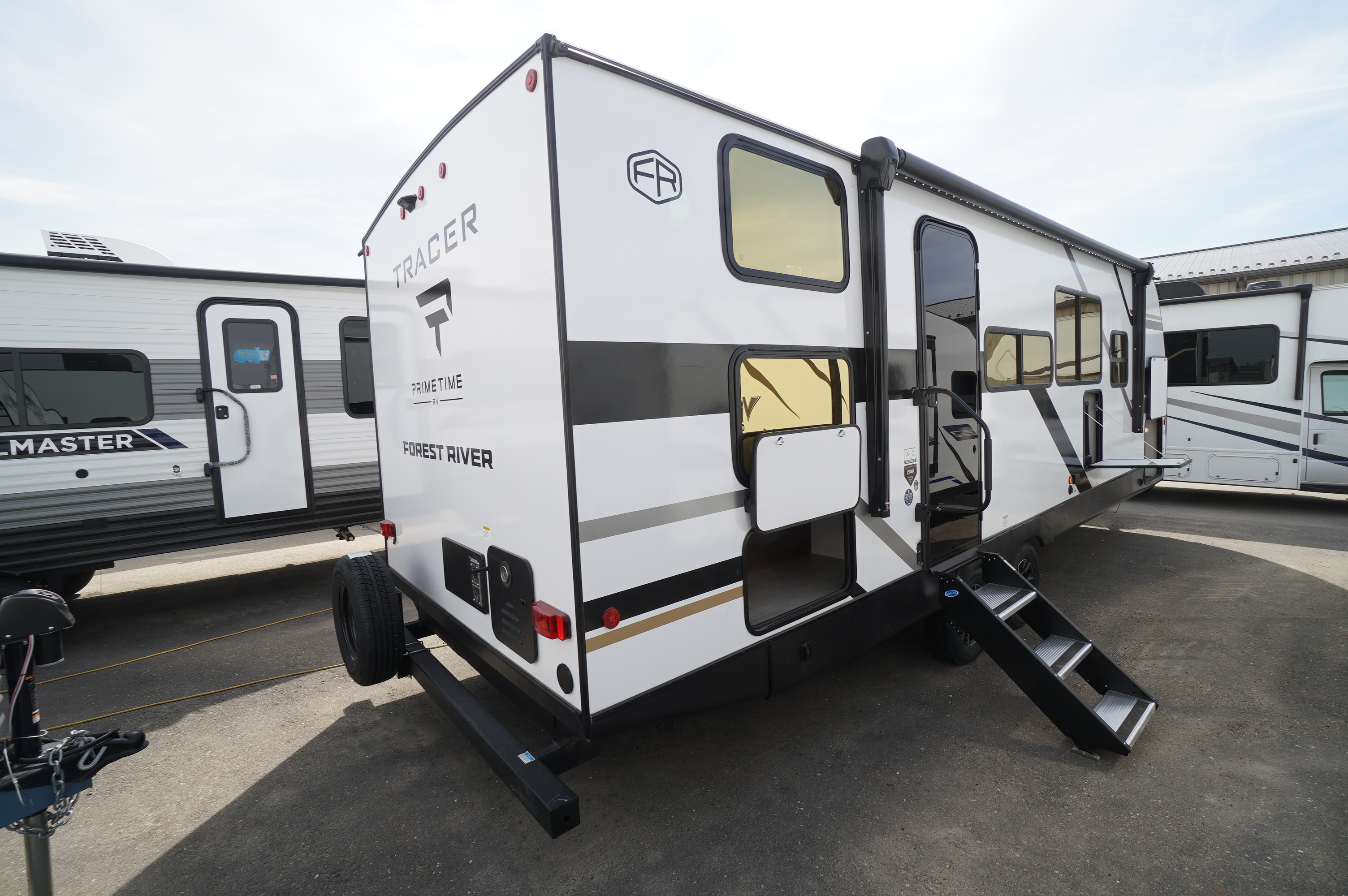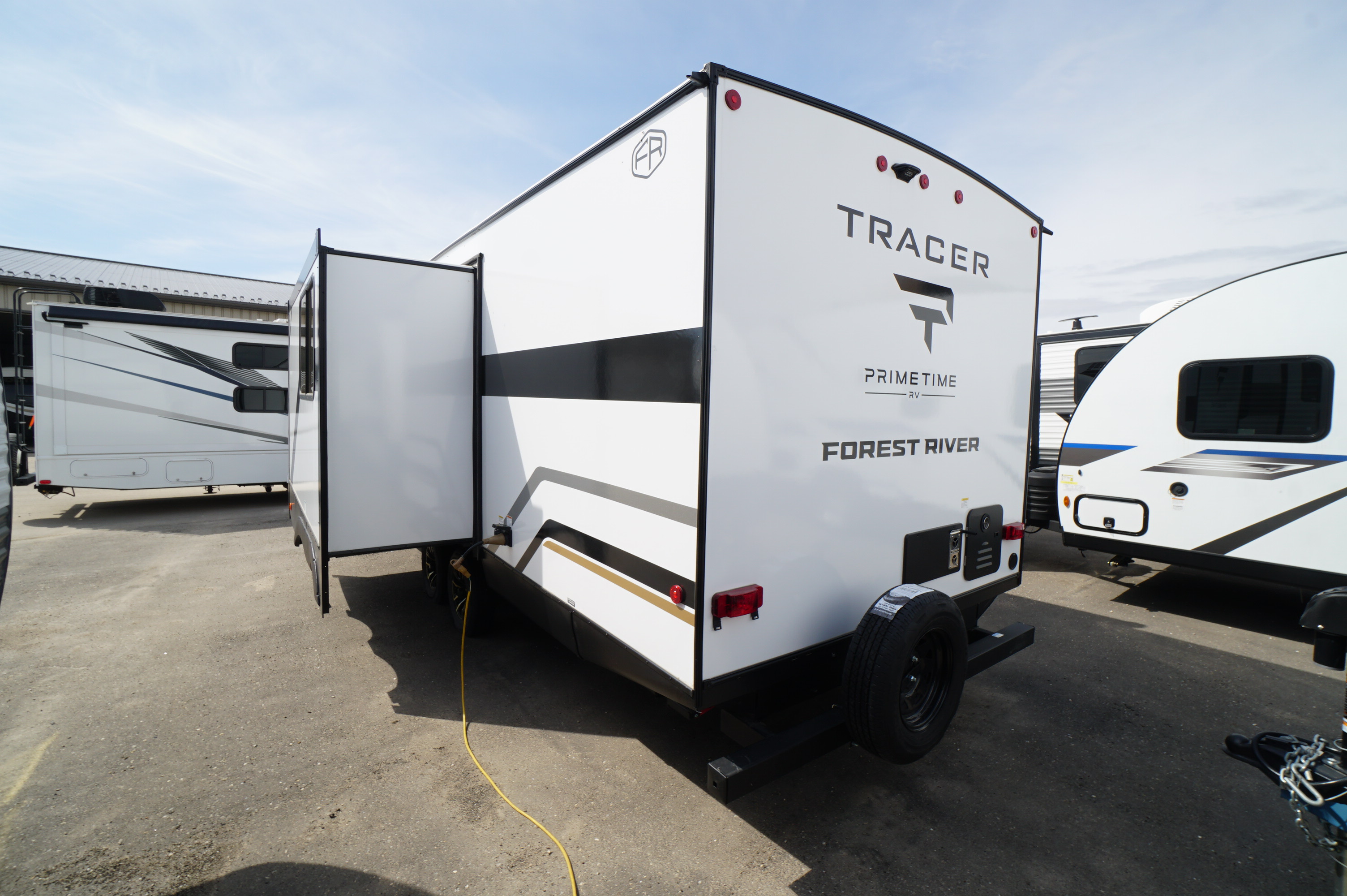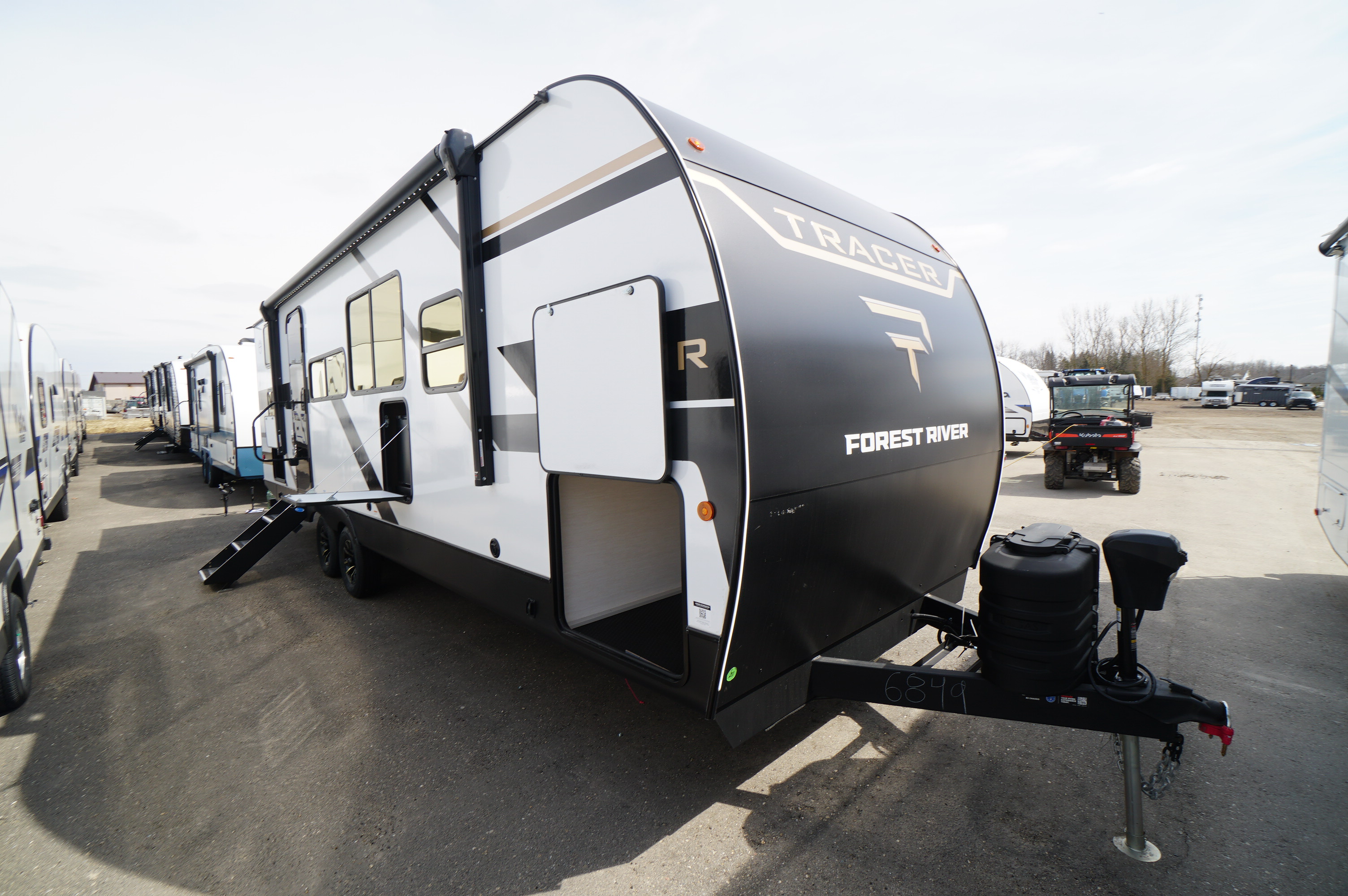 Check out the modern features of the new 2026 Tracer travel trailers! Camp King bed, reflective windows, pull out table with bar stools, outdoor fridge, Power jacks, solid entry steps and many others! Aluminum frame RV with vacuum bonded fiberglass exterior wall. 6068 lb dry weight. Come check it out at Longhaul in Listowel.