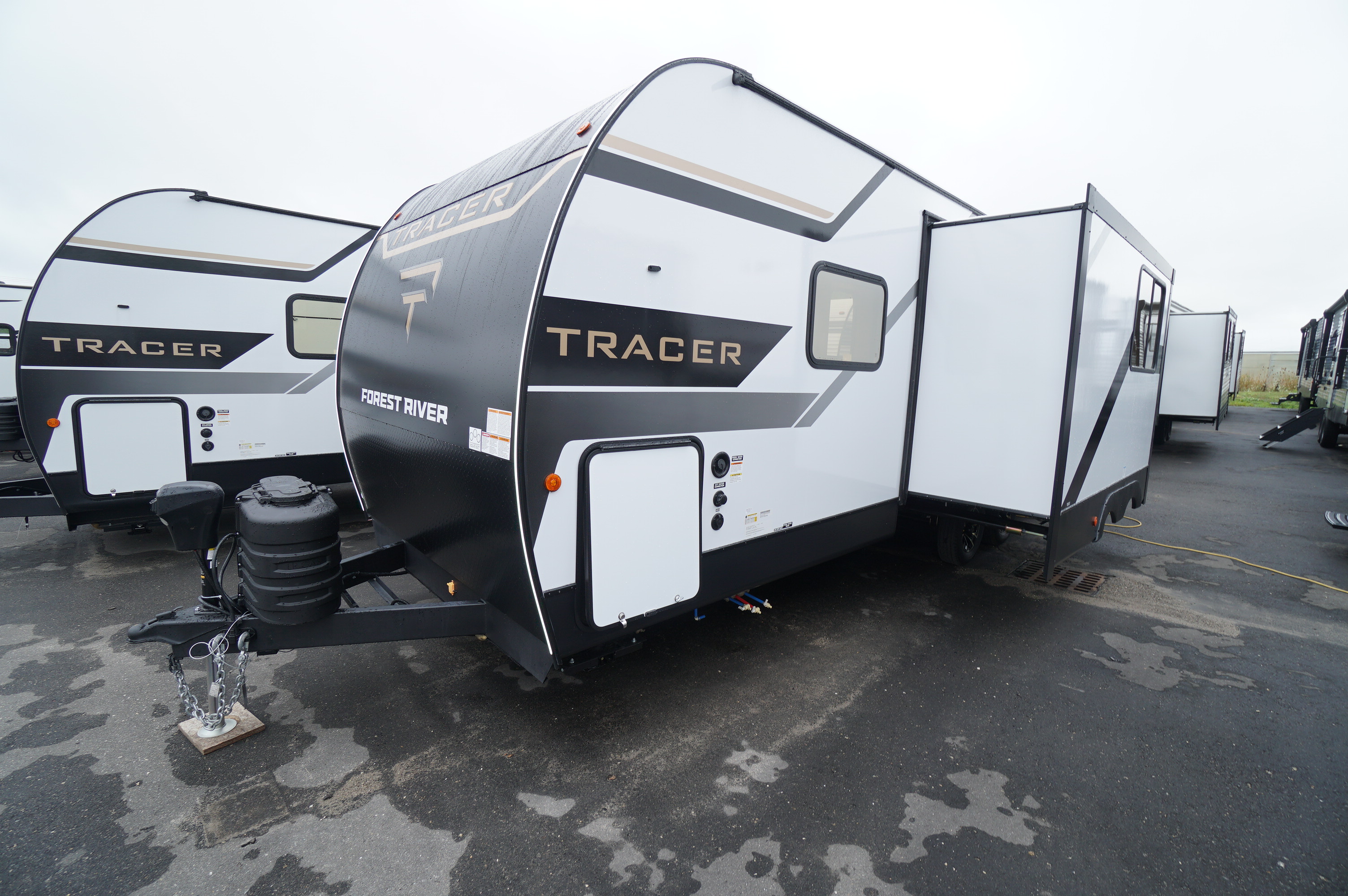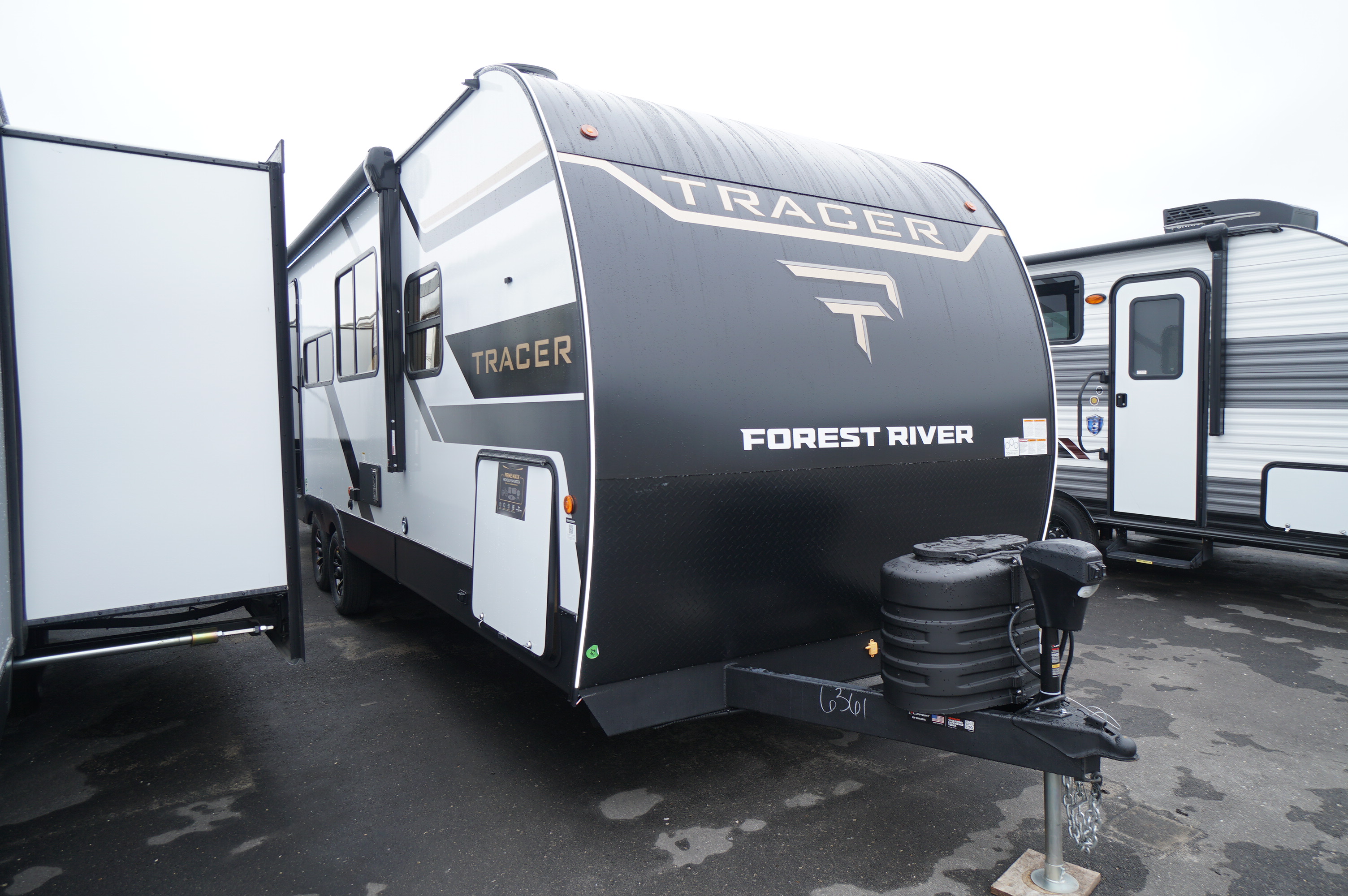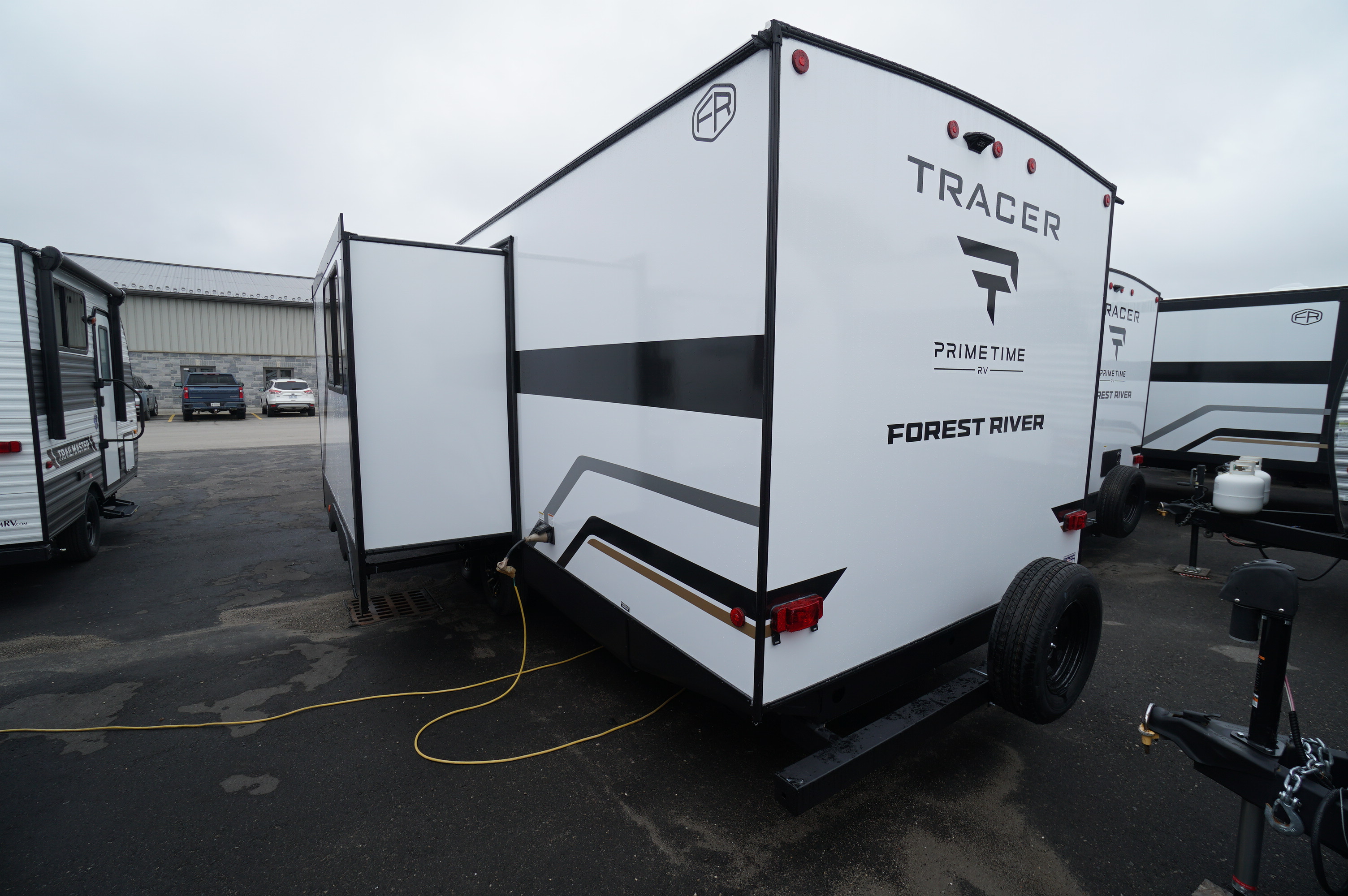 Couples 2026 Prime Time Tracer 255DS. Beautiful couples floorplan, easily towable with half ton trucks at a dry weight of only 5973 lbs. Camp King 66x74 front walk around bed, living room with sofa bed plus innovative pull out table with bar stools. Total of 4 bar stools, 3 for the table and one at the desk. Its a perfect blend of camping and work from home or seasonal site. With the linen closet plus washer and dryer prep closet at the back, you can make yourself at home away from home, with all you need! Pantry beside your fridge. Some great new features in these new 2026 Tracers, like the gold tint windows to keep your unit cooler. Under stove mounted air fryer microwave, allows you to have an amazingly tall kitchen window to enjoy the great out of doors when you're doing your food prep. Power tongue jack, power stabilizer jacks and power LED lit awning is all standard. Beautiful multi piece sink with cutting board sink cover, roll up drying rack, removable rinse sink, and a cup counter top mounted cup rinser. Solar panel on the roof is standard, to keep your fridge cooling at all times. The Tracer 255DS is a unique and compact option for couples and solo campers alike. The modular design of the kitchen dinette allows for it to expand into more countertop space or seating for up to 3. You also get the washer/dryer prep closet, and a desk, all in a package under 30 feet over all length! Come check out these innovative new Tracer travel trailers today! Great finance plans are available, and trade ins are welcomed.