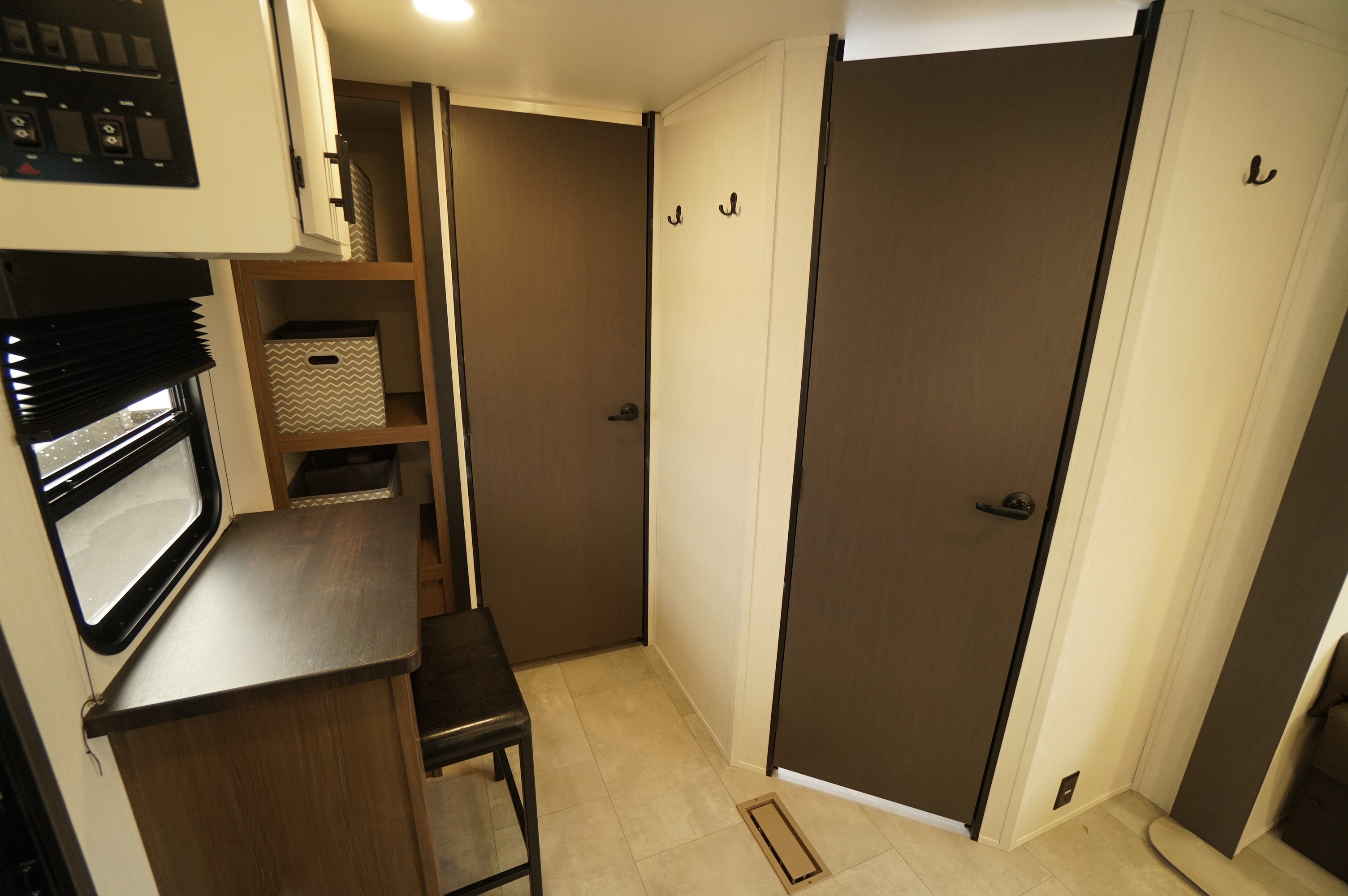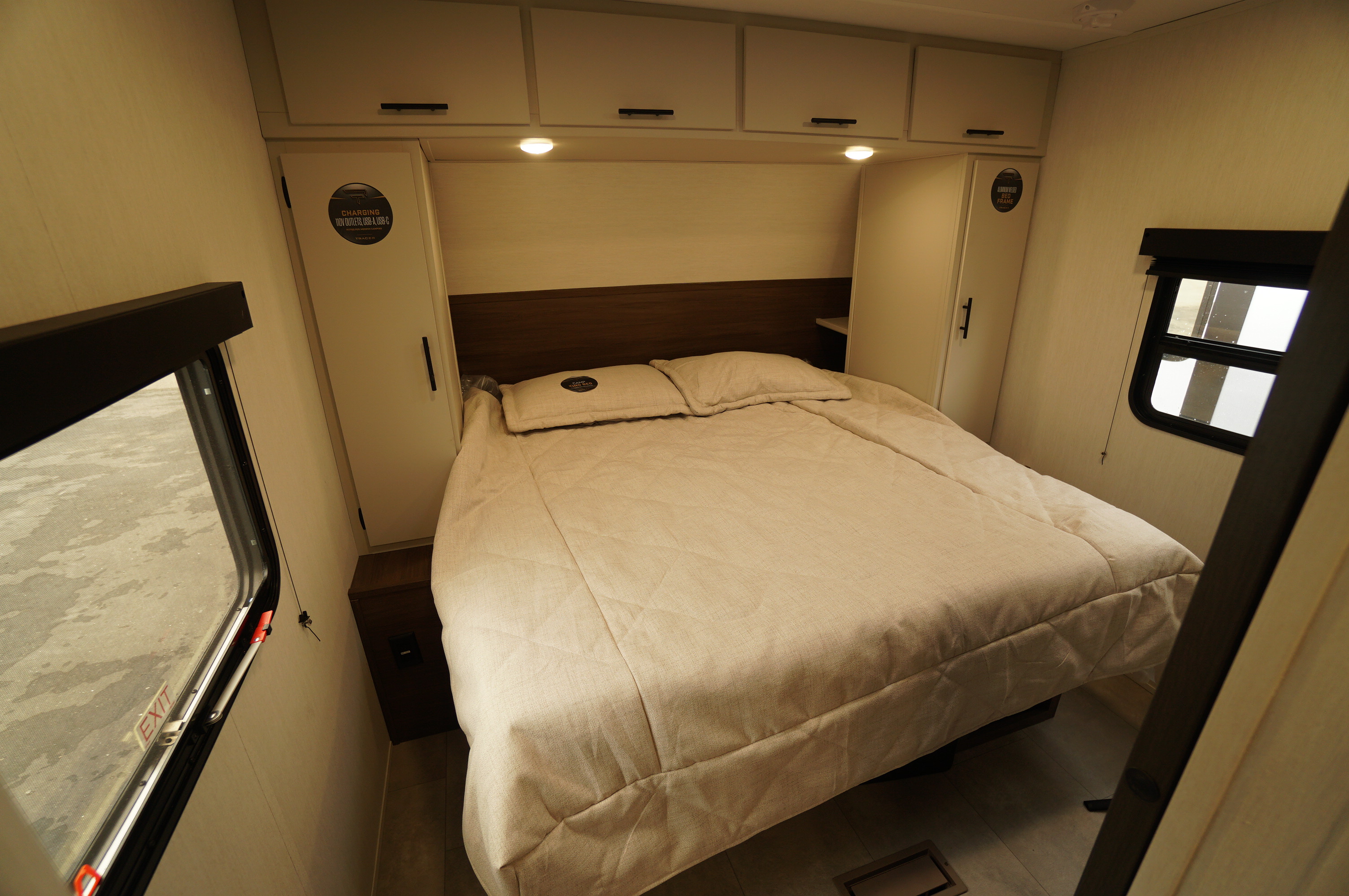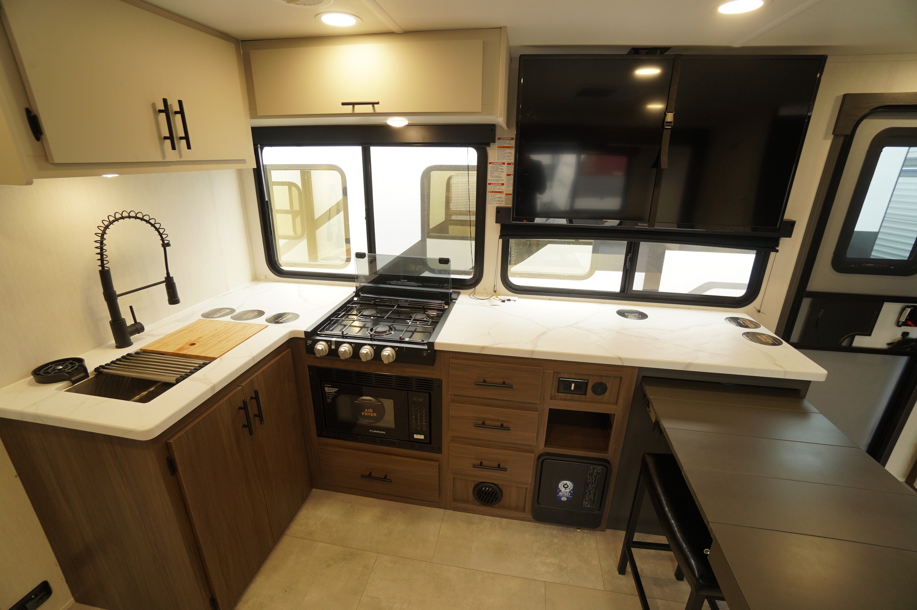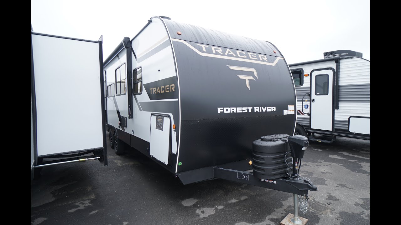 Couples 2026 Prime Time Tracer 255DS. Beautiful couples floorplan, easily towable with half ton trucks at a dry weight of only 5973 lbs. Camp King 66x74 front walk around bed, living room with sofa bed plus innovative pull out table with bar stools. Total of 4 bar stools, 3 for the table and one at the desk. Its a perfect blend of camping and work from home or seasonal site. With the linen closet plus washer and dryer prep closet at the back, you can make yourself at home away from home, with all you need! Pantry beside your fridge. Some great new features in these new 2026 Tracers, like the gold tint windows to keep your unit cooler. Under stove mounted air fryer microwave, allows you to have an amazingly tall kitchen window to enjoy the great out of doors when you're doing your food prep. Power tongue jack, power stabilizer jacks and power LED lit awning is all standard. Beautiful multi piece sink with cutting board sink cover, roll up drying rack, removable rinse sink, and a cup counter top mounted cup rinser. Solar panel on the roof is standard, to keep your fridge cooling at all times. The Tracer 255DS is a unique and compact option for couples and solo campers alike. The modular design of the kitchen dinette allows for it to expand into more countertop space or seating for up to 3. You also get the washer/dryer prep closet, and a desk, all in a package under 30 feet over all length! Come check out these innovative new Tracer travel trailers today! Great finance plans are available, and trade ins are welcomed.