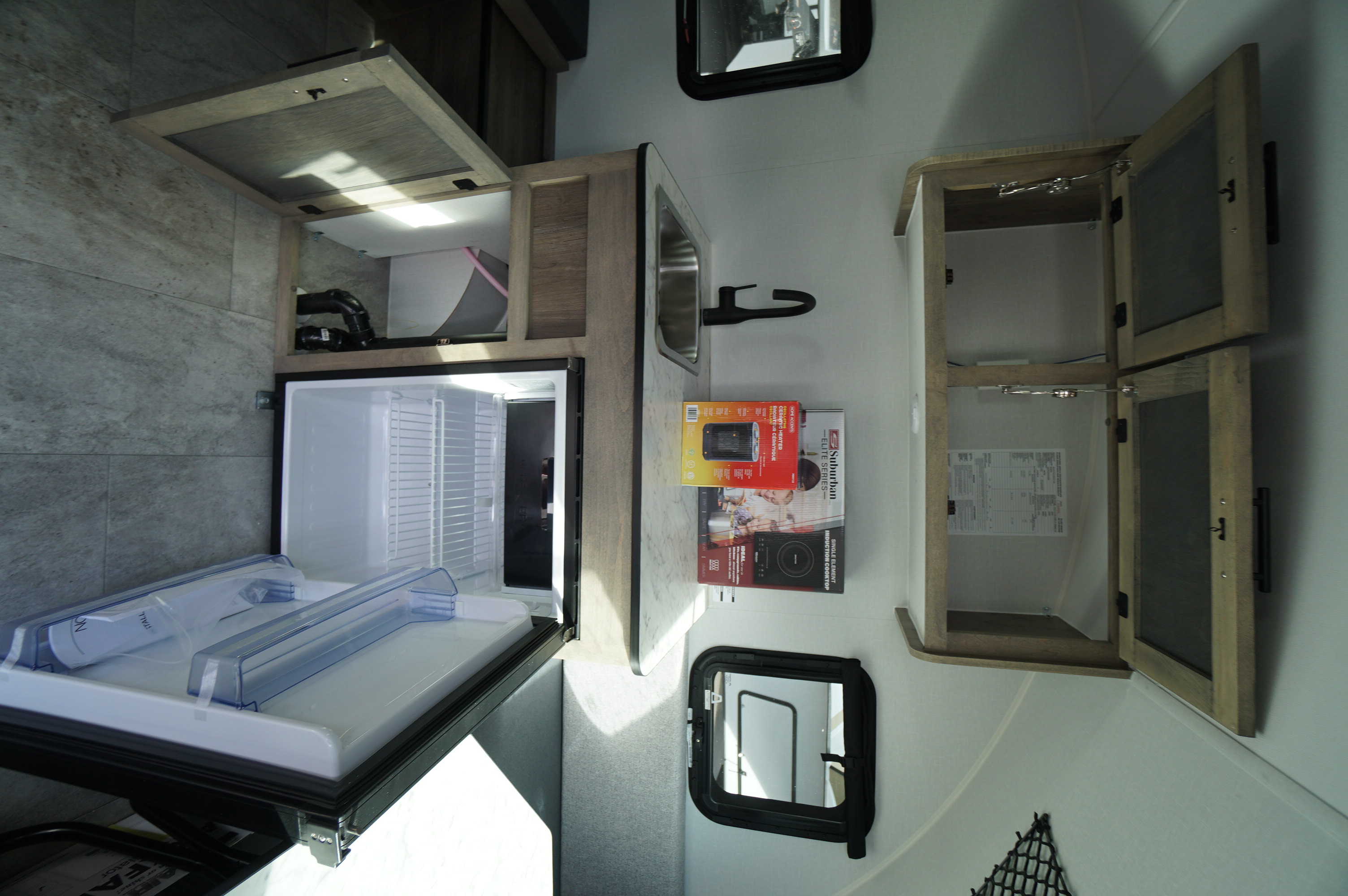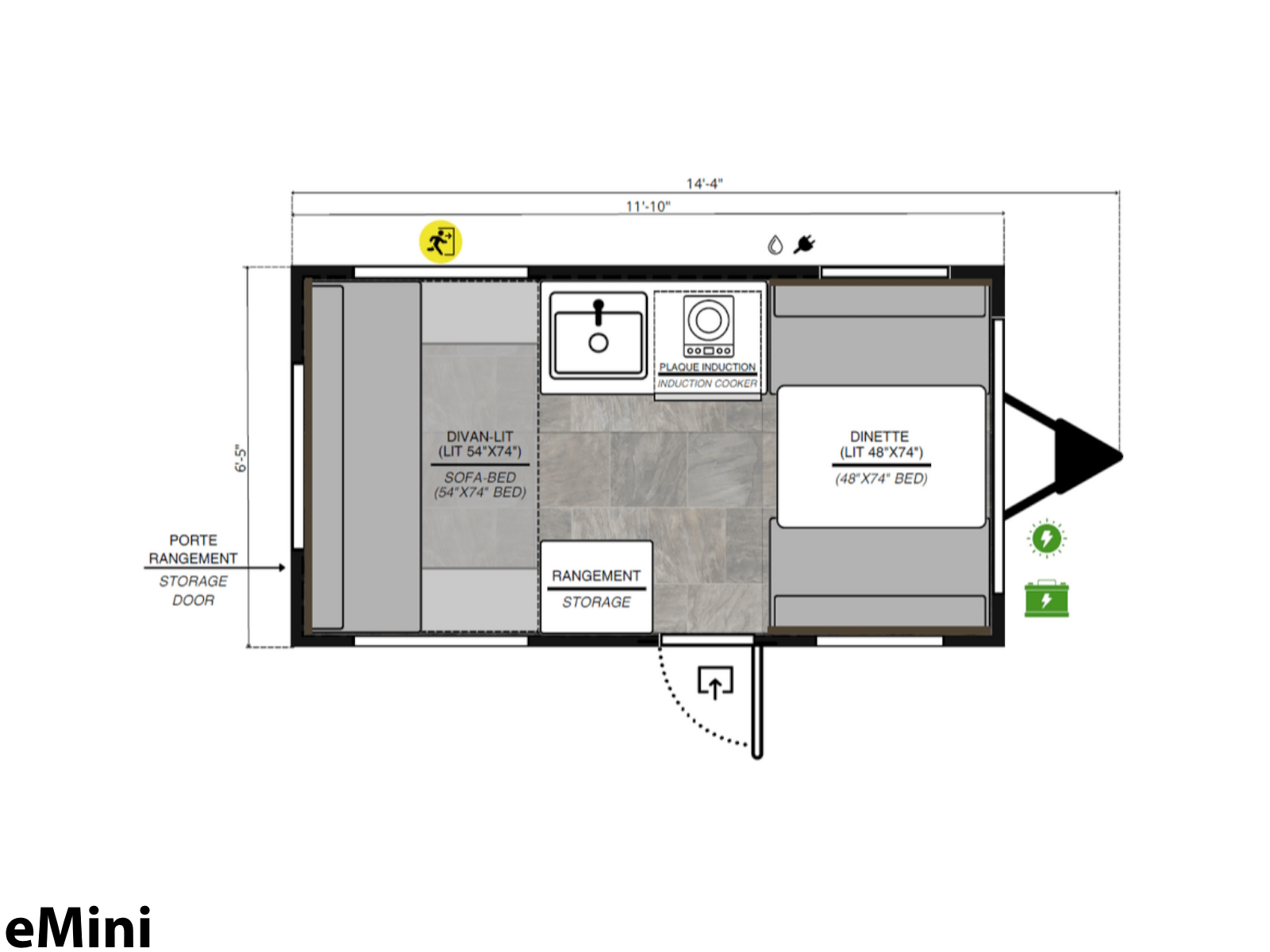 Based on our popular Mini model, the eMini offers all the same amenities: 2 folding beds, heating, a stove, a sink, and shelf tables. But it does away with propane tanks and powers this all with the help of Mother Nature: 2 solar panels provide all the power you need!