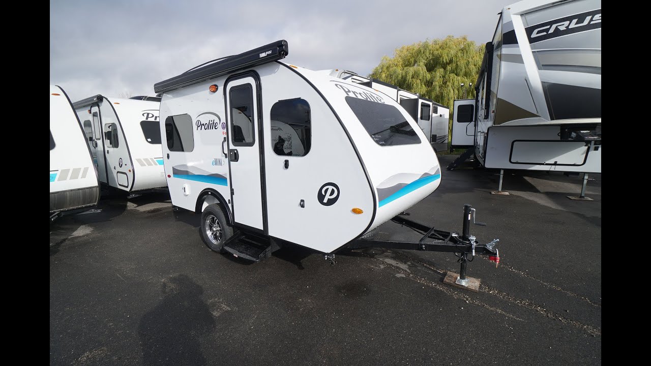 All electric super light weight fiberglass camper trailer! This is the favourite Mini floorplan, but for those who hate the open flame, or don't like to worry about their propane tank. Let the sun fill you up! The Prolite E Mini is a 4 person camper trailer, with a dinette for 4 in the front of the trailer, and a sofa bed in the back. Sleeps and sits 4, with a kitchen center with sink, 12v fridge and electric induction single burner cook top. All weighing only 1265 lbs dryweight. Lots of windows, and a 3 speed roof vent fan for ventilation. Hard shell easy crank out porch awning. Prolites are Made in Canada light weight RVs for cars and SUVs and mini vans. More features of this trailer include the spare tire, aluminum rims, pull out entry step, one piece fiberglass front, roof and back. Streamlined and Light Weight for ease of travelling. Outdoor and indoor storage areas. Outdoor coldwater only shower, as this unit does not have a water heater. Very little maintenance required, with a portable 110v heater and hot plate, and the 12v mini fridge. Trailer has a 2 door wardrobe closet, magnetic black out window shades, and overhead storage areas above the rear bed and above the sink. Stop in at Longhaul in Listowel and check out our amazing selection of Prolite trailers!