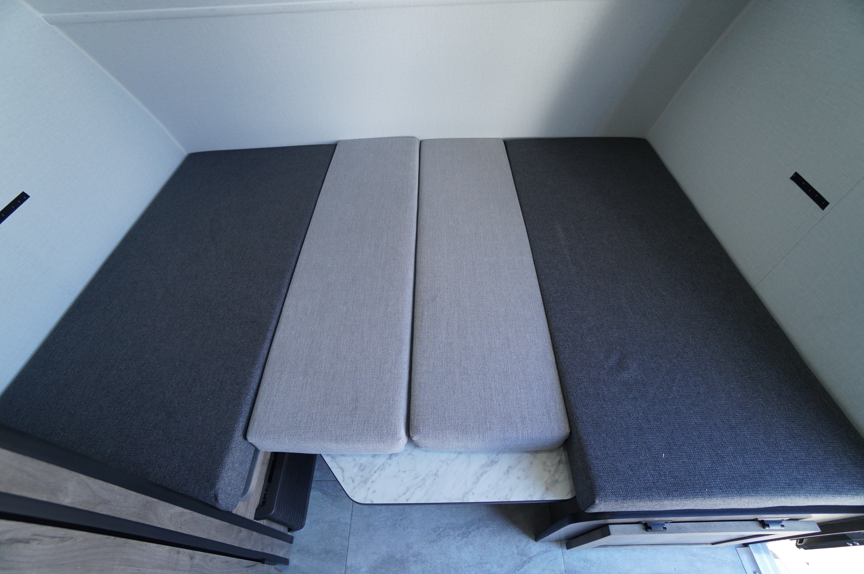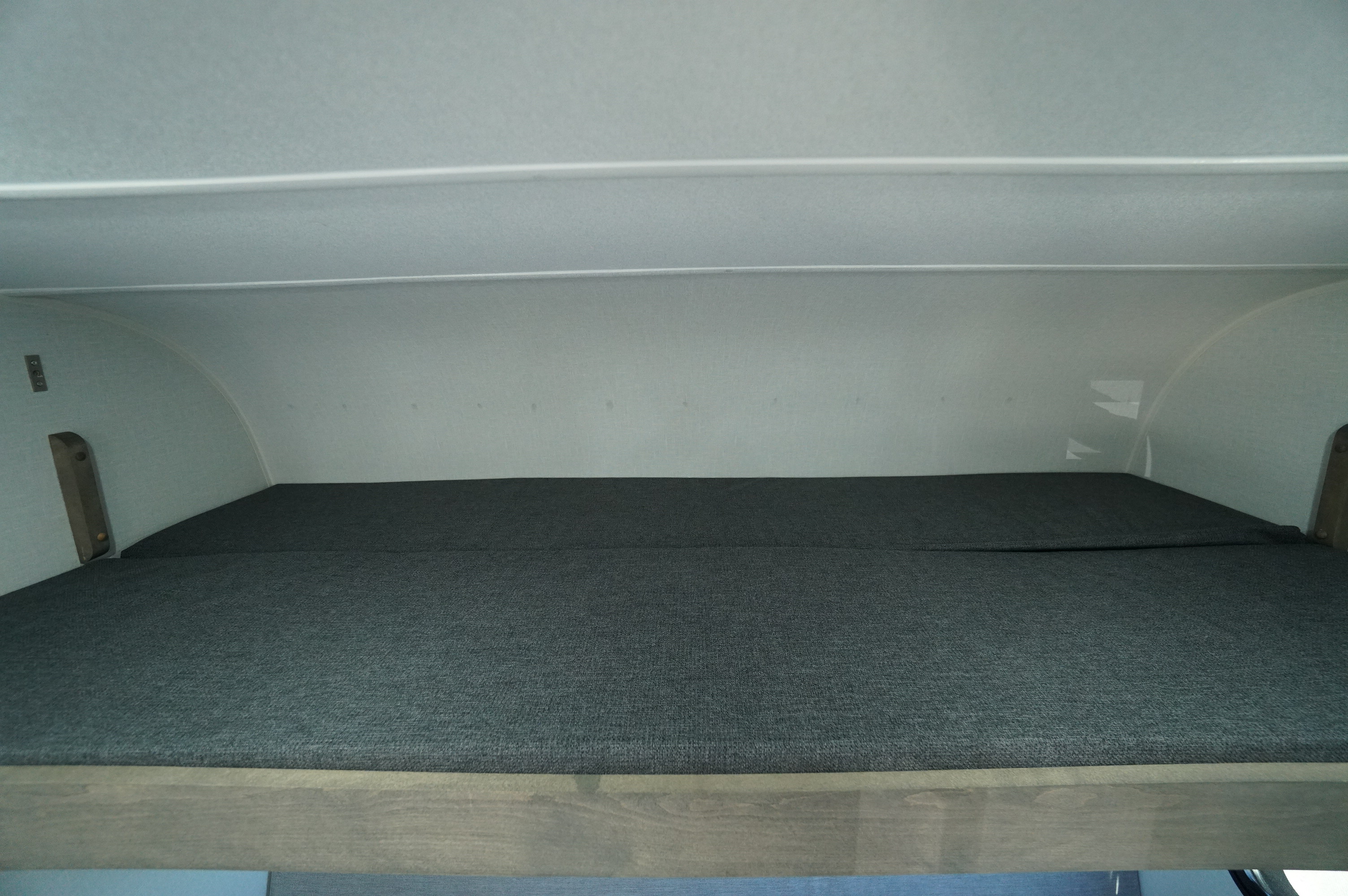 With its two convertible adult beds and a bunk bed for children under 125 lb, it comfortably accommodates 4 to 5 campers. Its practical layout includes a cooking area, a compact refrigerator, a toilet, and a shower — the basics for traveling in simple, functional comfort.