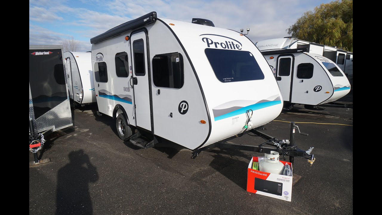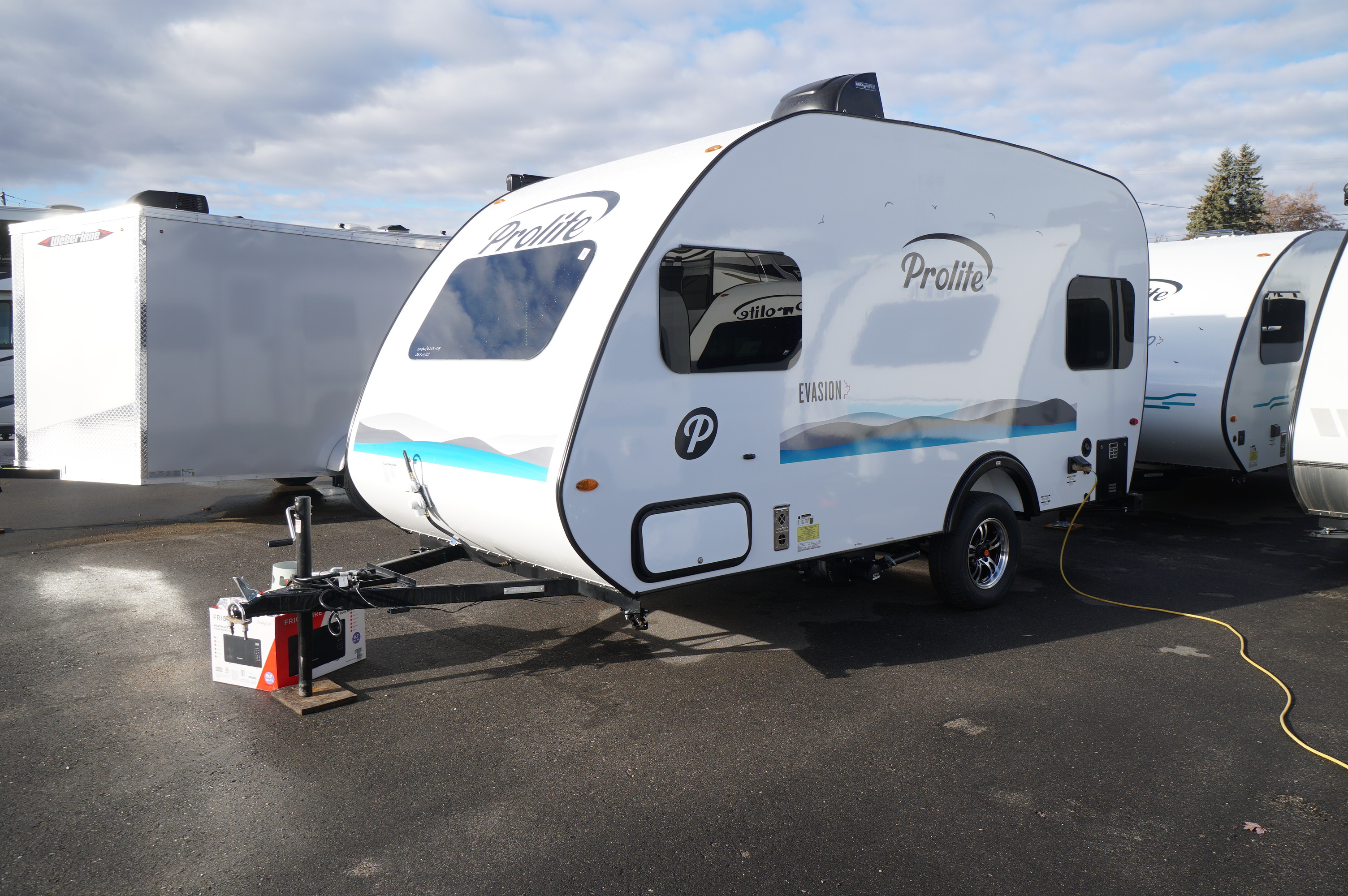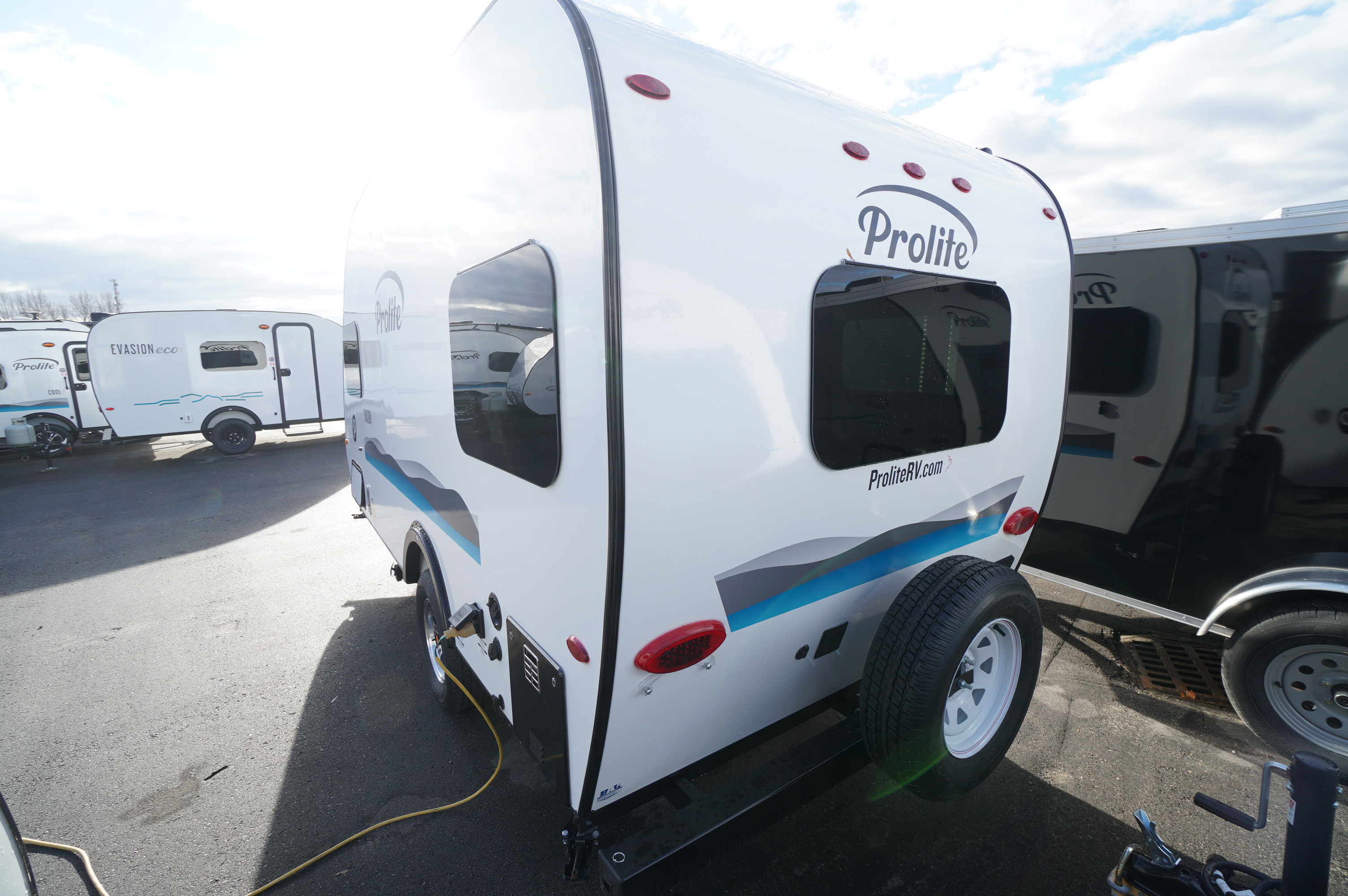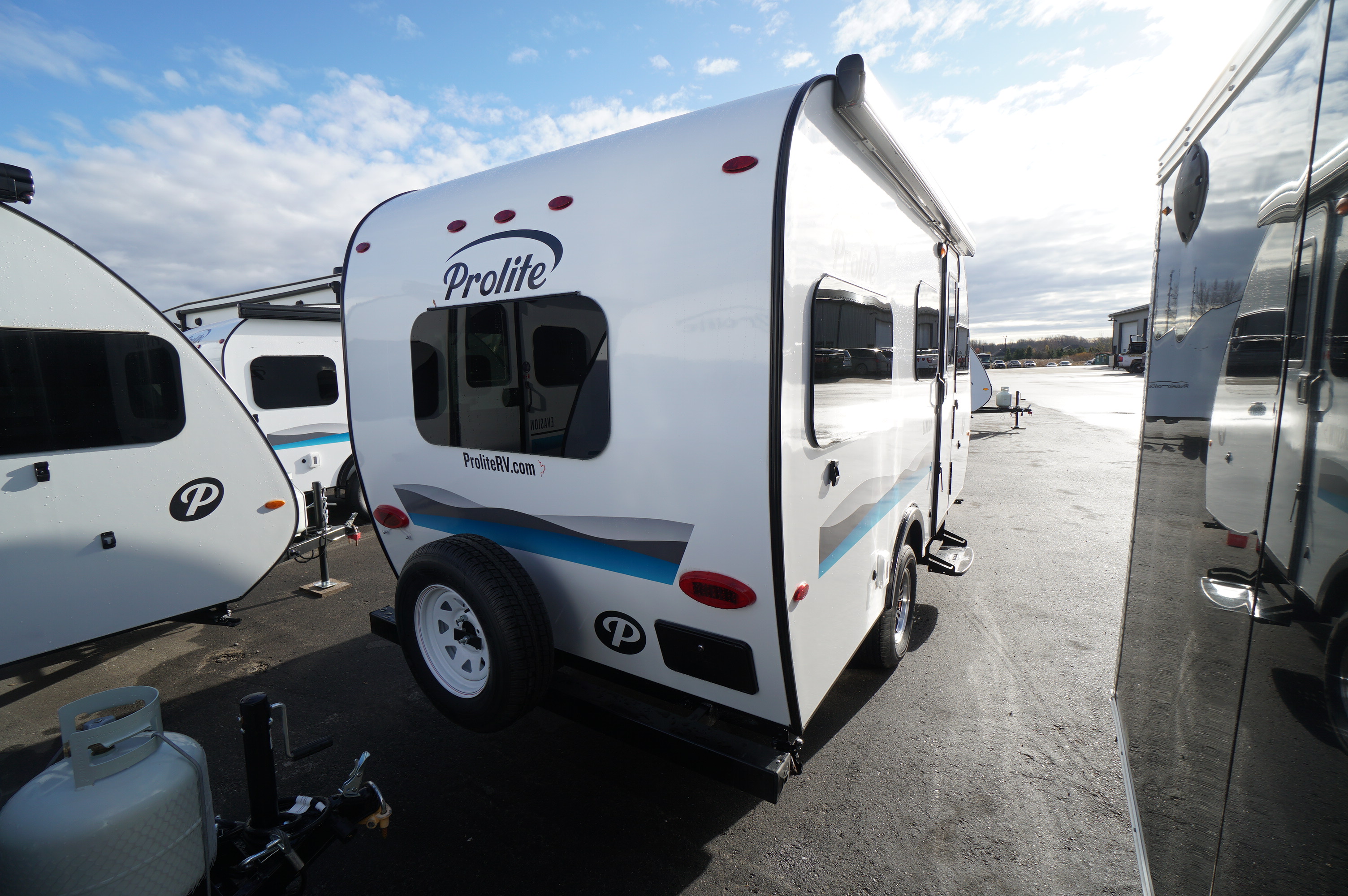 This particular model is in stock with roof top air conditioning and the radio. This 2026 also comes standard with 100W Rooftop solar. With the A/C that bumps the dry weight up to 2040 lbs. But its still an easy tow trailer! A fully equipped camper for 5 people! Prolites are Canadian built RVs, specifically designed for mini vans and mid size SUVS. Built narrow and low for easy towing, yet sufficient road clearance for anywhere a mini van can go, and standing height inside. Fiberglass travel trailer, with one piece front, top and back. Easy crank out hard shell awning. Roof top solar, 12v fridge, rear mounted spare tire, outdoor shower, propane furnace, air conditioning, and much more. Lots of screen windows, and a screen door. Sleeping for 5 including the convertible top cabinet bunk bed.
