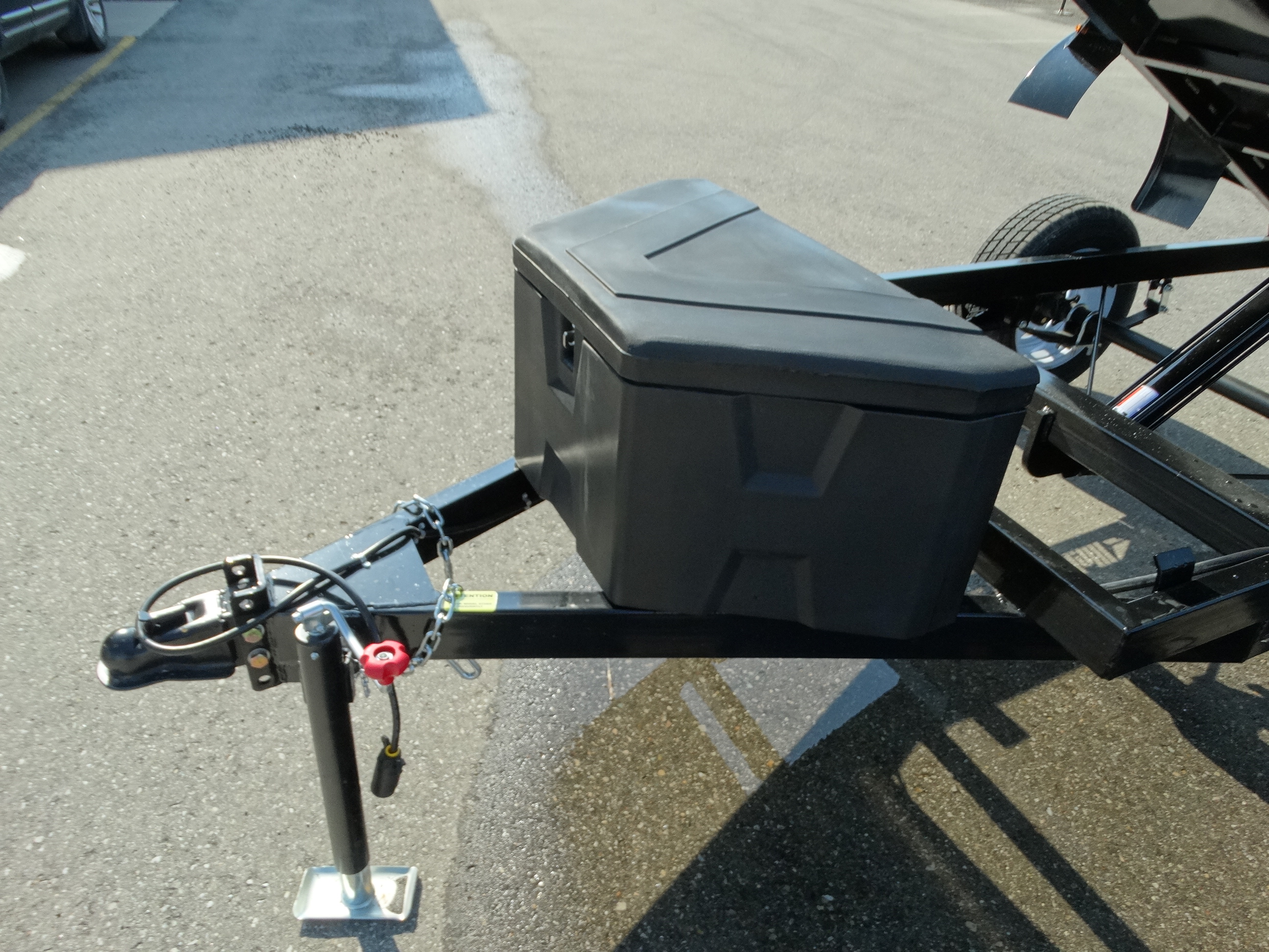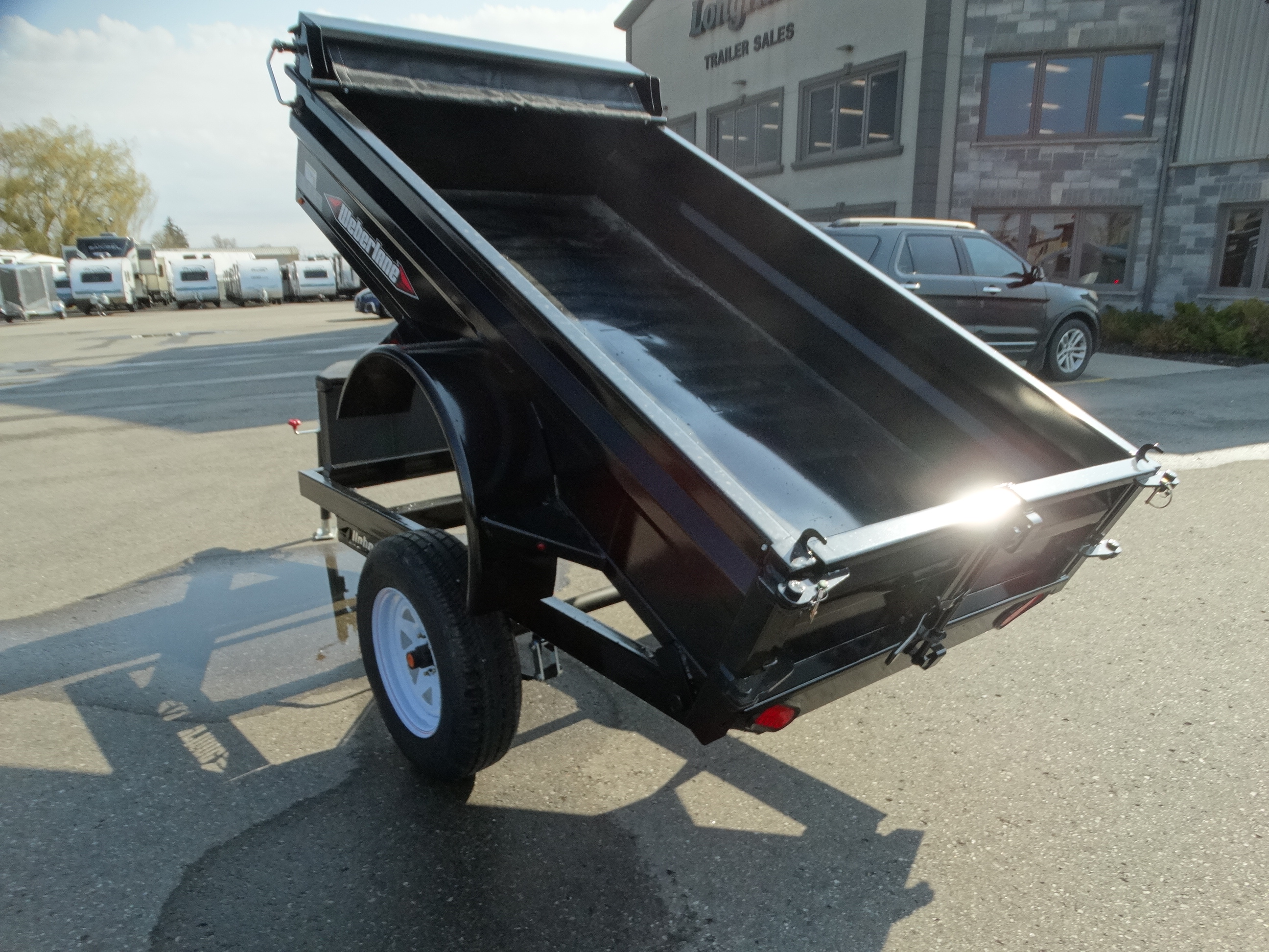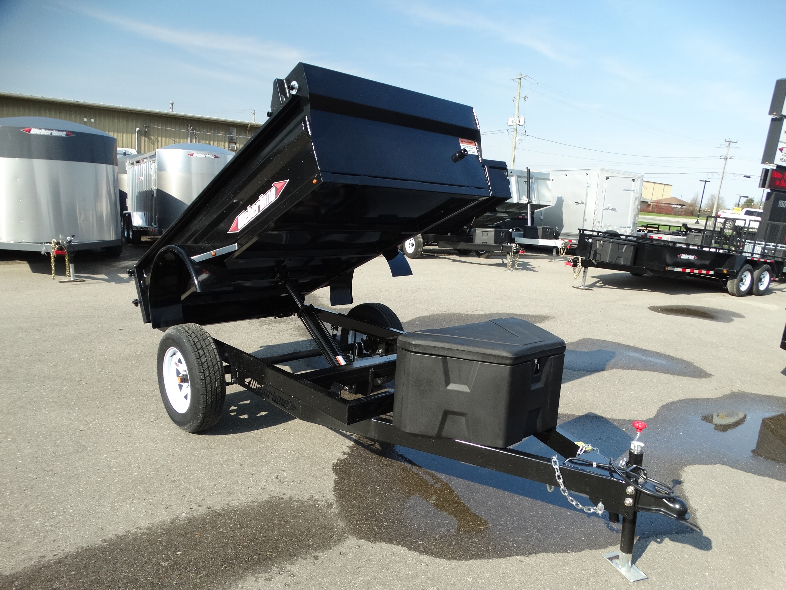 Come check out this 50'' x 8 dump trailer. This trailer has a single 3500 lb axle with a payload of around 1900 lbs. It has 18'' sides with gussets to add some height if you want. There is a front mount roll tarp, and front tongue box with a remote and battery included. Front jack, and safety chains are also included. Come take a look today!
