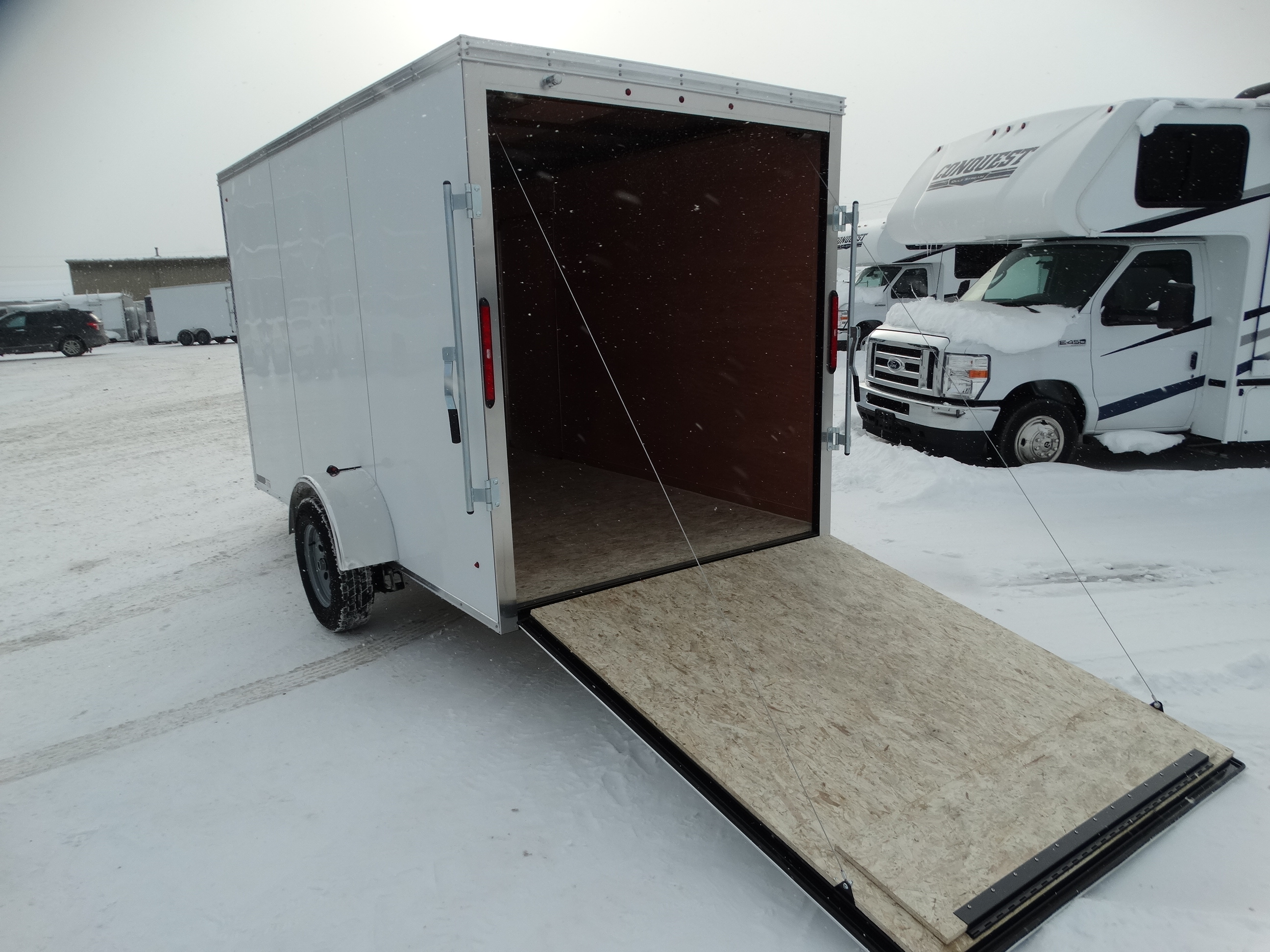 Come check out this 6x12 enclosed trailer! These don't stay in stock long! This trailer has a single 3500 lb axle with a payload of around 1700 lbs. It has an interior height of 78'', rear ramp door, a side door, an interior light, as well as a front jack and safety chains. Come take a look today!