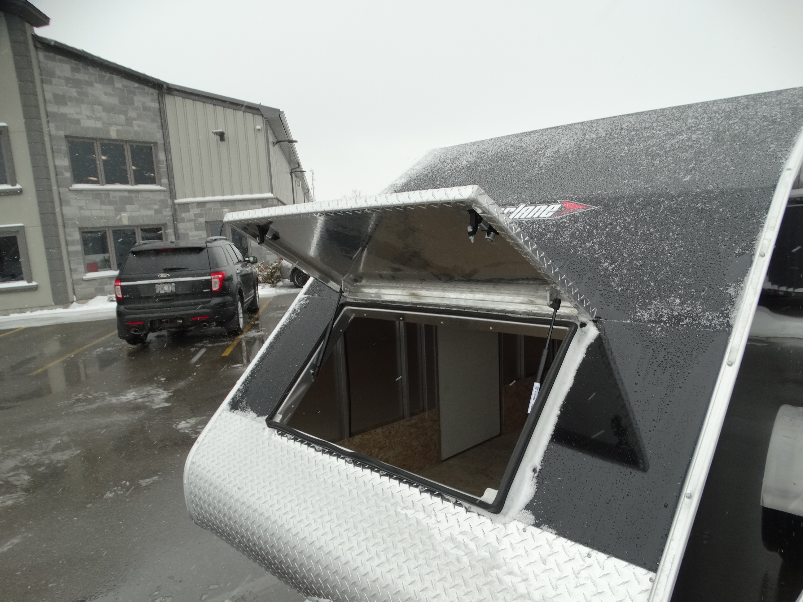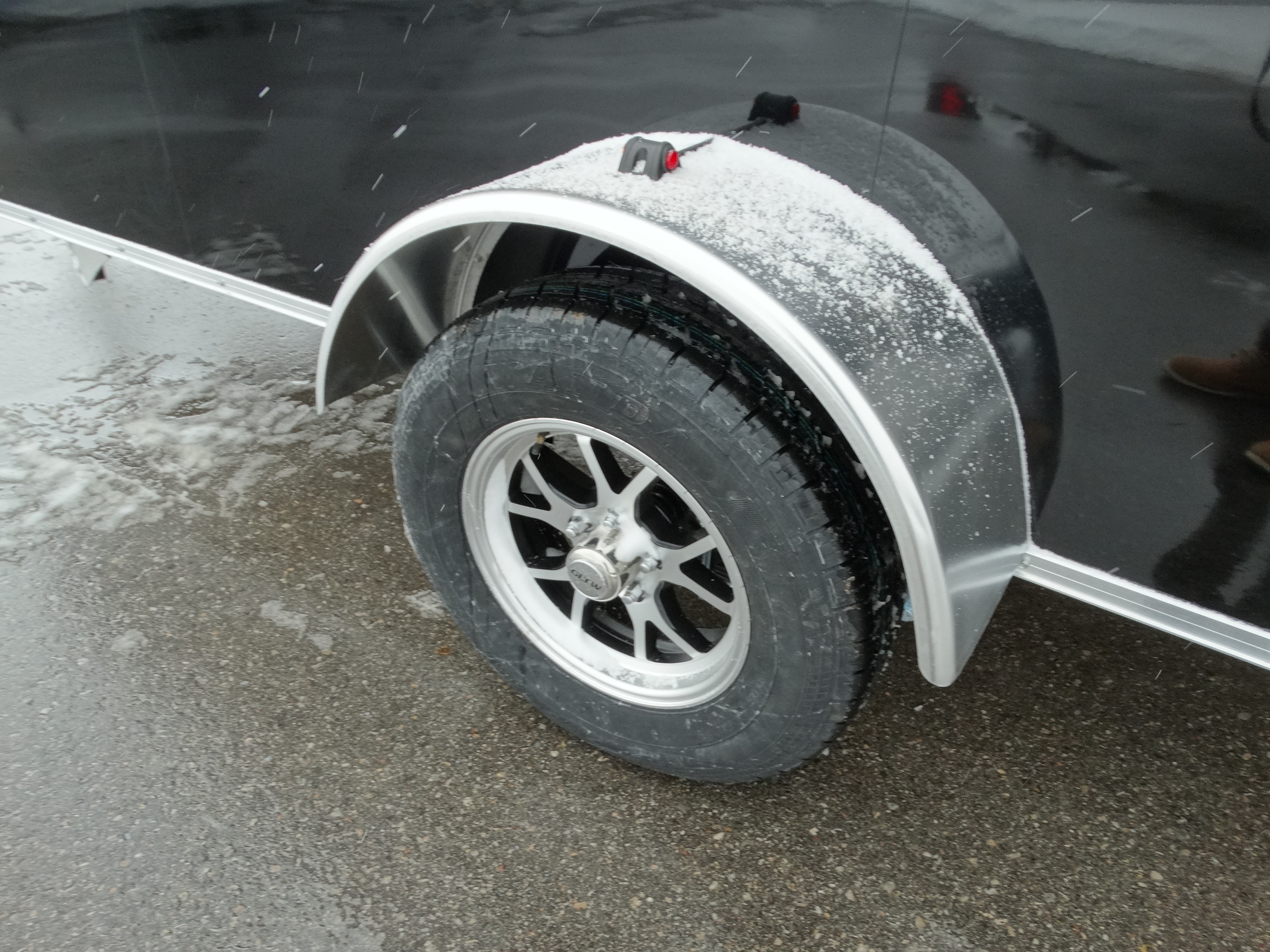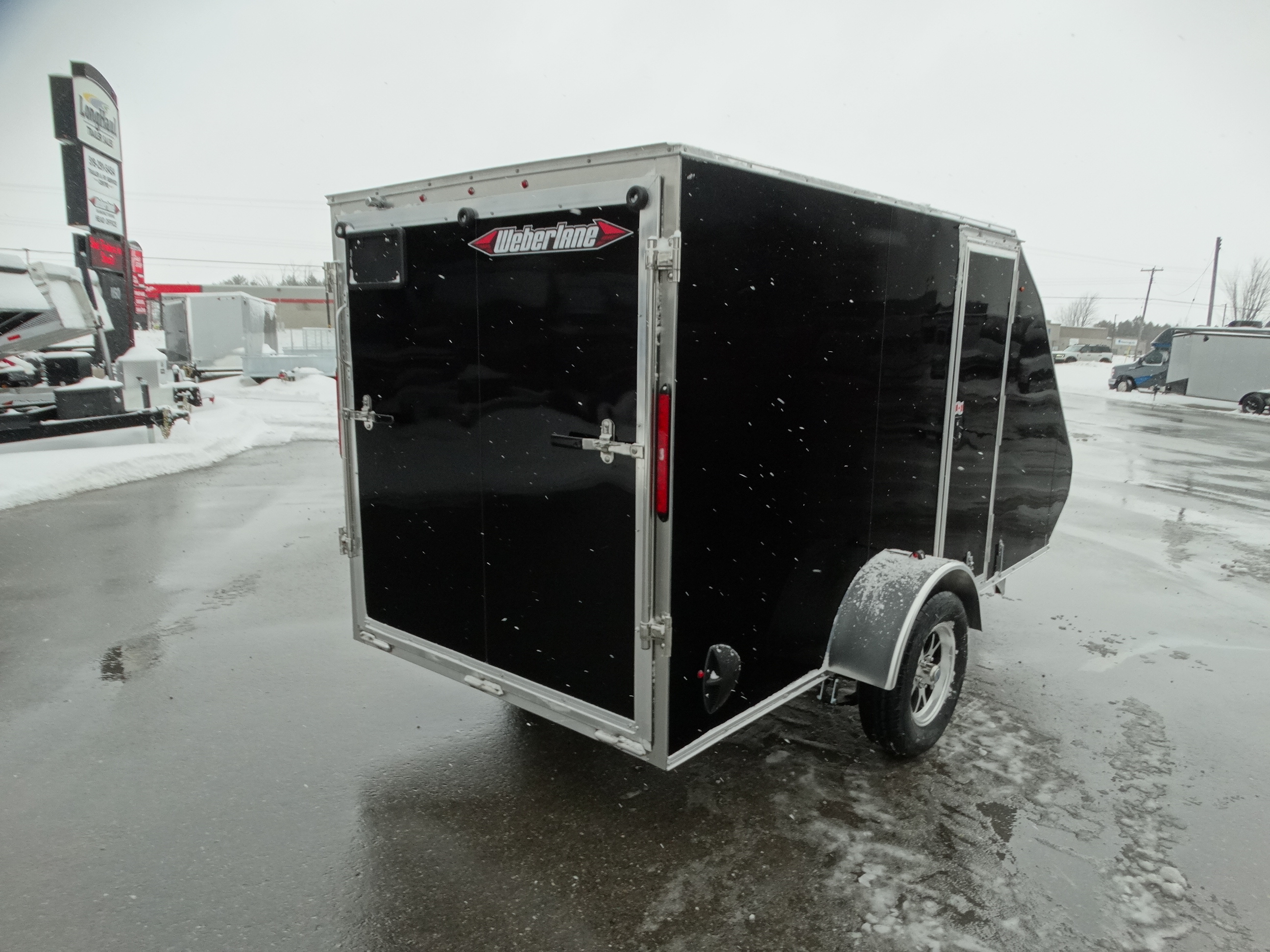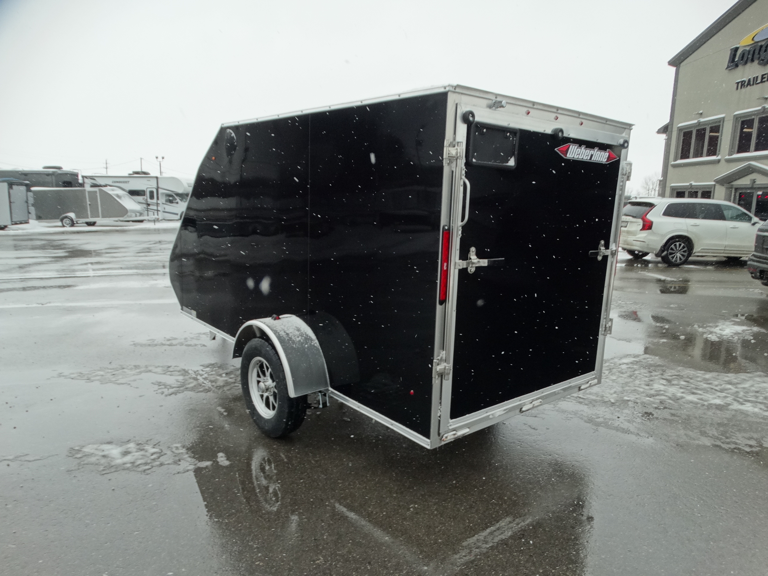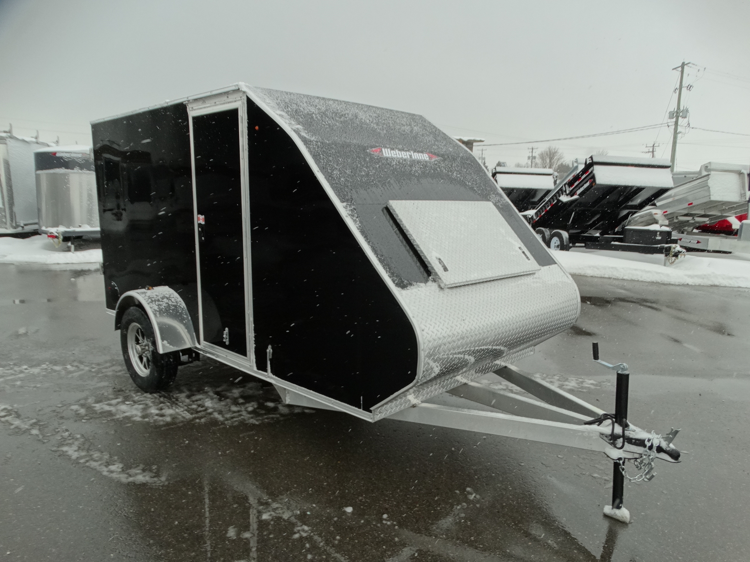 Come check out this little sled trailer! This 5 1/2 x 12' aluminium trailer is perfect for 1 sled. It will tow great behind your vehicle, and it has a single 3500 lb axle with aluminium rims and a payload of around 2000 lbs. It has a rear ramp, d-rings, front hatch, side RV style door, front jack and safety chains. Come take a look today!