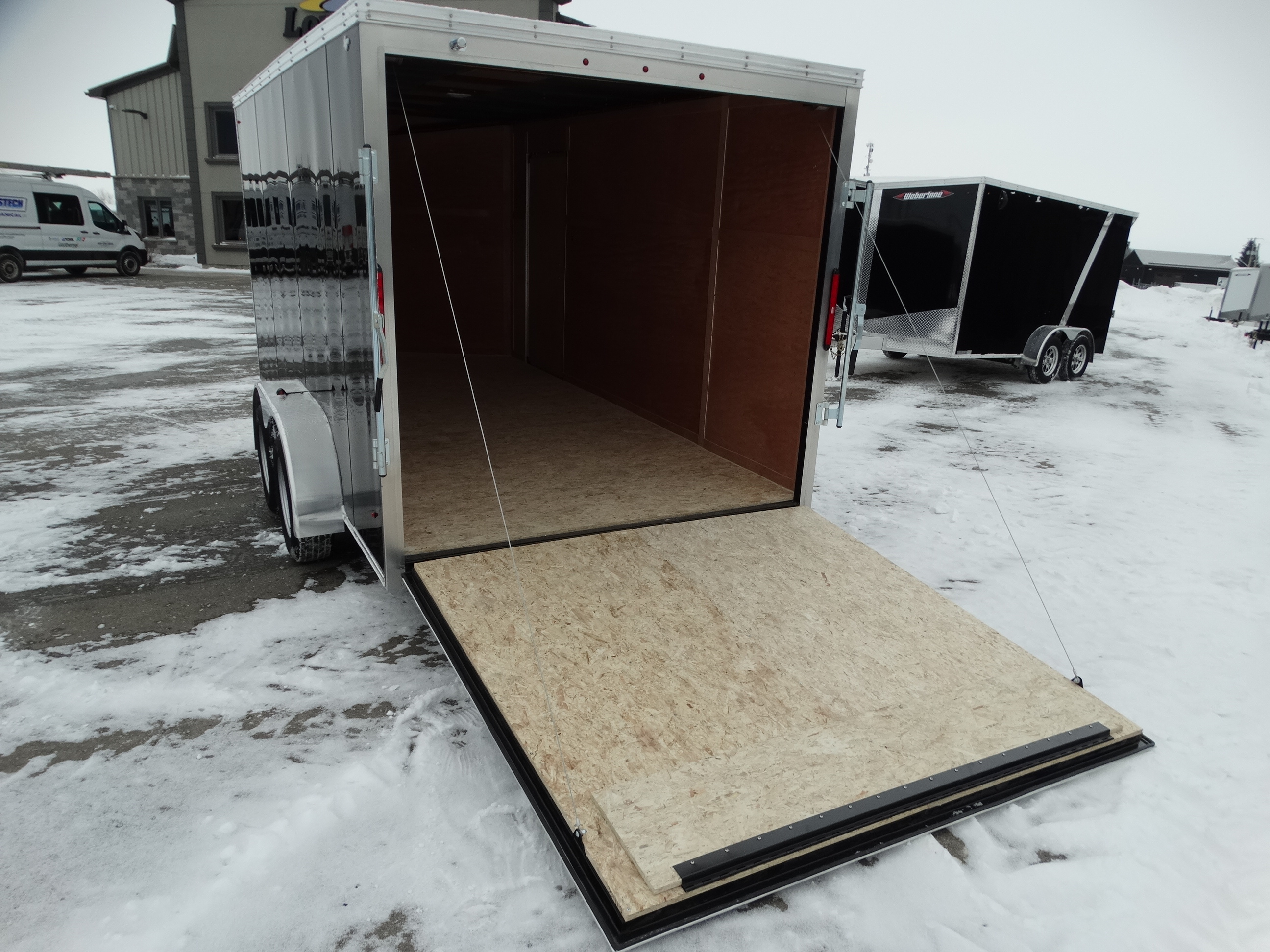 Come check out this 7x14 enclosed trailer! These don't stay in stock long! This trailer has tandem 3500 lb axles with electric brakes and a payload of around 4900 lbs. It has an interior height of 78'', rear ramp door, a side door, an interior light, as well as a front jack and safety chains. Come take a look today!