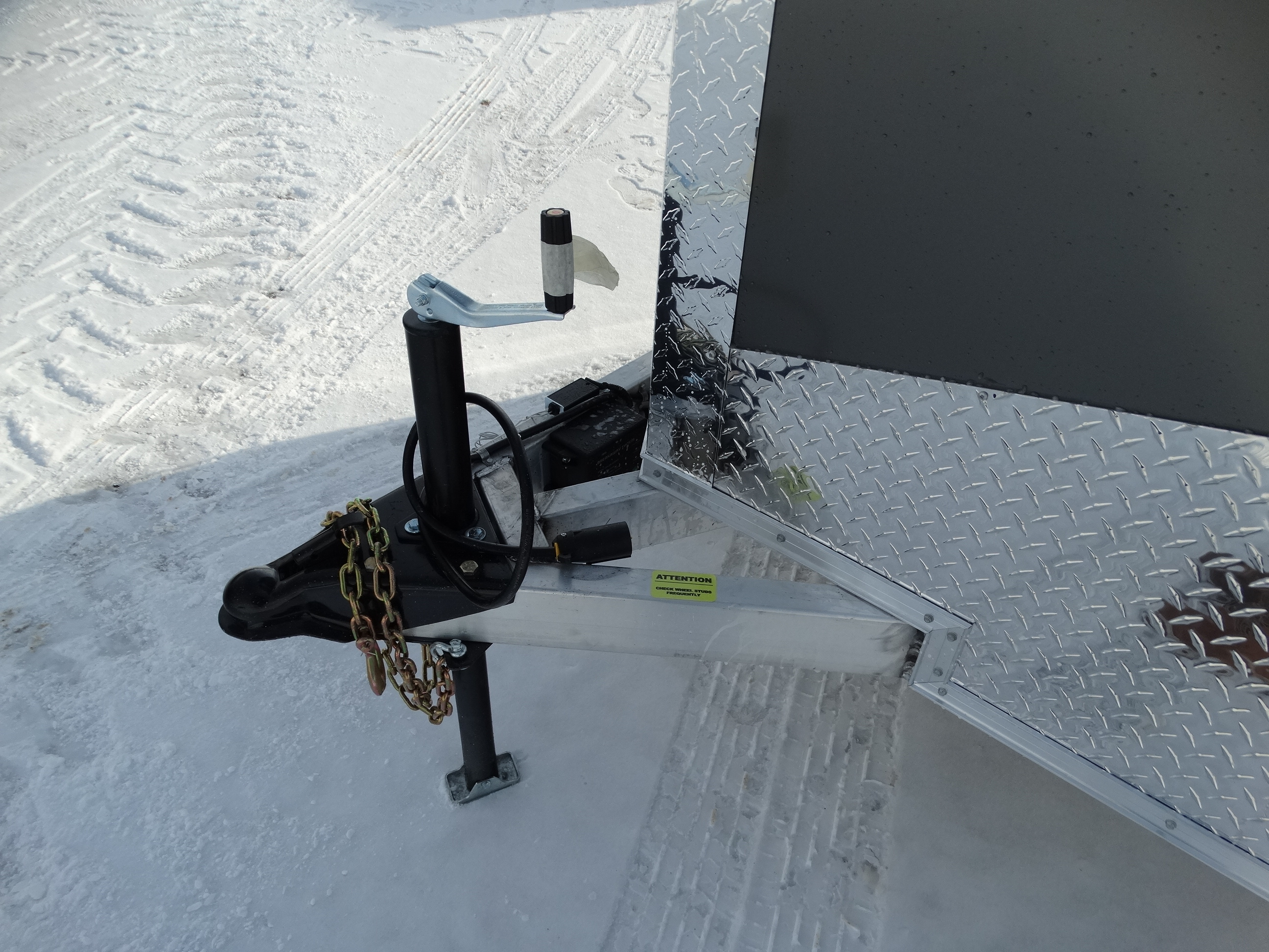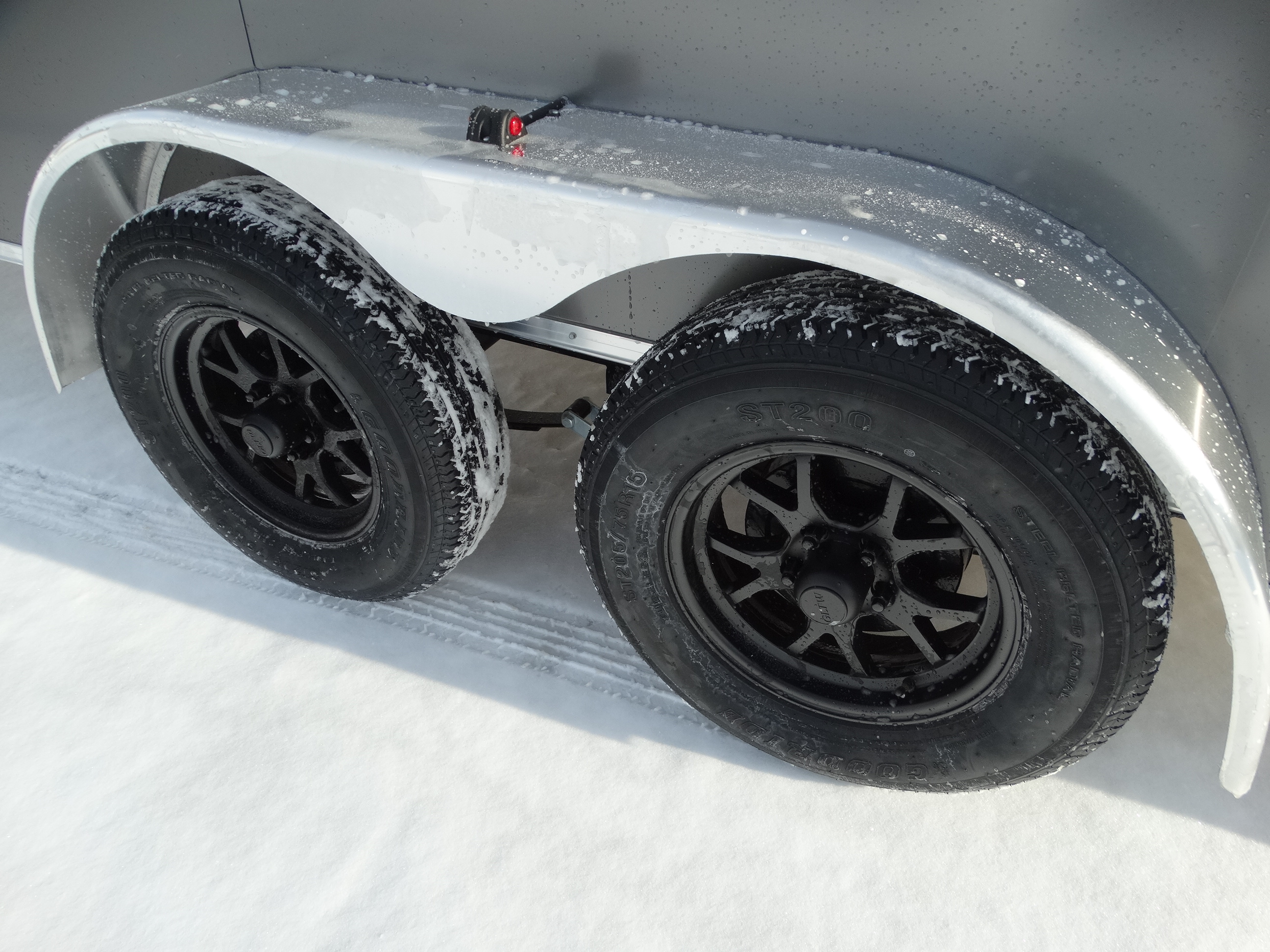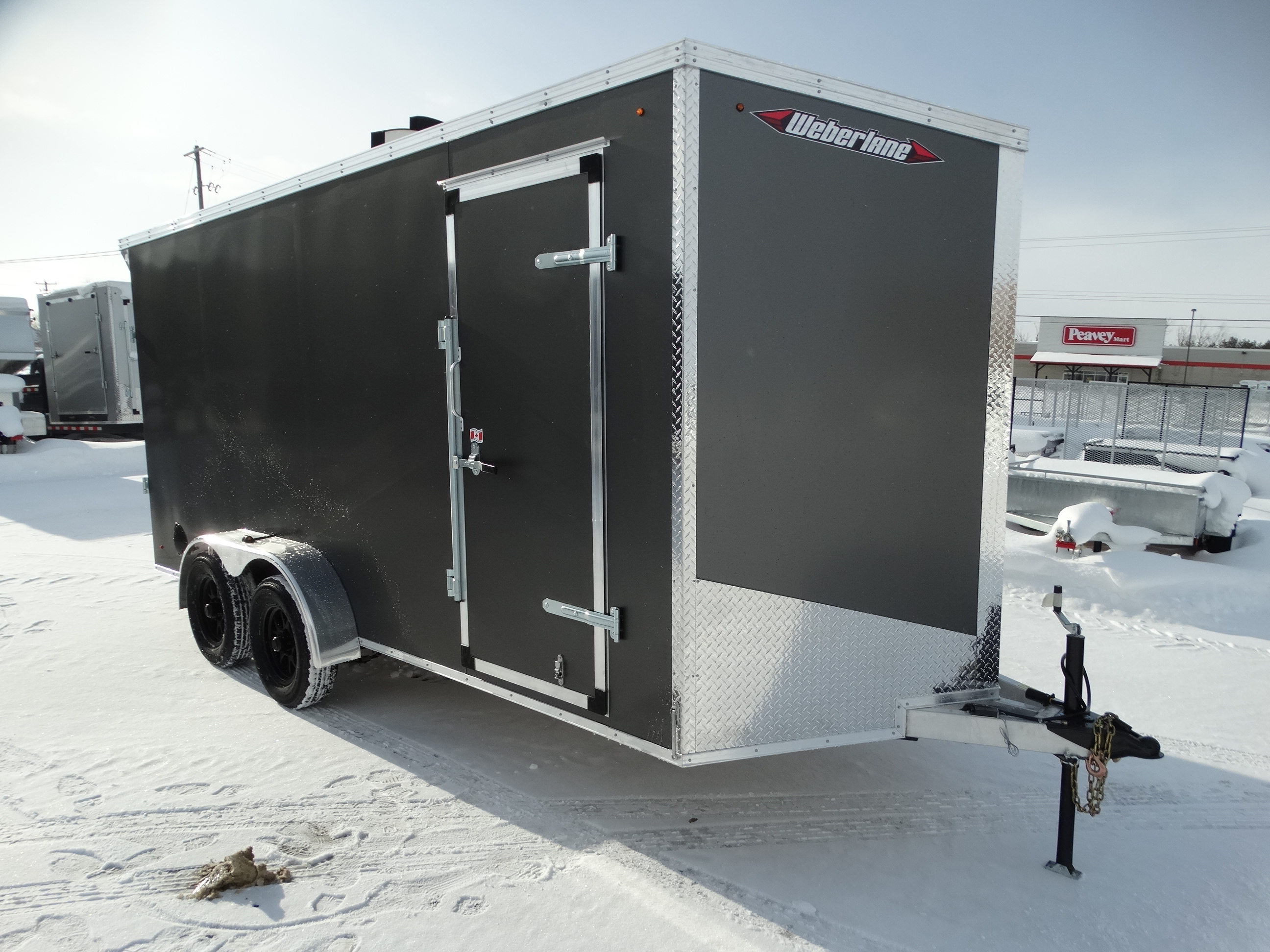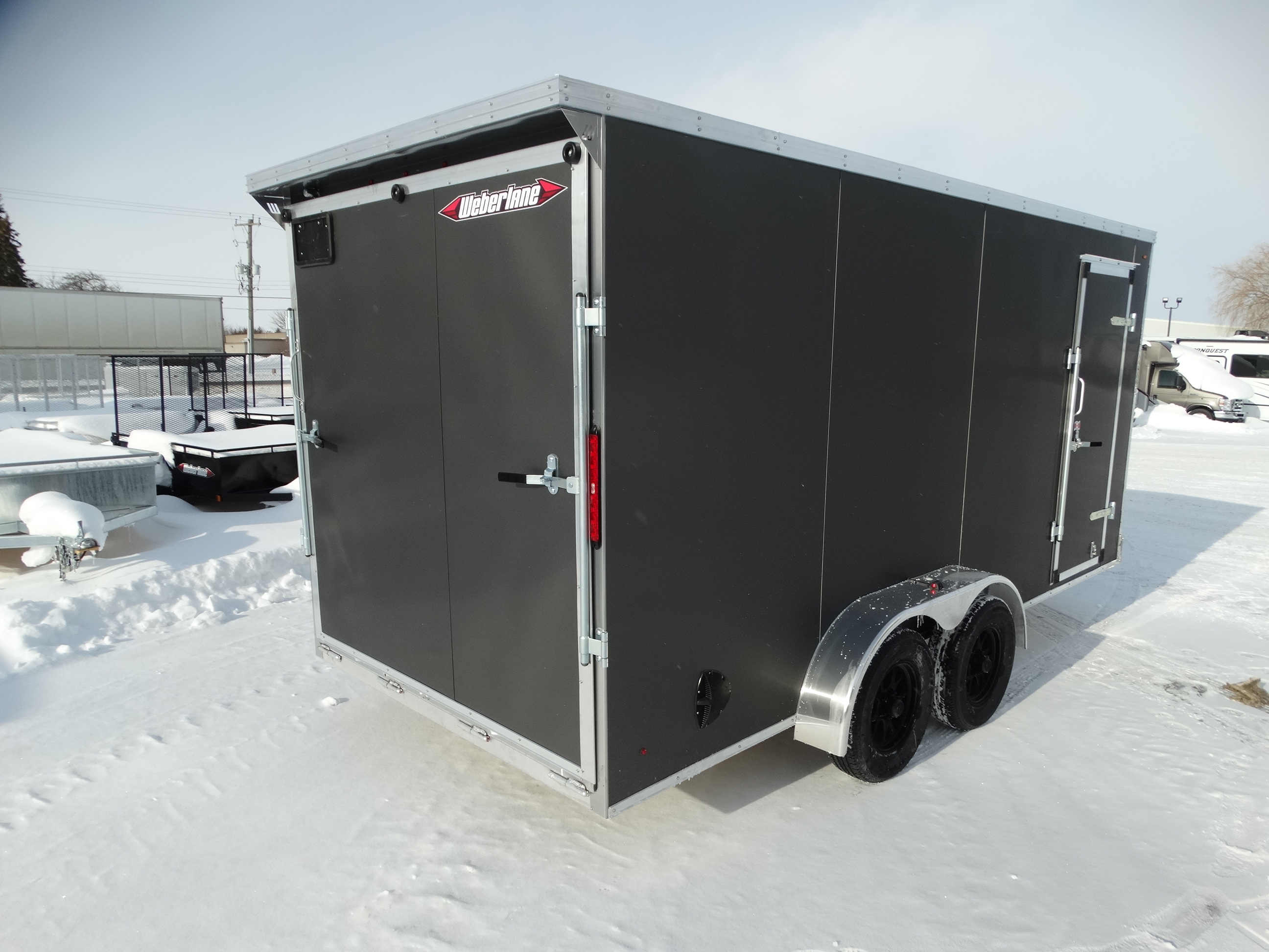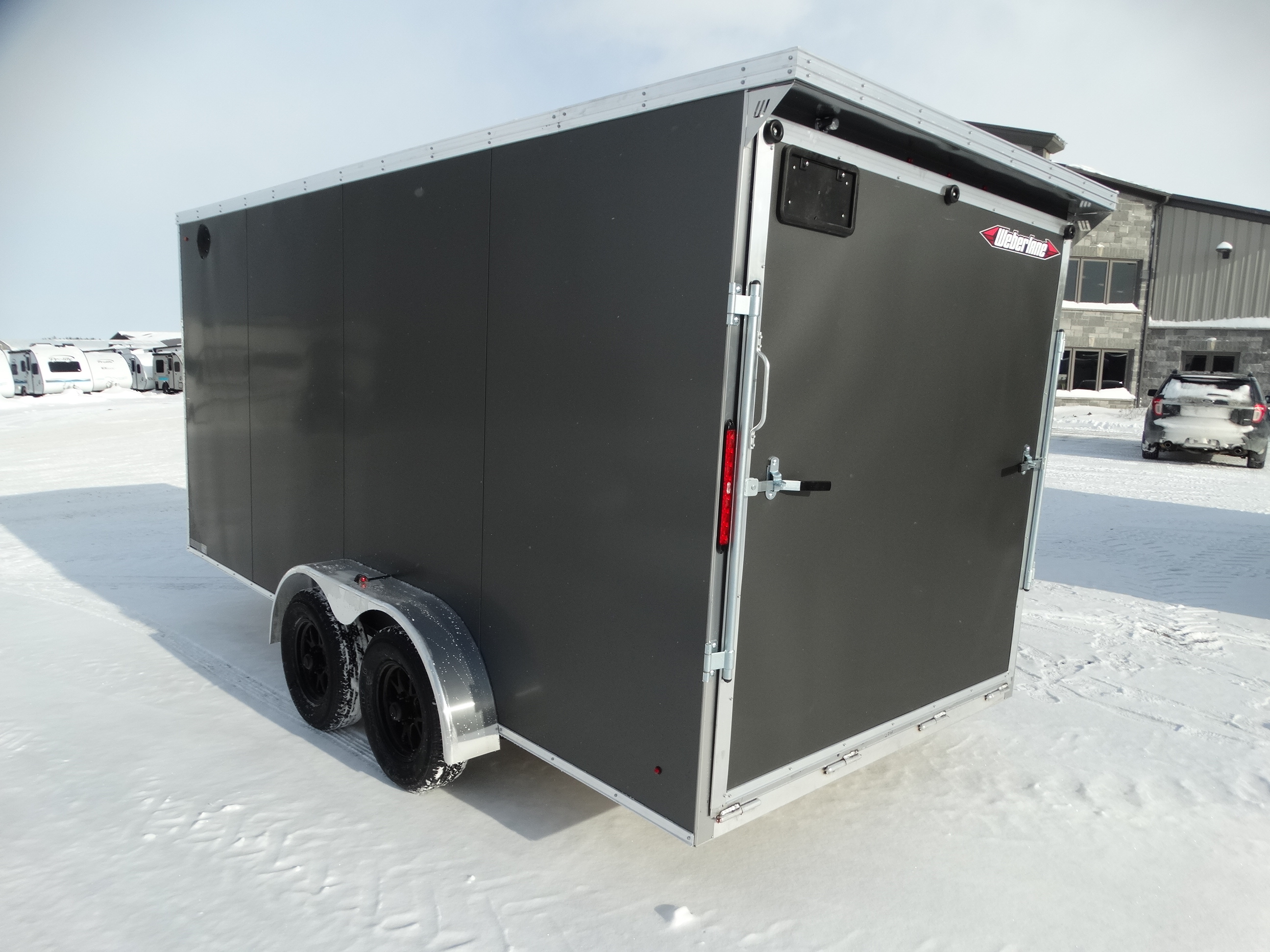 Come check out this 7x16 aluminium enclosed trailer with the sport package! This trailer has a lighter 2x4 frame to keep the cost and weight down. It is designed for your sleds, ATV's and especially side by sides, since it has the 7 ft interior height. It has tandem 3500 lb axles with electric brakes and a payload of around 4800 lbs. It has a sleek look with the rear spoiler and black aluminium rims, as well as the interior white, plastic wall lining. It comes with 4 d-rings, interior light, front jack and safety chains. Come take a look today!