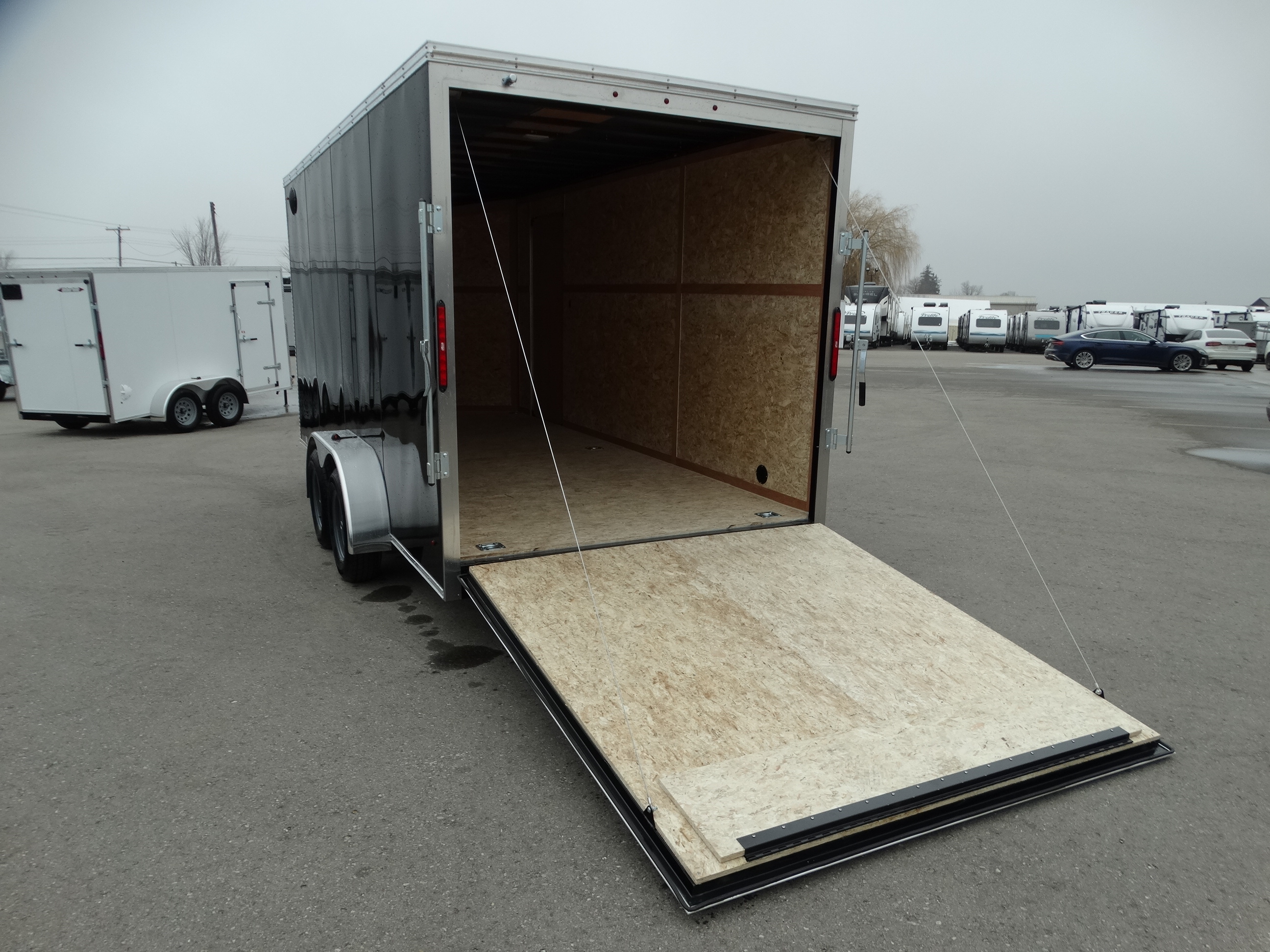 Come check out this 7x16 contractor level enclosed trailer! This trailer has tandem 3500 lb axles with electric brakes and a payload of around 4500 lbs. It has an interior height of 84'', rear ramp door, a side door, d-rings, an interior light, as well as a front jack and safety chains. Come take a look today!