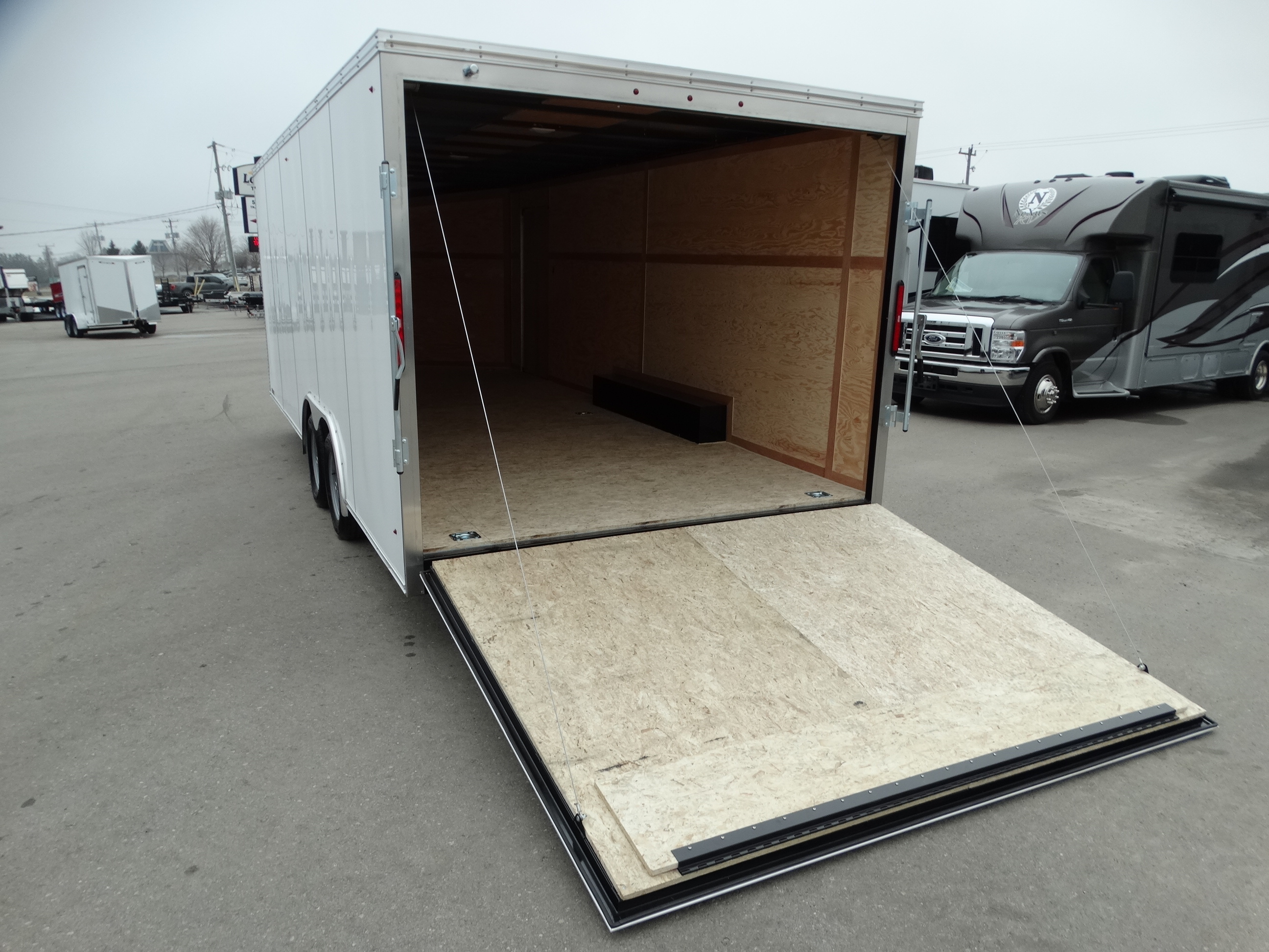 Come check out this 8.5 x 20 enclosed trailer. This trailer has tandem 3500 lb axles with electric brakes and a payload of around 3800 lbs. It has an interior height of 78'', a rear ramp gate, d-rings, upgraded 3/8'' plywood wall lining, a front jack and safety chains. Come take a look today!