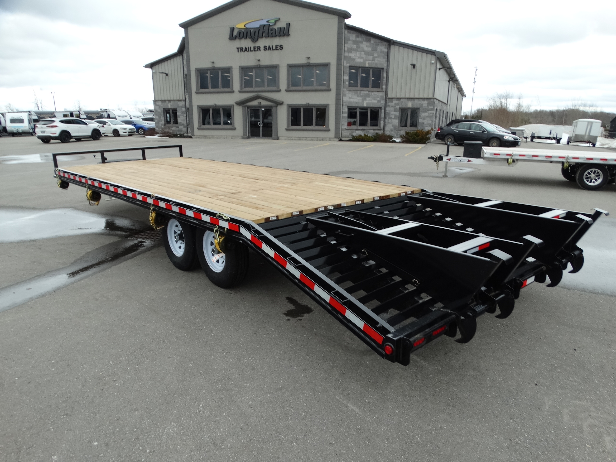 Come check out this 8 1/2 x 20' trailer with a 5' beavertail. This trailer has tandem 7000 lb axles with electric brakes and a payload of over 10,600 lbs. It has rear fold over ramps, LED lights, front tongue box, ratchet rail with straps, front jack and safety chains. Come take a look today!