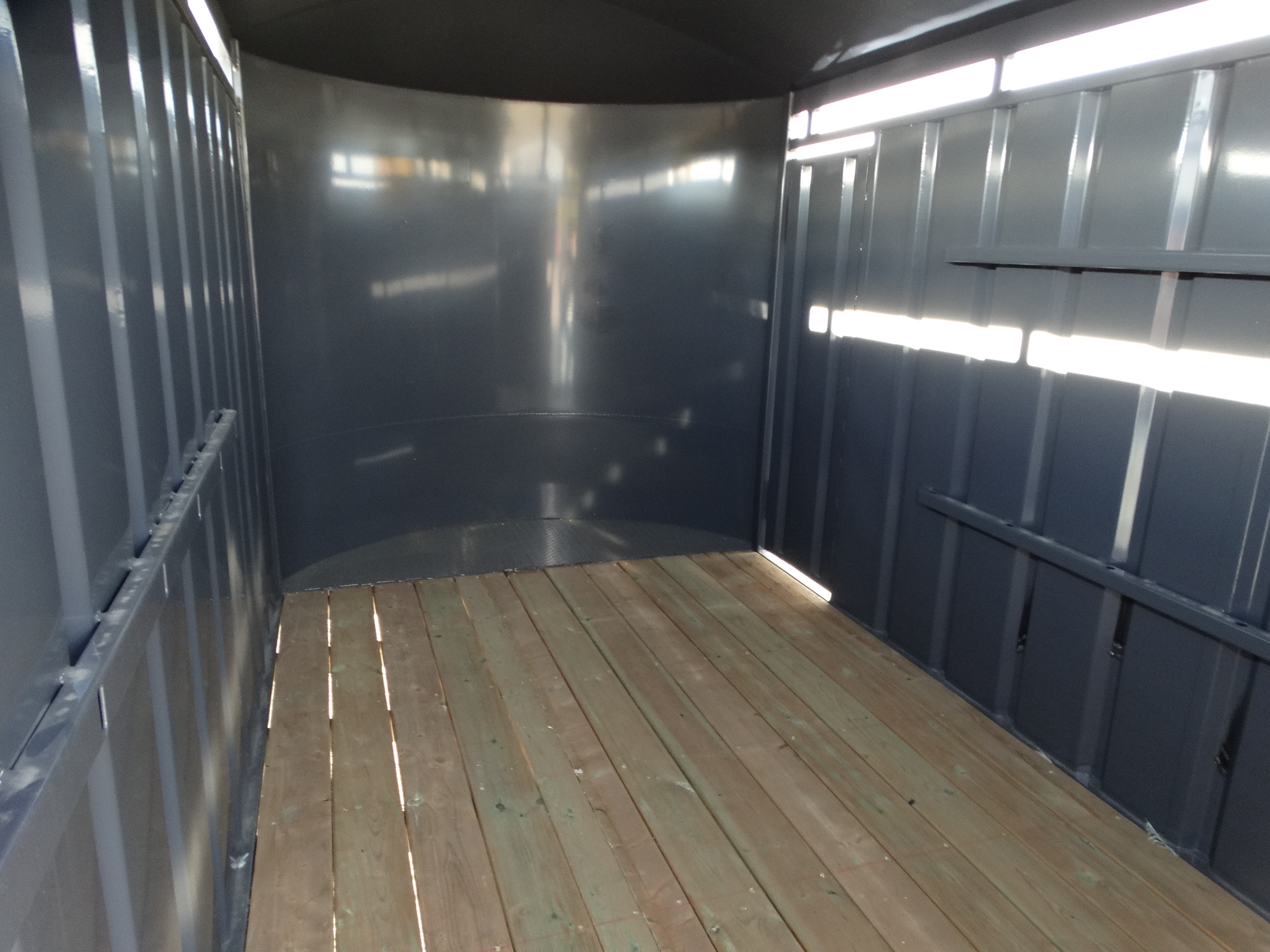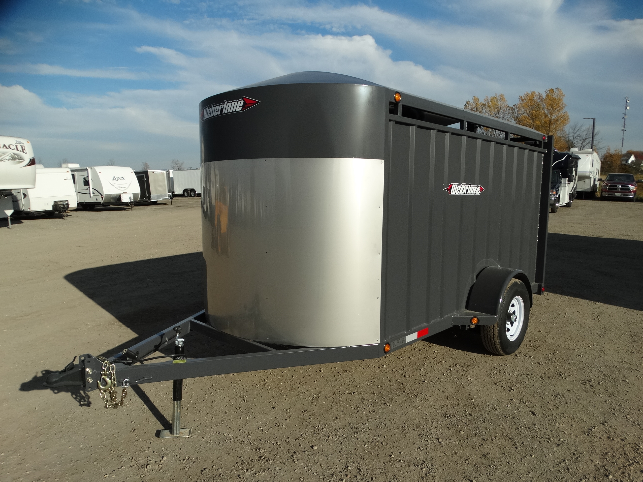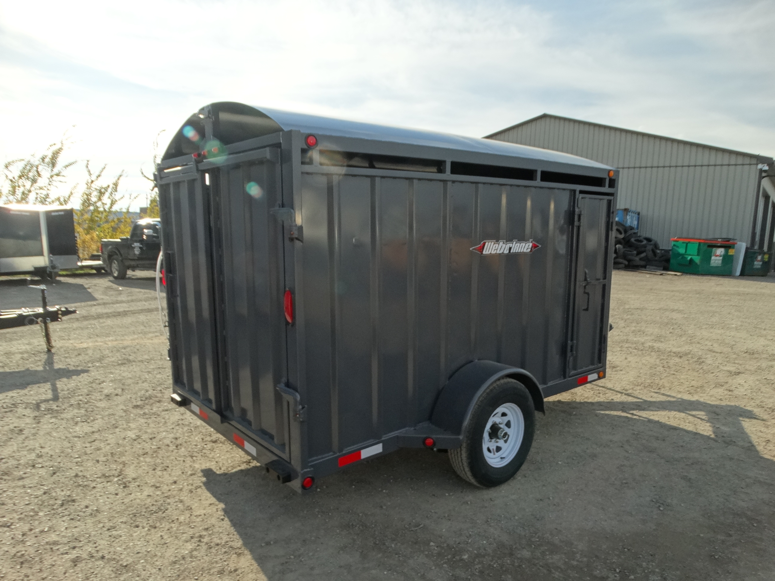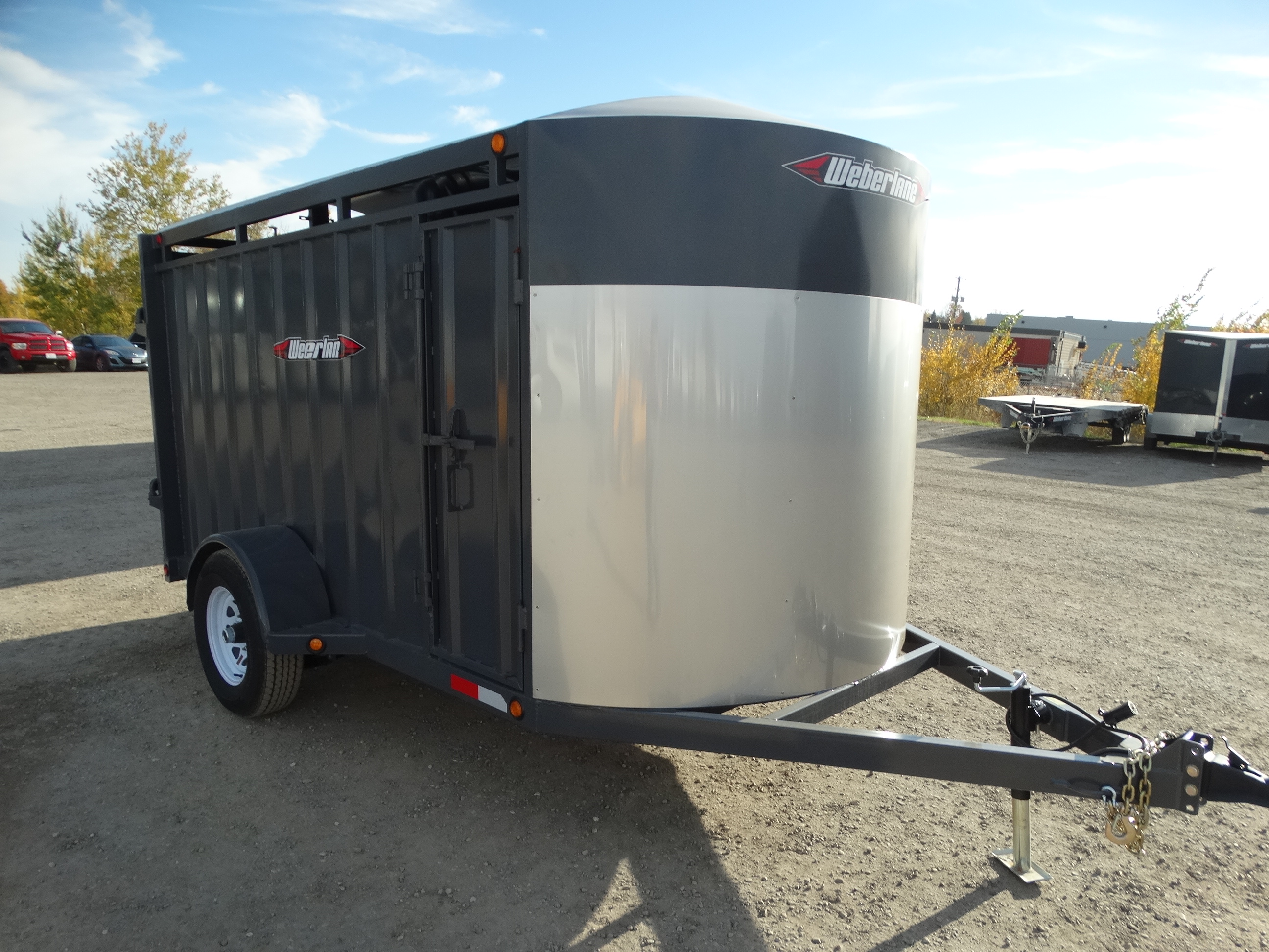 Come take a look at this 12' livestock trailer! This trailer has a single 5200 lb axle with electric brakes and a payload of around 3000 lbs. It has a rear sliding/swing gate, side door, front stone guard, jack and safety chains. Come check it out today!