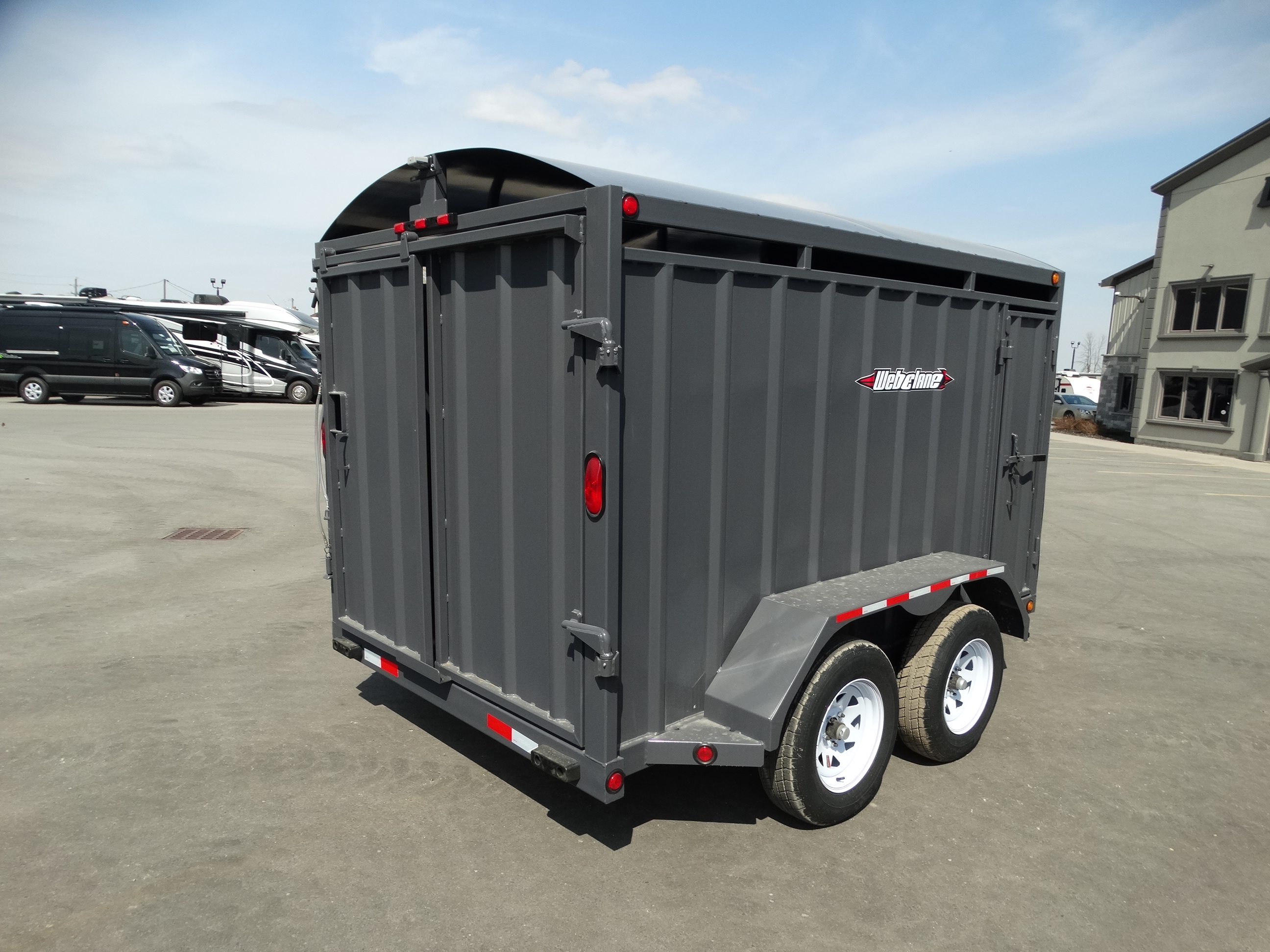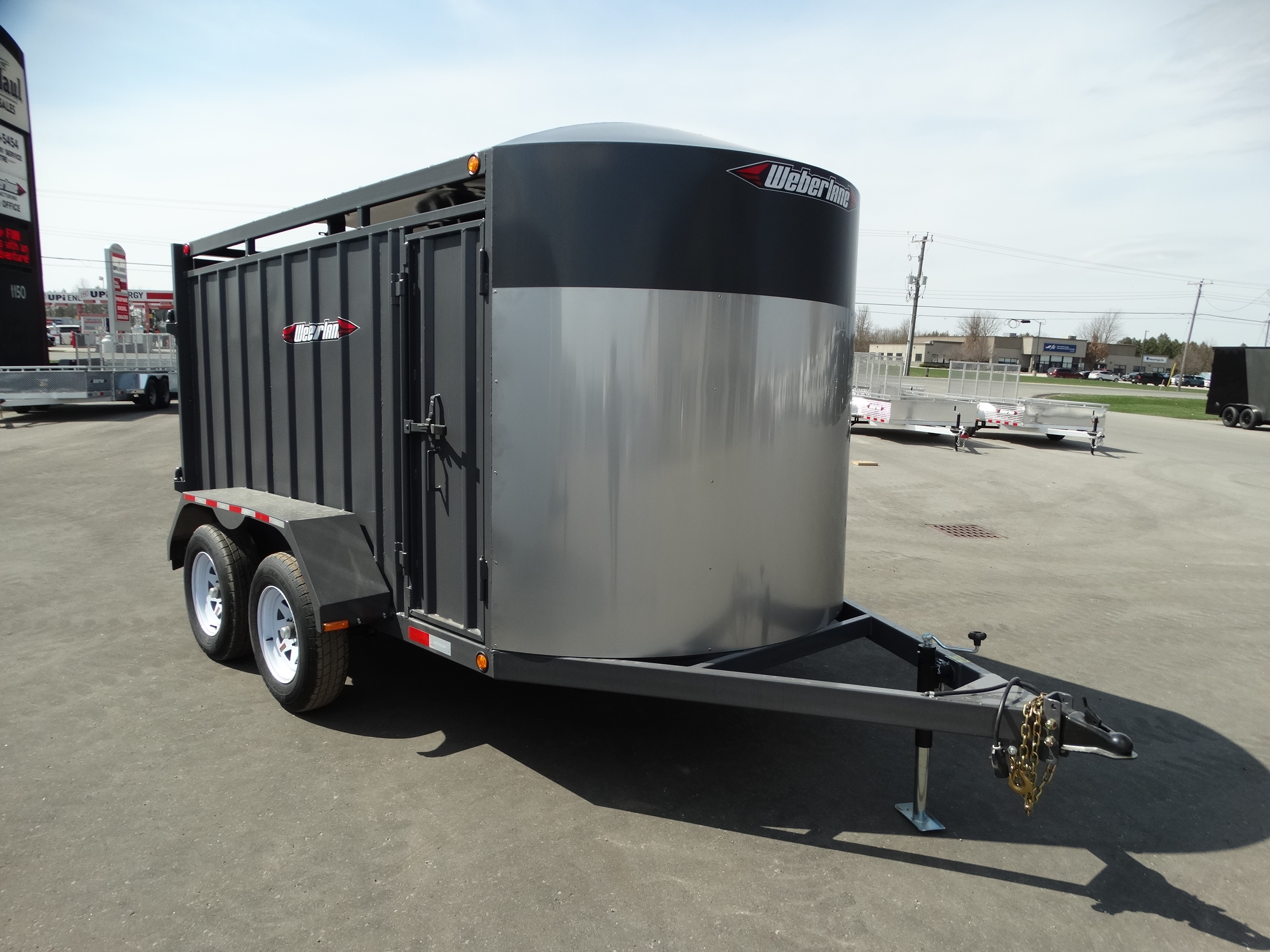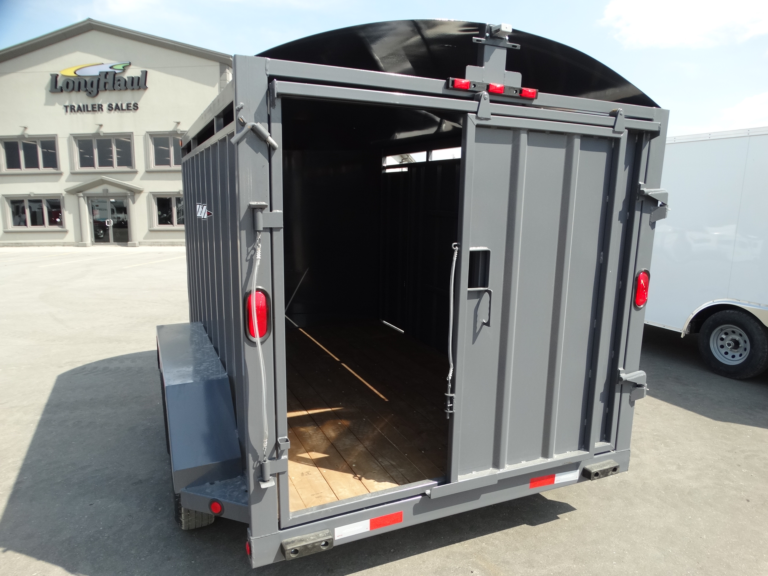 Come take a look at this 12' livestock trailer! This trailer has tandem 3500 lb torsion axles with electric brakes and a payload of around 4500 lbs. It has a rear sliding/swing gate, side door, front stone guard, jack and safety chains. Come check it out today!