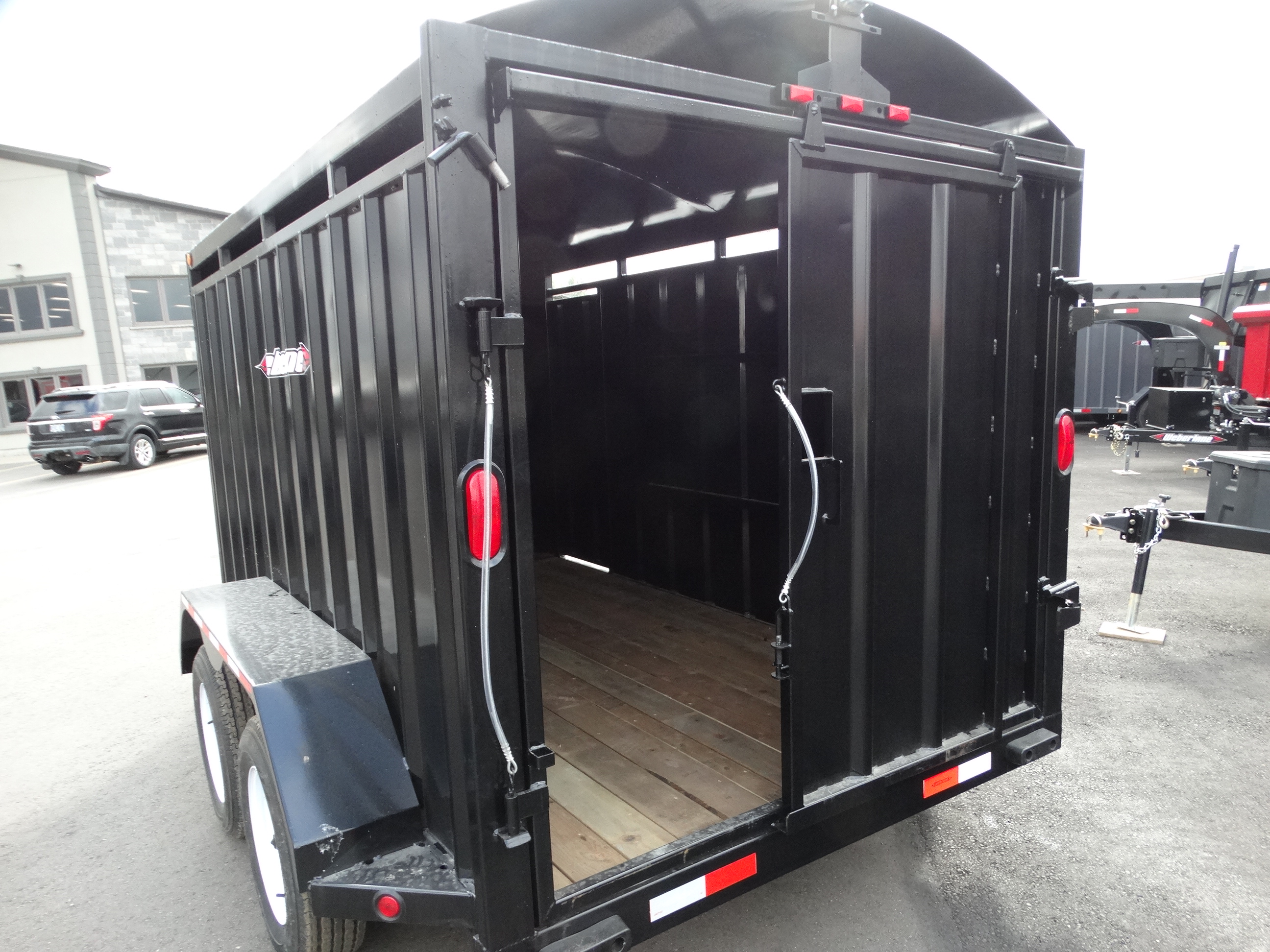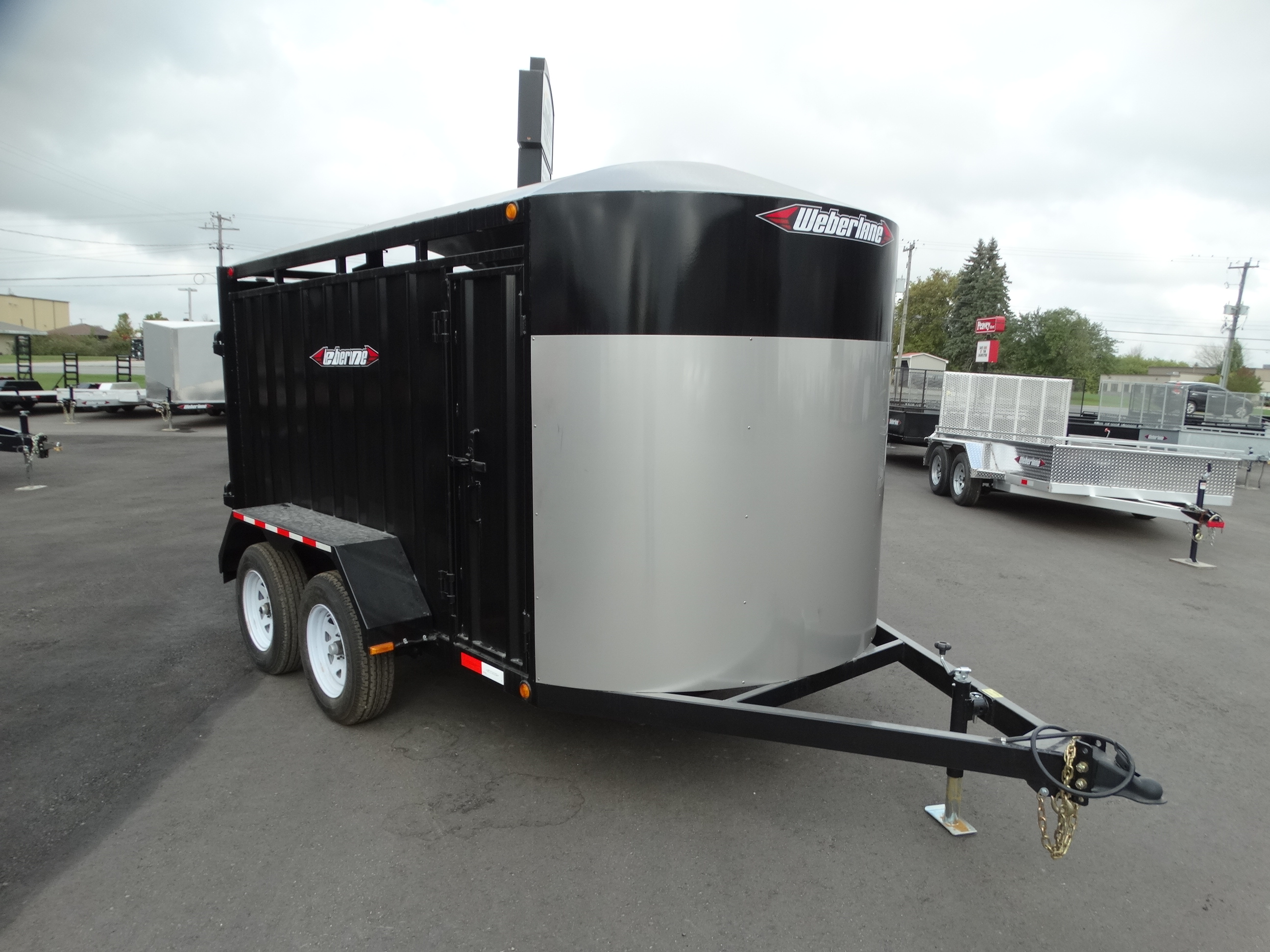 Come take a look at this 12' livestock trailer! This trailer has tandem 3500 lb torsion axles with electric brakes and a payload of around 4500 lbs. It has a rear sliding/swing gate, side door, front stone guard, jack and safety chains. Come check it out today!